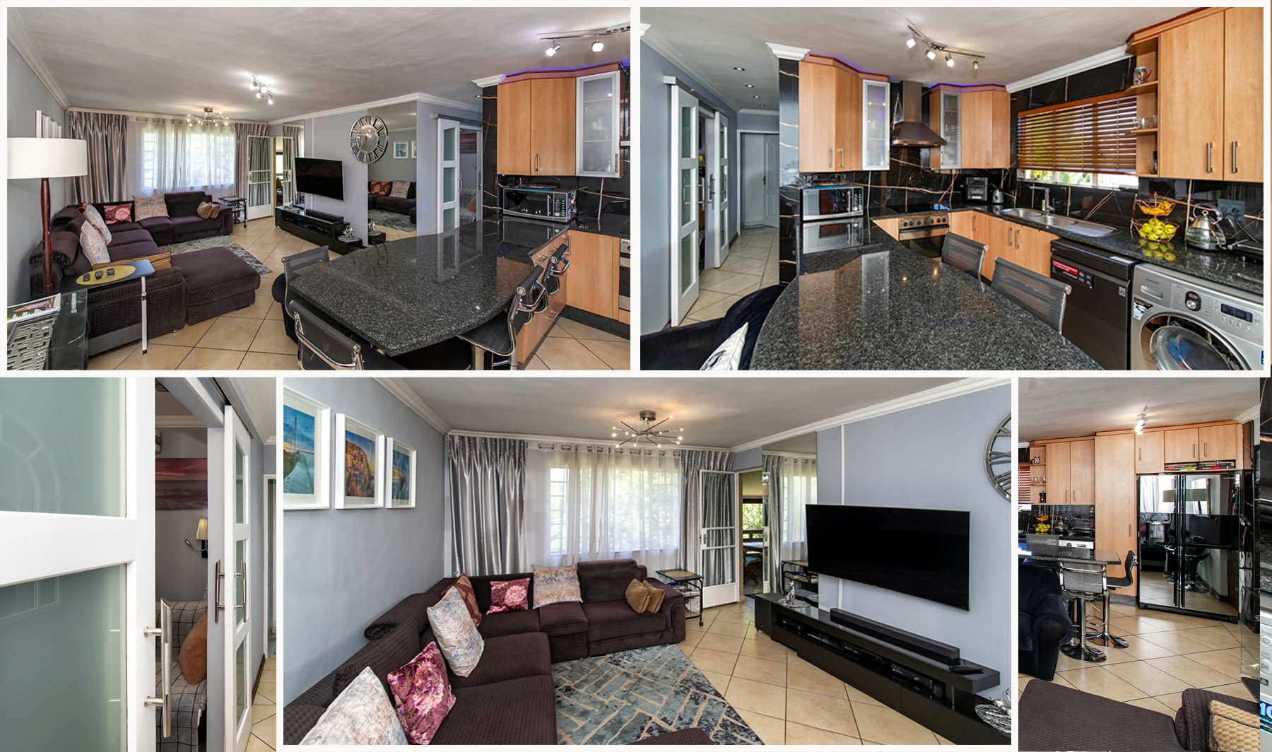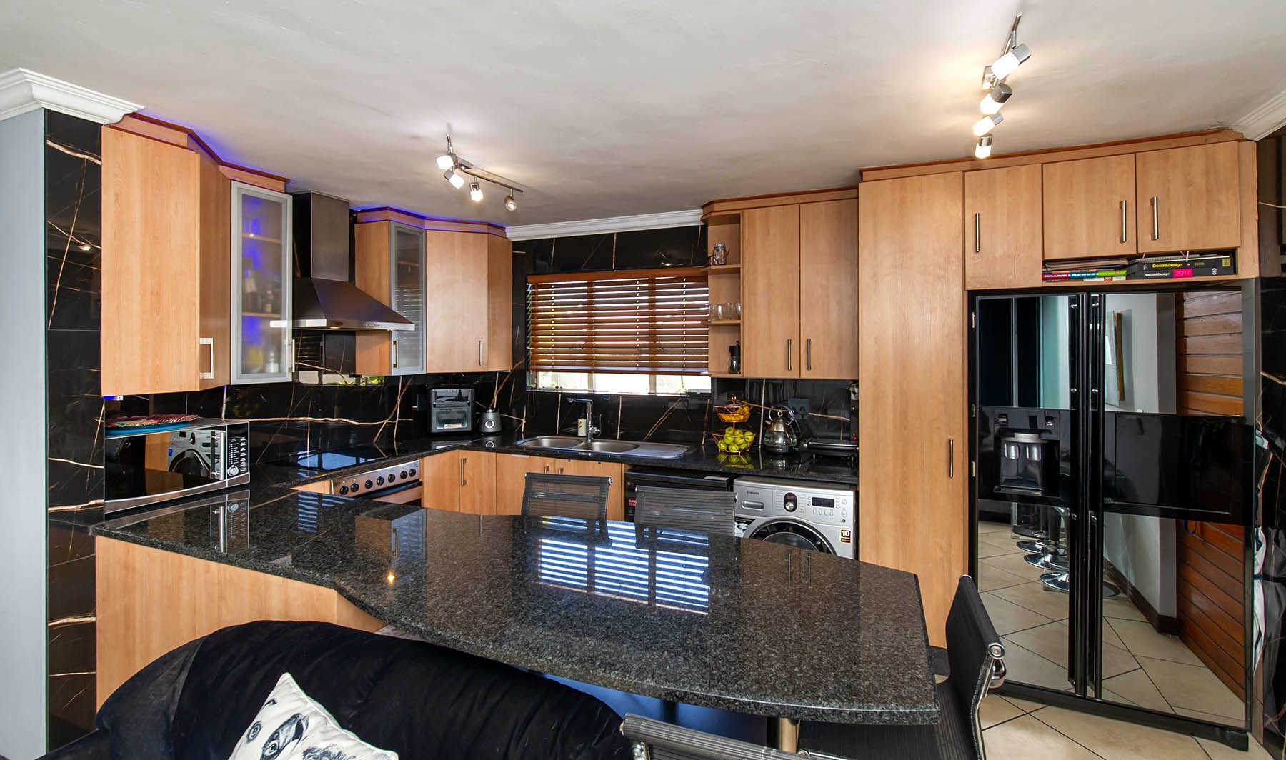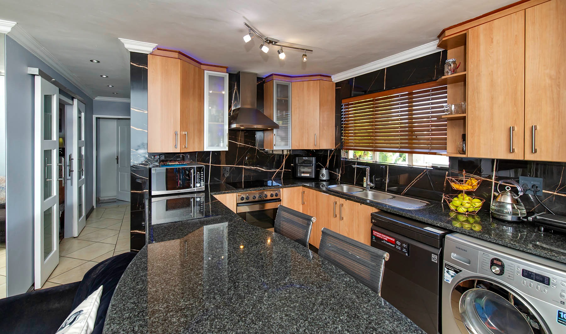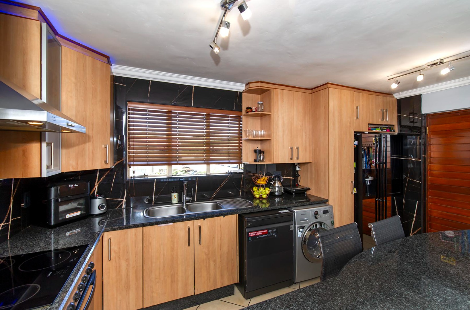 A well designed kitchen offers ample cupboard space, granite counter tops, space for under counter appliances and a double door fridge.