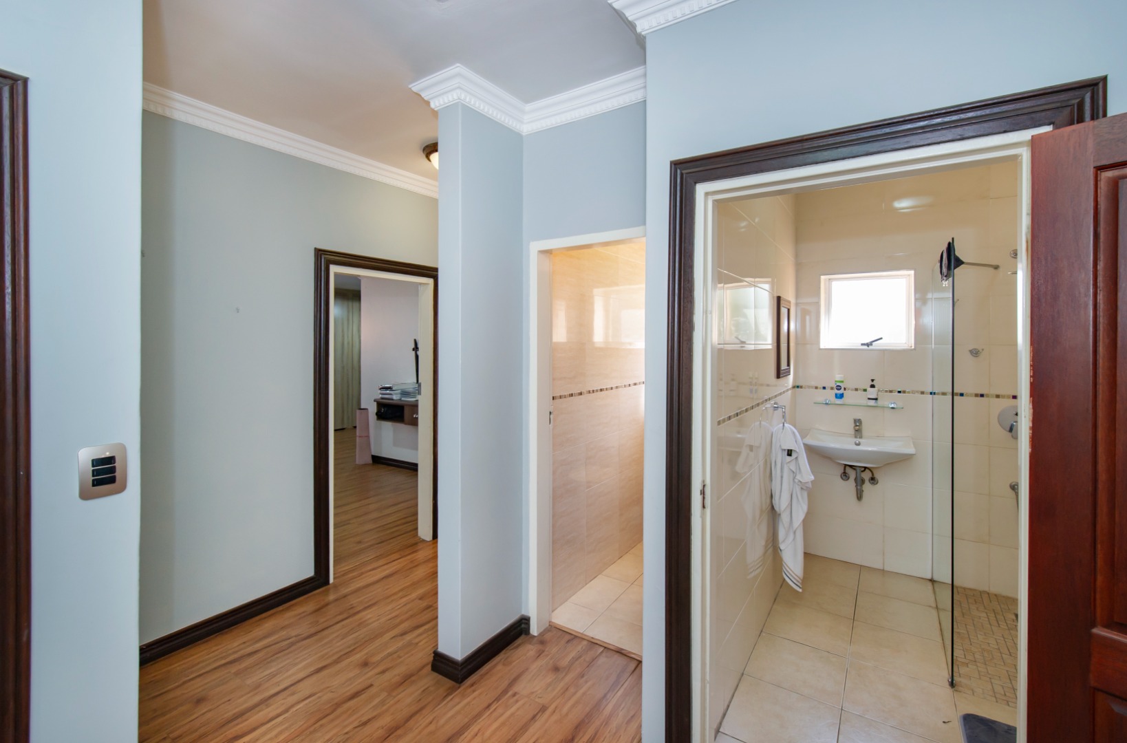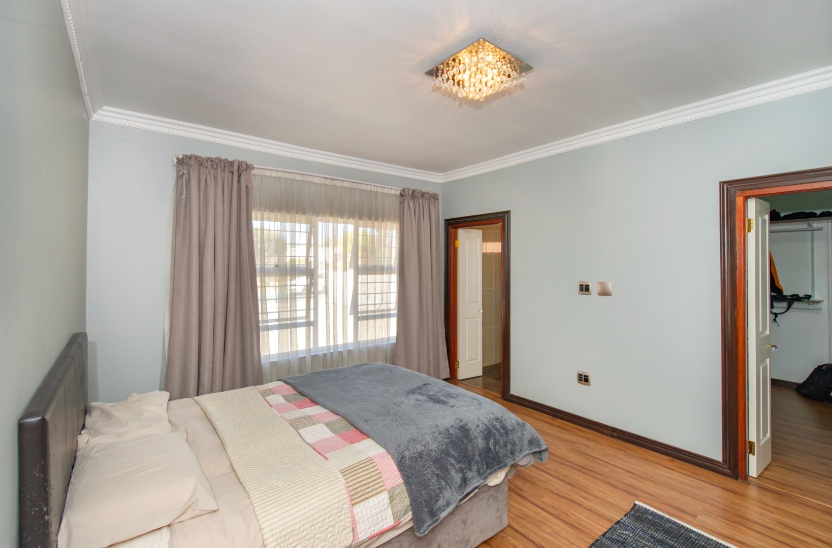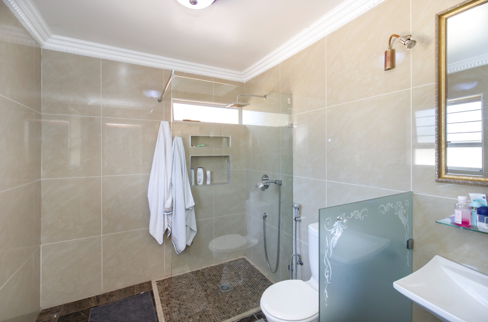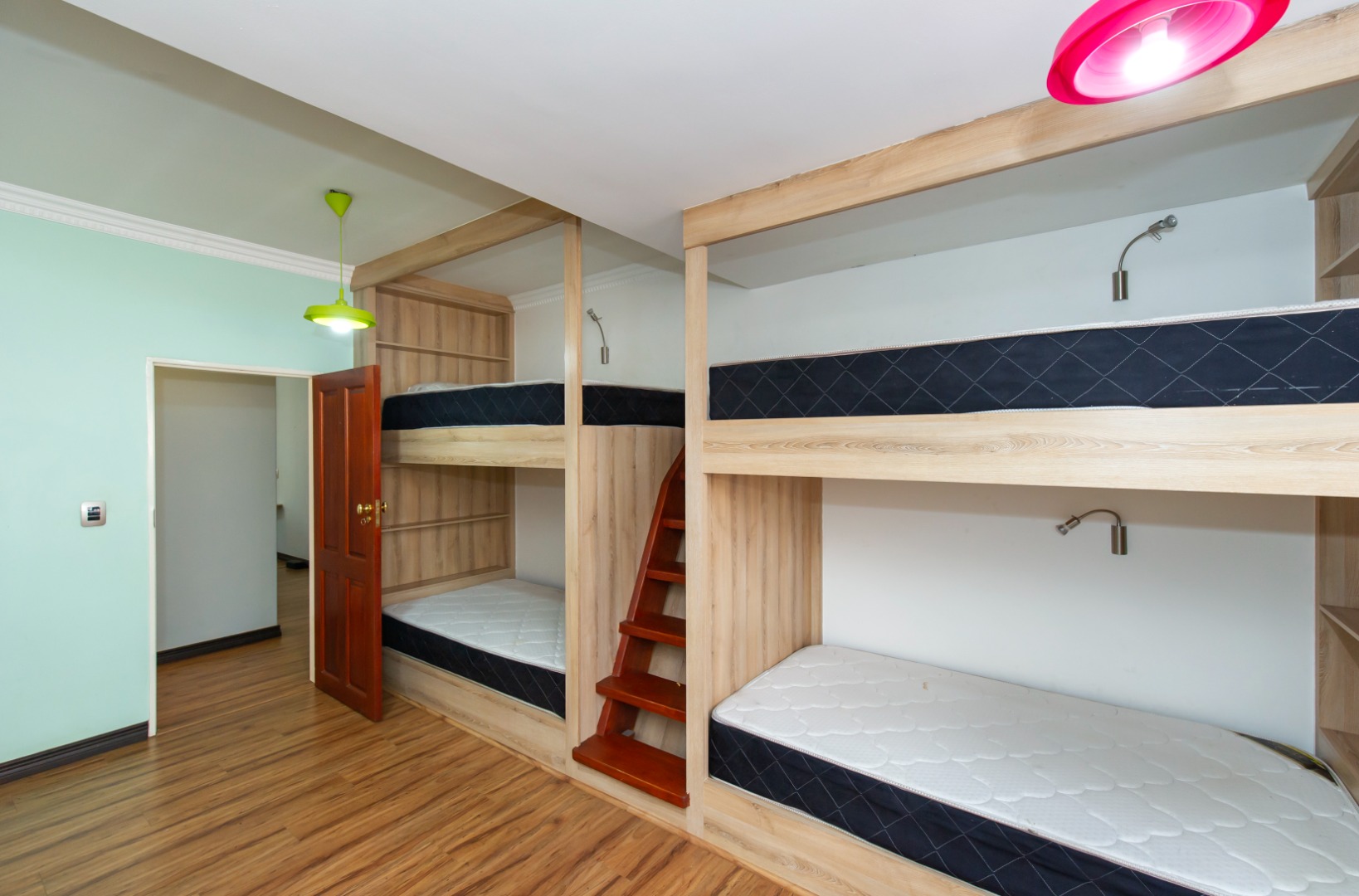 Down the passage find 3 extra large bedrooms and 3 bathrooms (2 en suite). The Master suite includes a walk in cupboard and an en suite bathroom. The second bedroom has 4 fitted bunk beds with loads of cupboard space and study nook area. The third bedroom is also en-suite and has doors that open onto the garden area