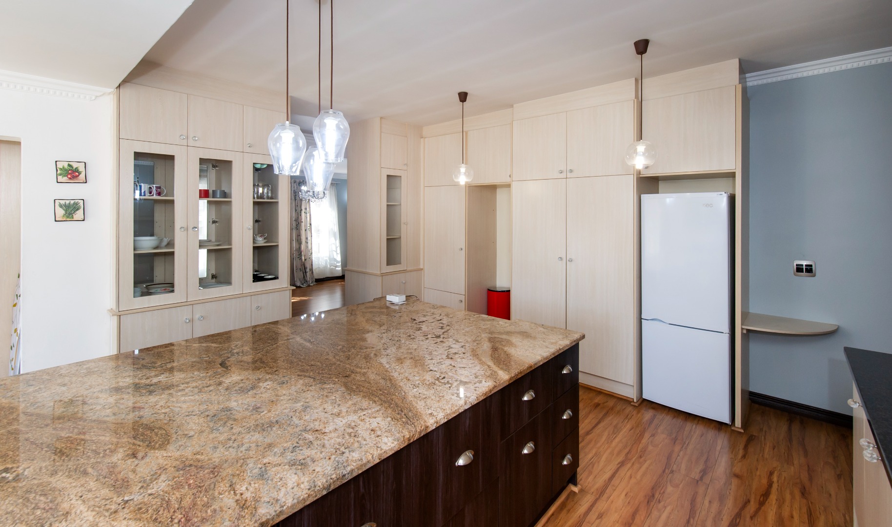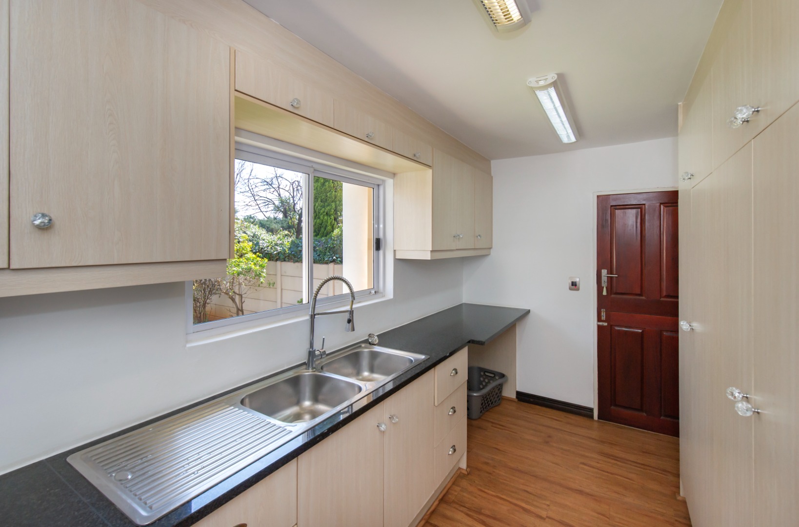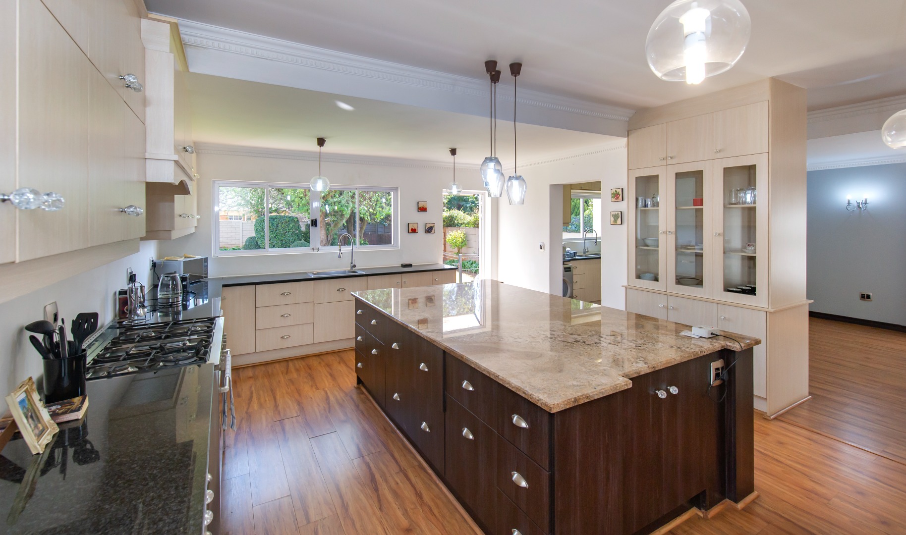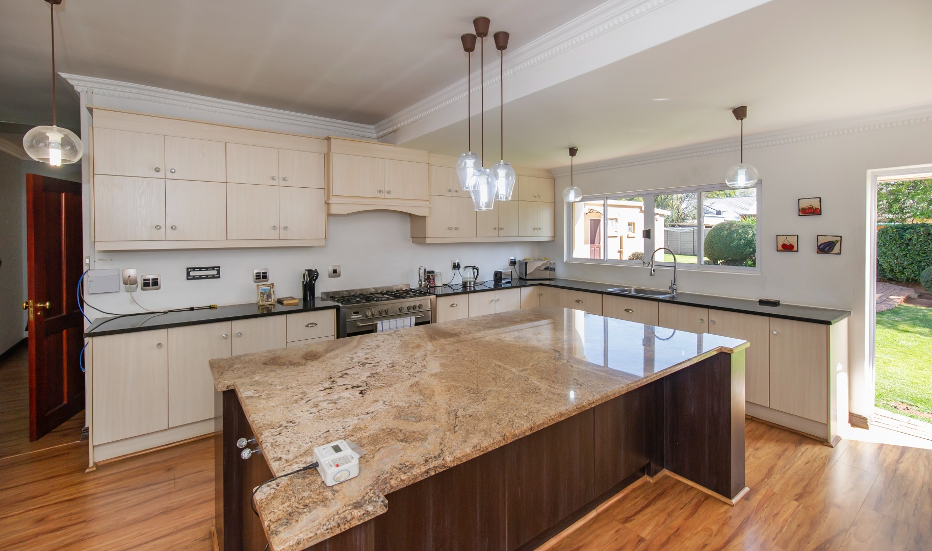 The Dining room leads into a separate Chefs style kitchen. Definitely the WOW factor of the home as it boasts a larger than normal granite centre Island, ideal for prepping and suitable for those in the catering industry . There is ample cupboard space as well as display cabinets, space for a fridge and freezer and includes a stunning gas hob. There is a separate scullery to accommodate 3 appliances
