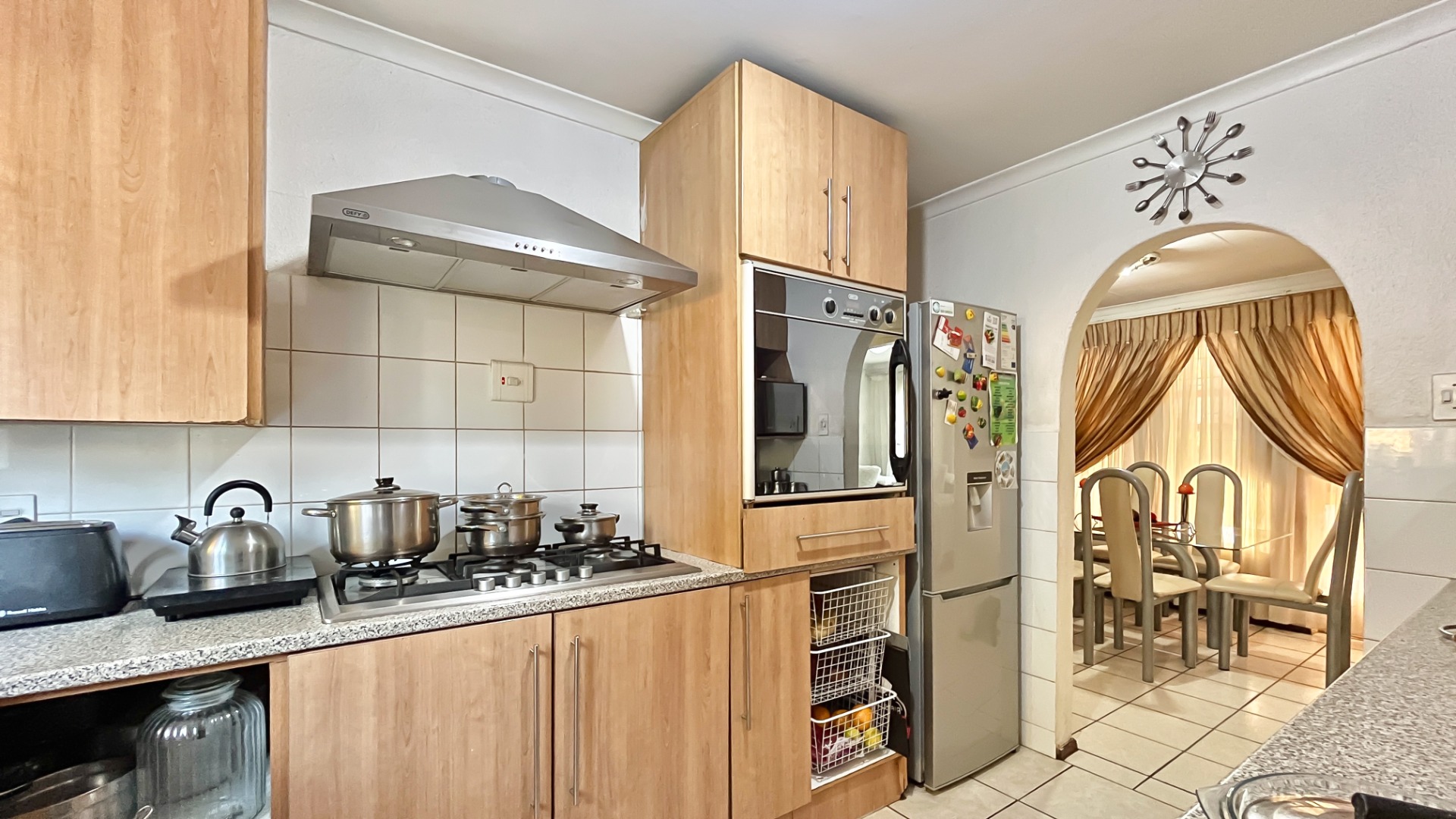 This lovely home in Illiondale, Edendale features a generous lounge and dining area, ideal for relaxed living and gatherings. The kitchen is equipped with a gas stove, adding a practical touch for everyday cooking.