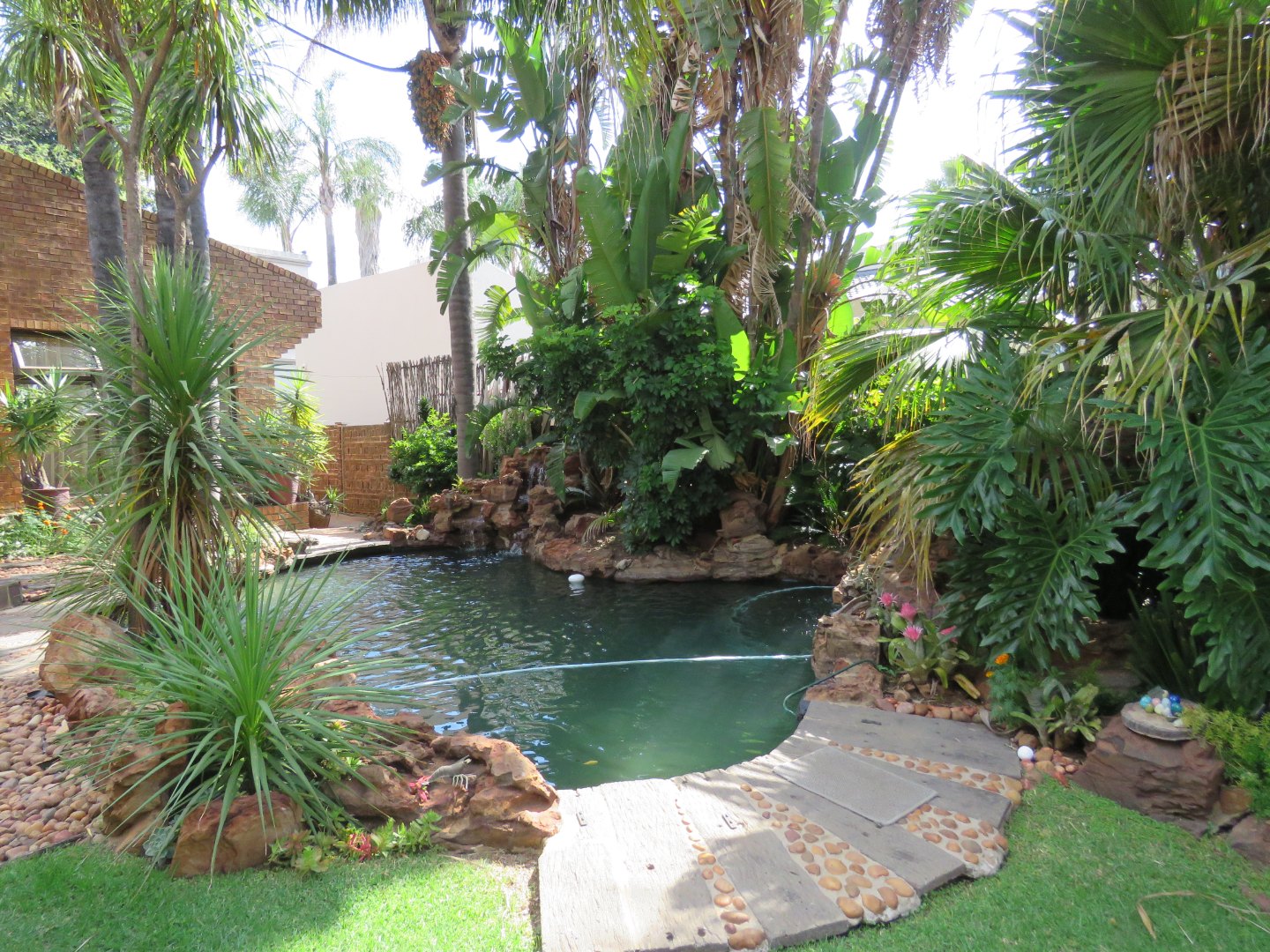 Outdoor living is enhanced by a private patio, a refreshing swimming pool, and a well-kept garden, perfect for relaxation and entertaining. Additional features include a built-in braai, a Wendy house for extra storage, and generous parking with three garages and two additional parking spaces. Pets are allowed, making it ideal for animal lovers.