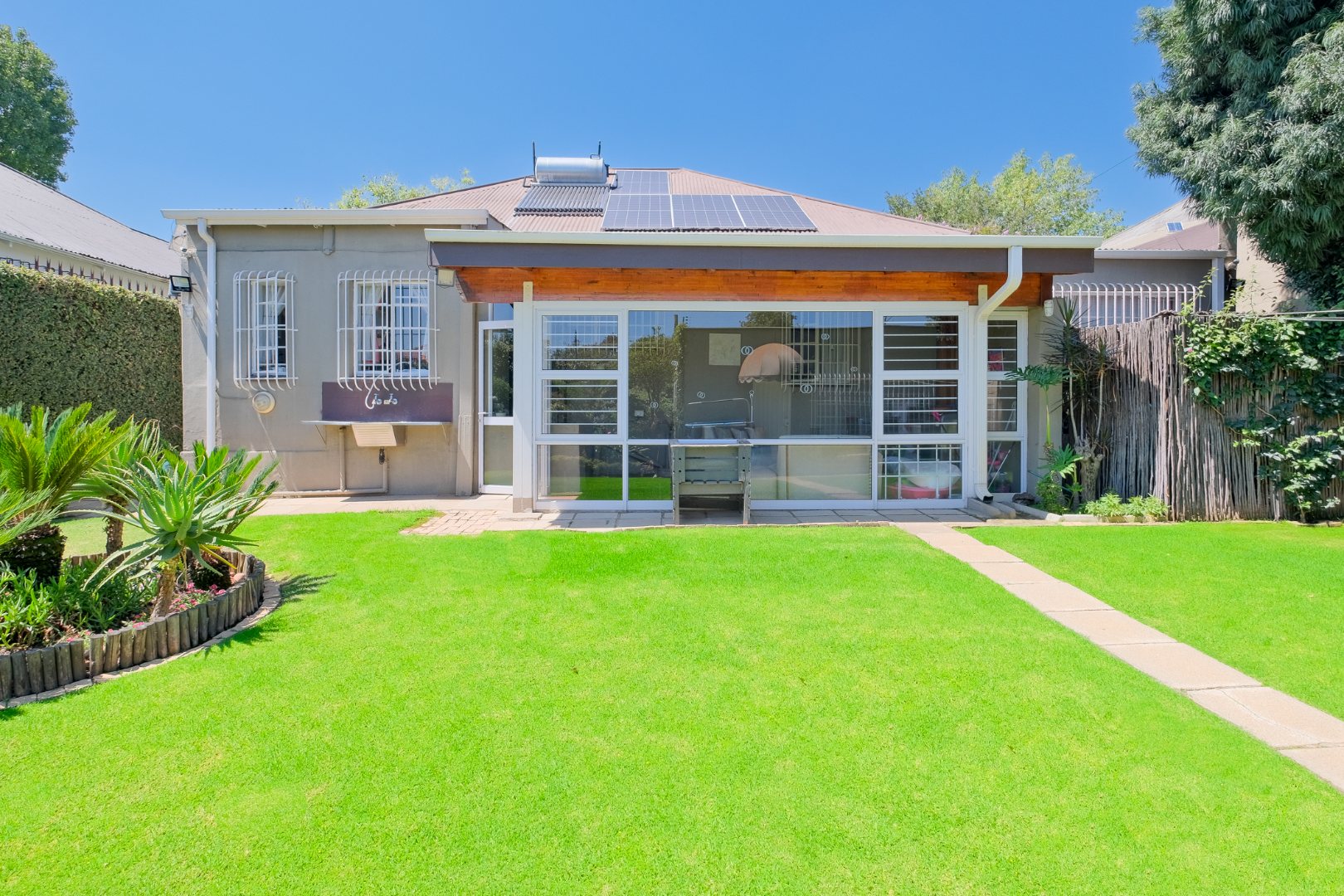 The property sits on a generous 495 sqm erf, boasting a well-maintained garden complete with an irrigation system, perfect for outdoor enjoyment. Extensive paving enhances the exterior, offering low maintenance and practical access. Pets are permitted, making this an ideal home for families.