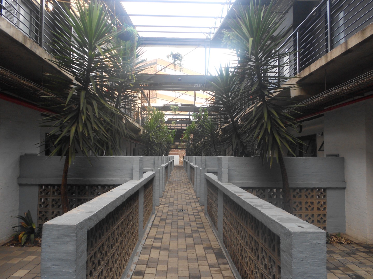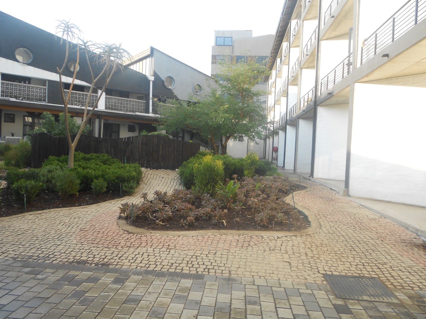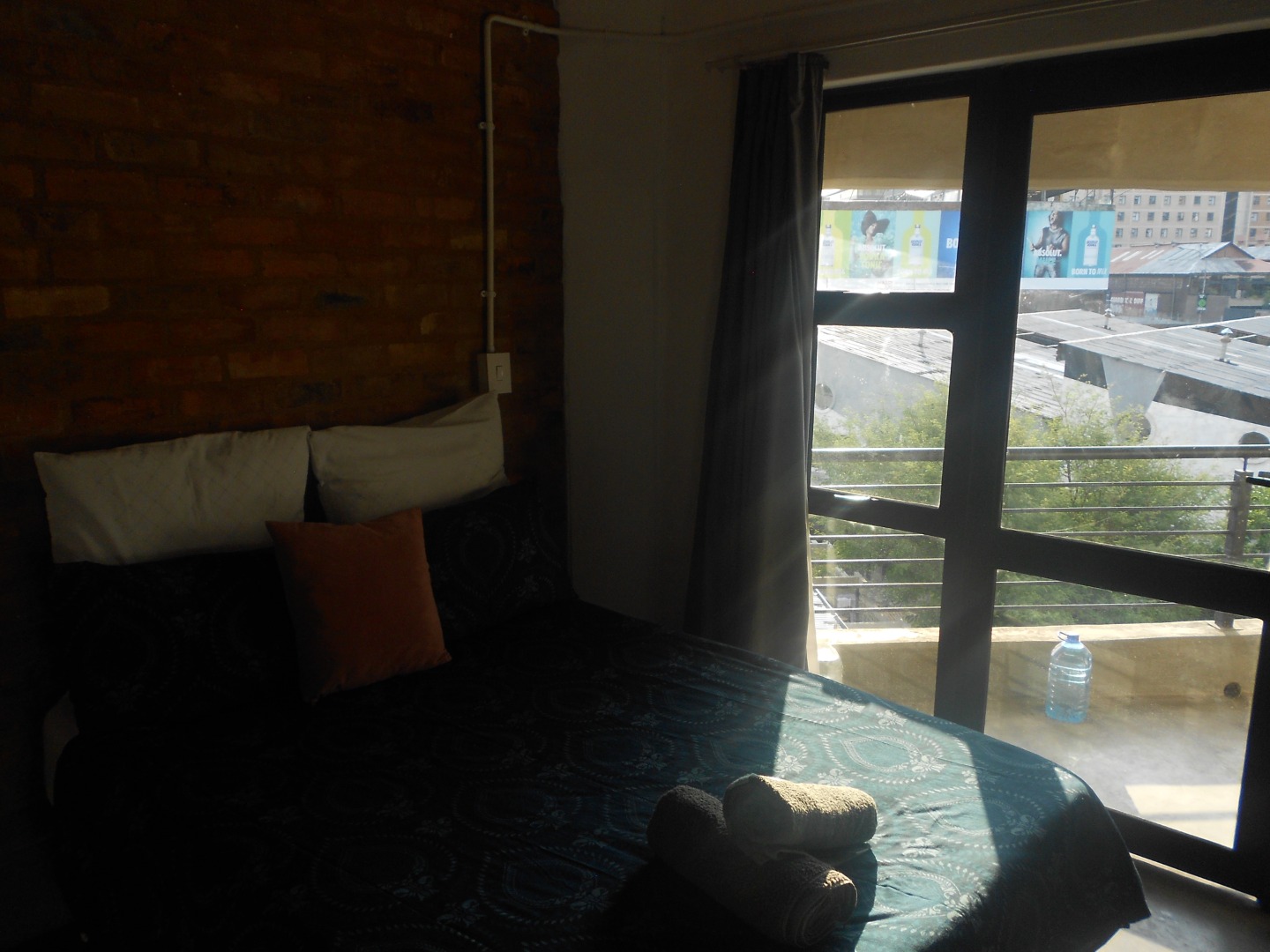 Experience vibrant metropolitan living in this modern studio apartment located in Maboneng, Johannesburg. This 23sqm unit offers a functional living and sleeping area, complemented by an exposed brick accent wall and a clean white wardrobe. The compact kitchenette features modern appliances, a dining area, and a well-appointed bathroom. Residents benefit from communal amenities including landscaped courtyards, paved pathways, and a small swimming pool. The property showcases a distinct architectural design with circular windows, enhanced by 24-hour security, CCTV, and a dedicated security post for ultimate peace of mind.