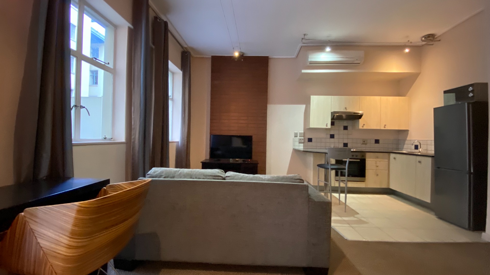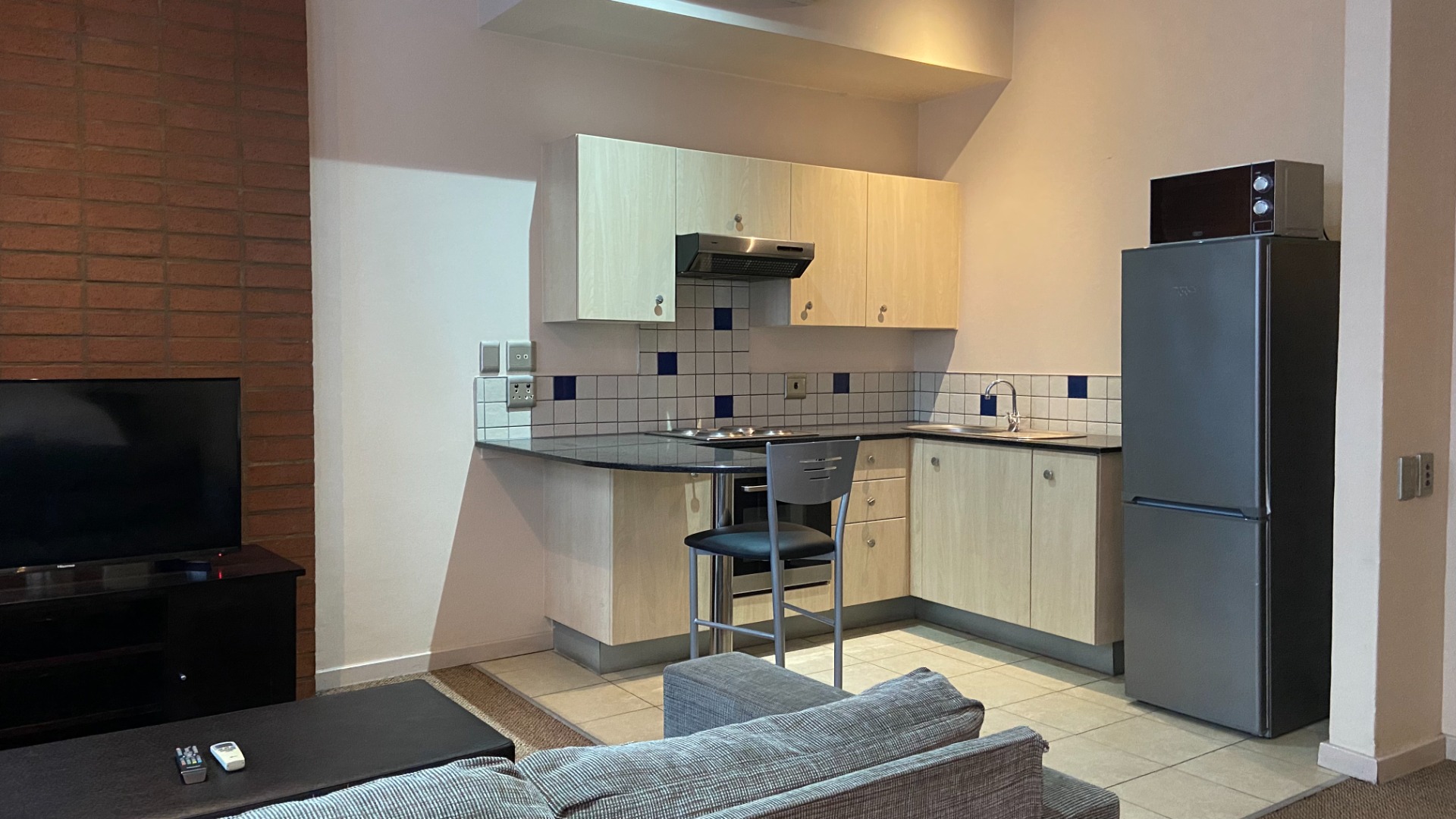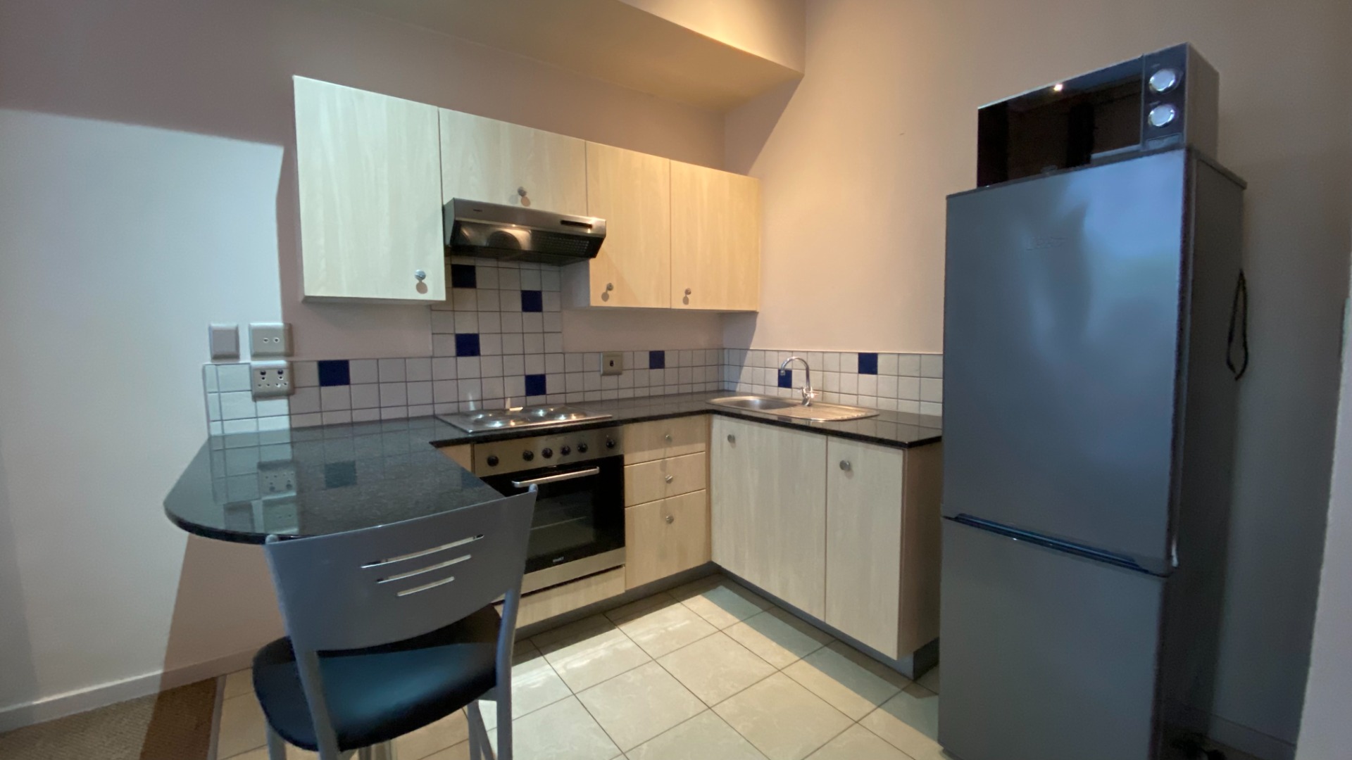 Tiled kitchen area with wooden cupboards, granite tops, extractor fan, splashback and breakfast bar. Open-plan to big lounge and then to a good size bedroom area. Bathroom has a shower and bath, as well as a dressing area.