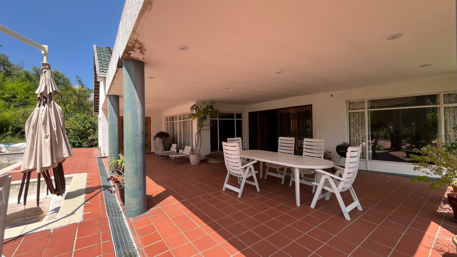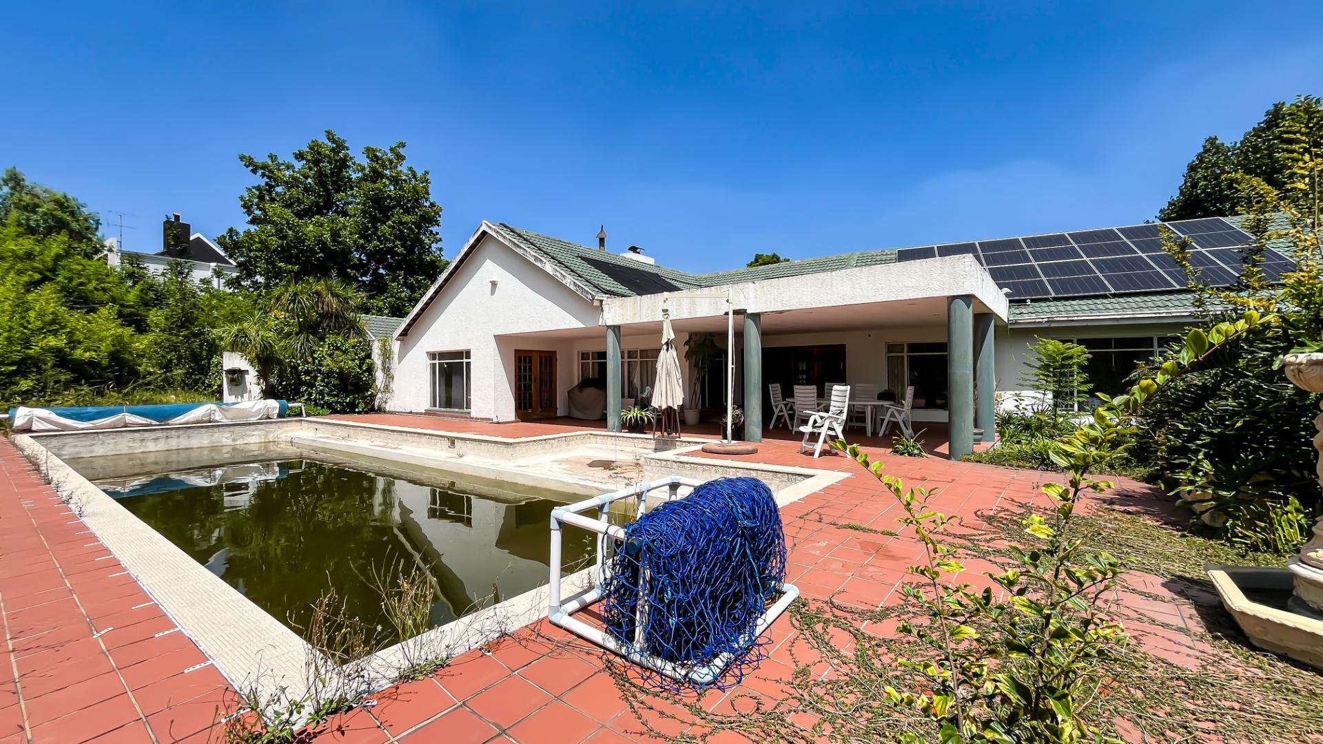 Outdoor features include a covered patio overlooking the pool, creating a relaxed entertainment space surrounded by the property's established garden.