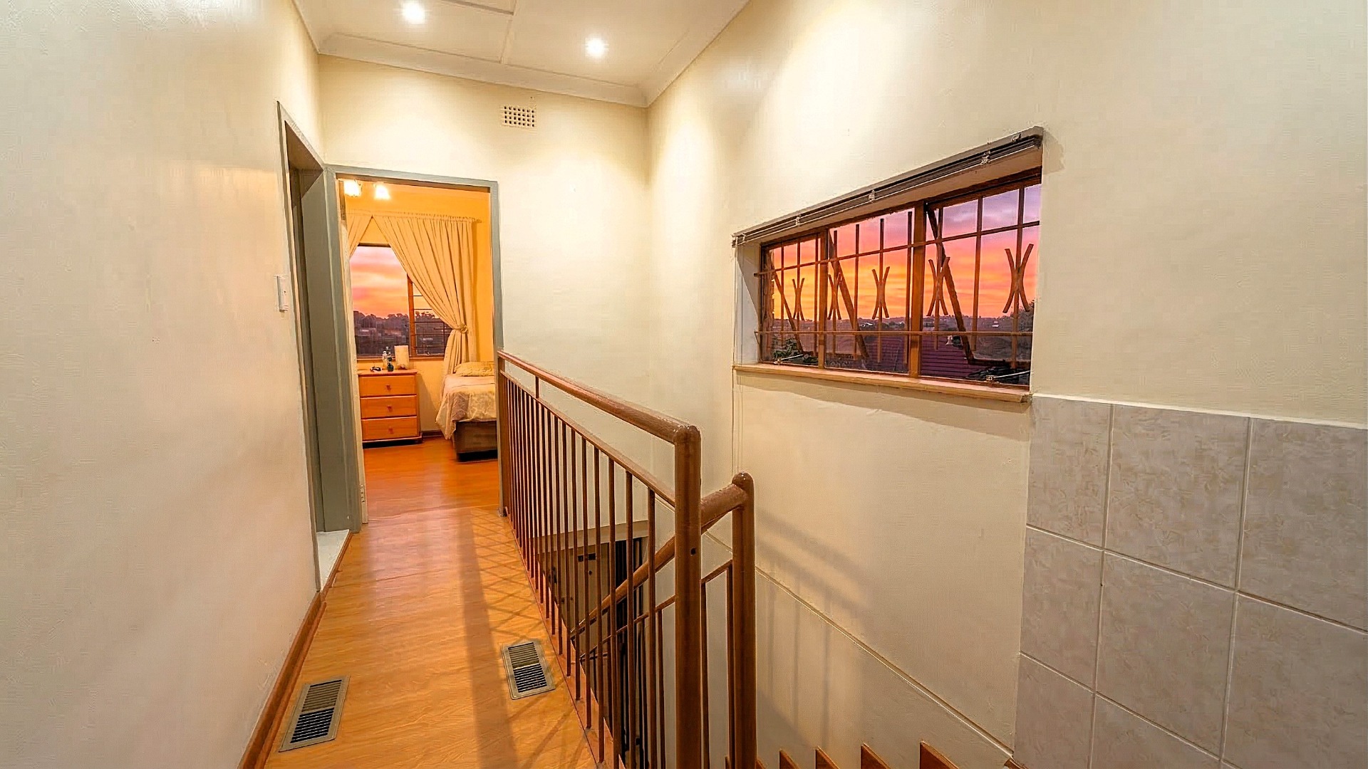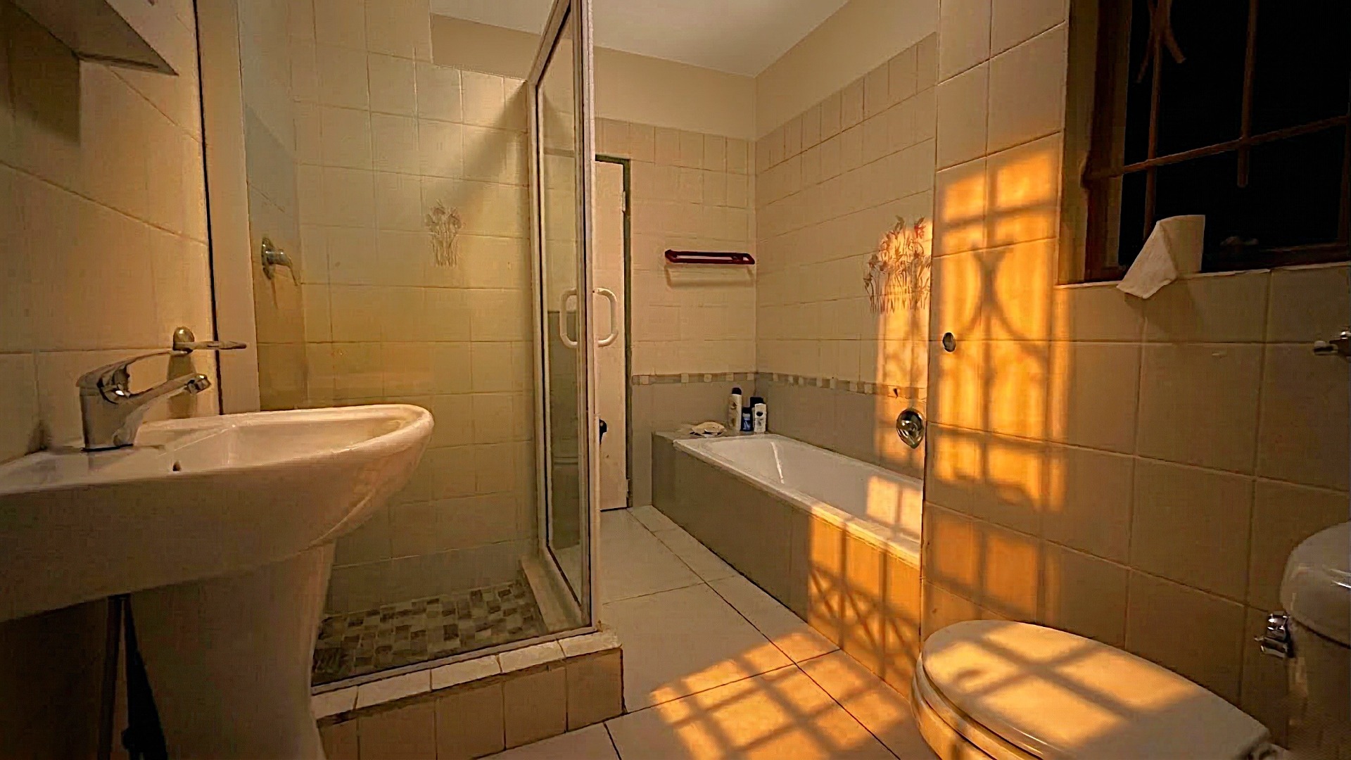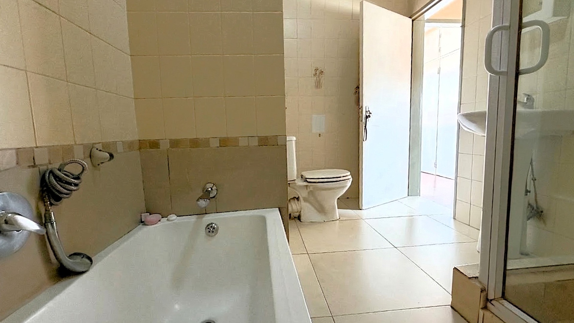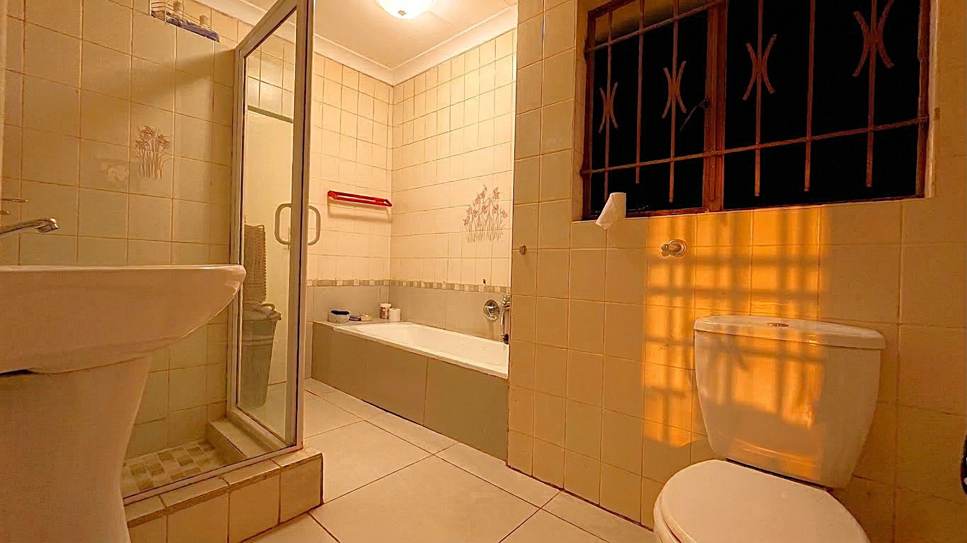 Upstairs, you will find two well-sized bedrooms with ample natural light, serviced by a full bathroom fitted with a bath, shower, basin, and toilet.