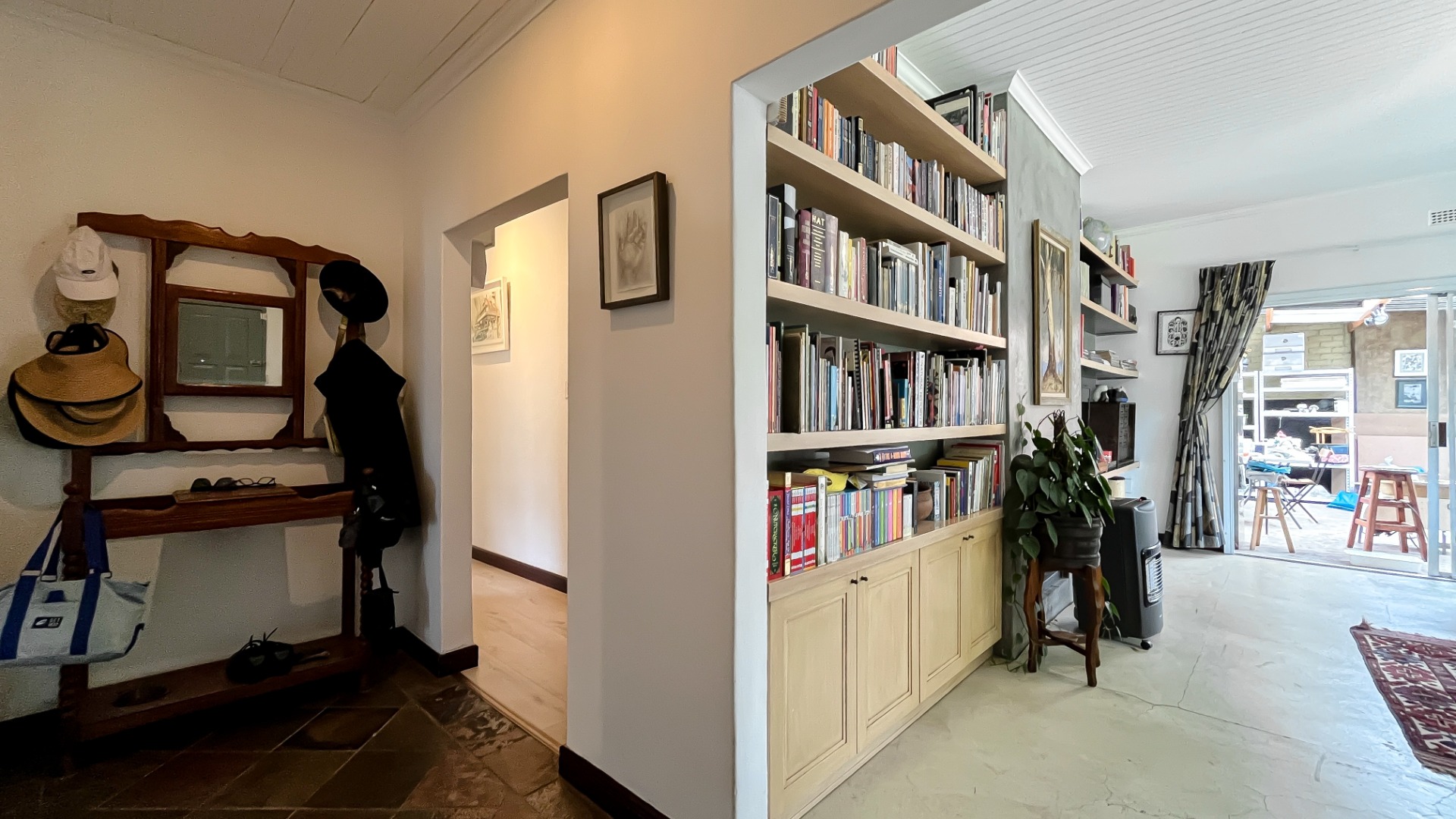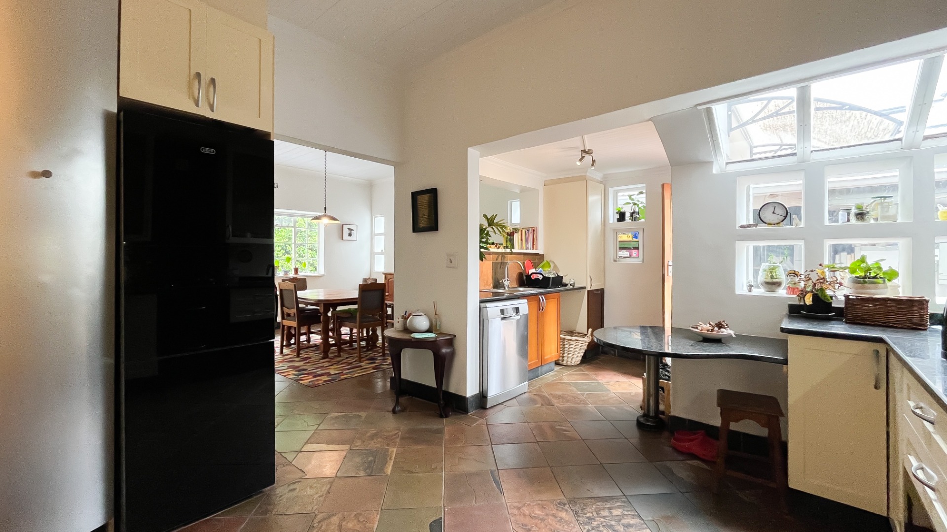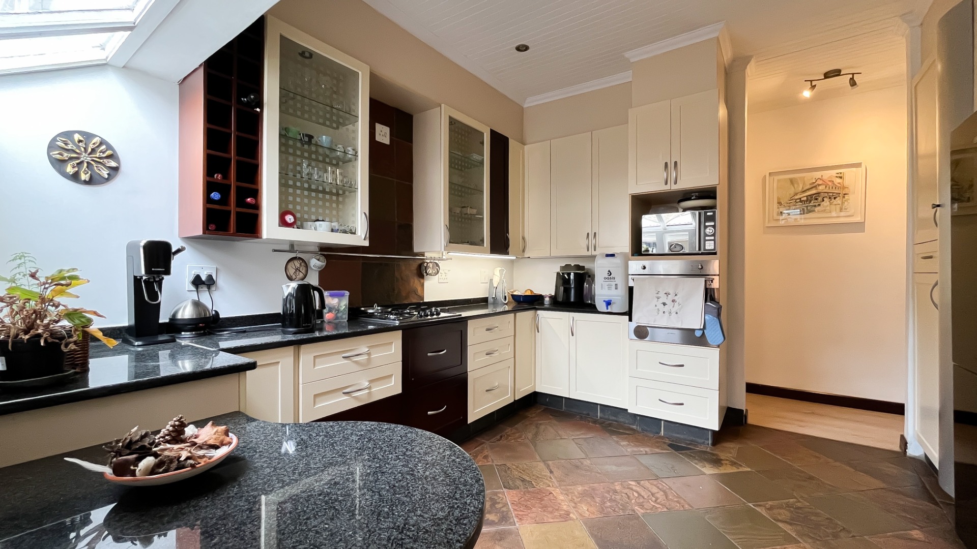 Step inside to a thoughtfully designed interior that balances comfort with practicality. The spacious lounge boasts extensive built-in bookshelves, a feature fireplace recess, and unique paneled ceilings, creating an inviting atmosphere. Large windows and sliding doors ensure ample natural light. The dining room, perfect for entertaining, includes built-in storage and connects seamlessly to the modern kitchen. This culinary space is a highlight, featuring a large skylight, a mix of cream and dark cabinetry, durable granite countertops, all set against distinctive slate flooring.