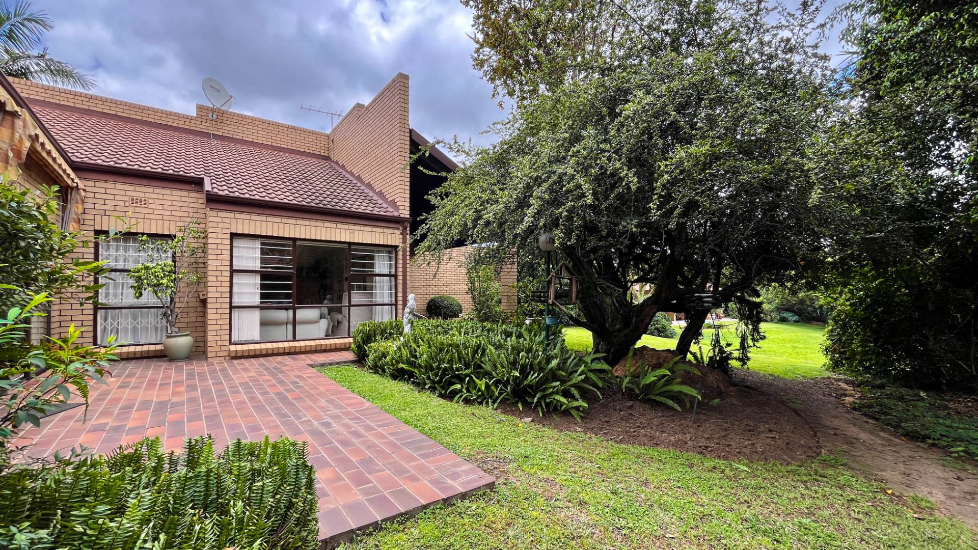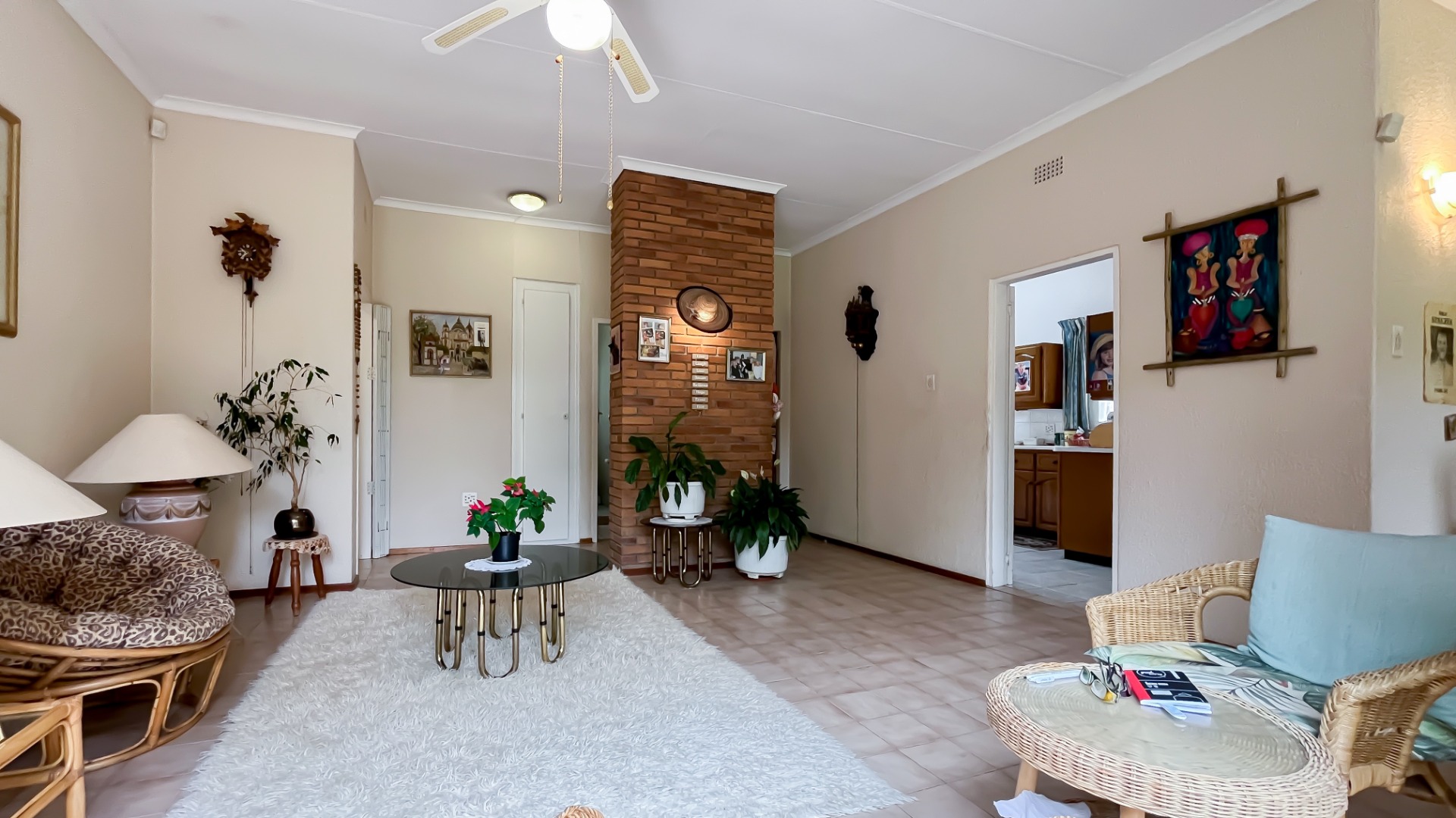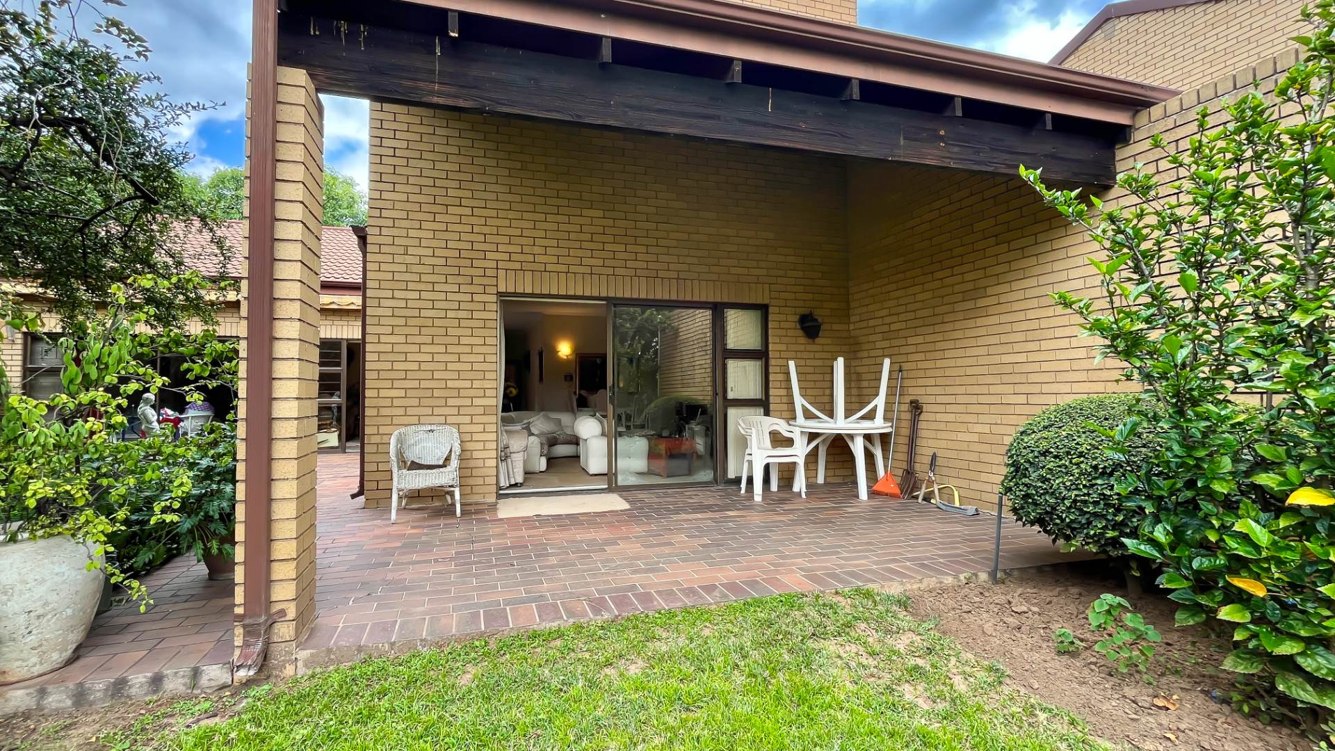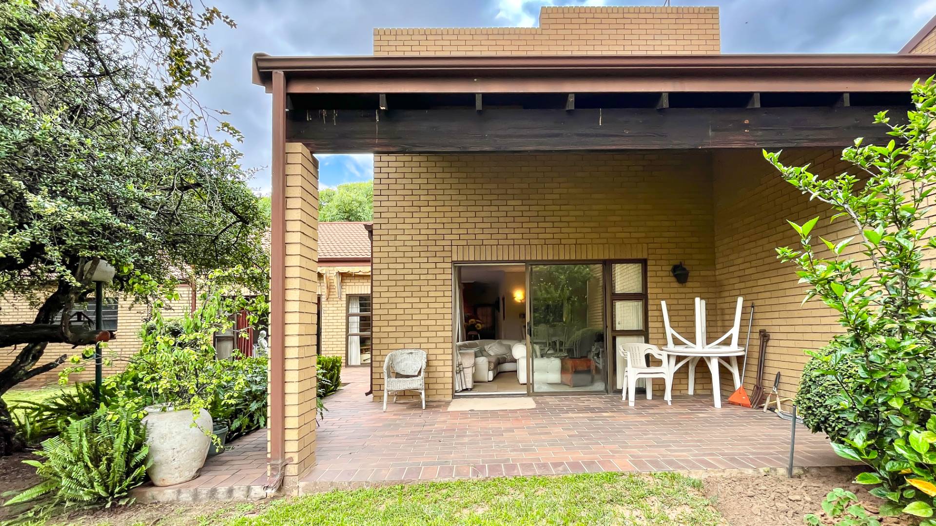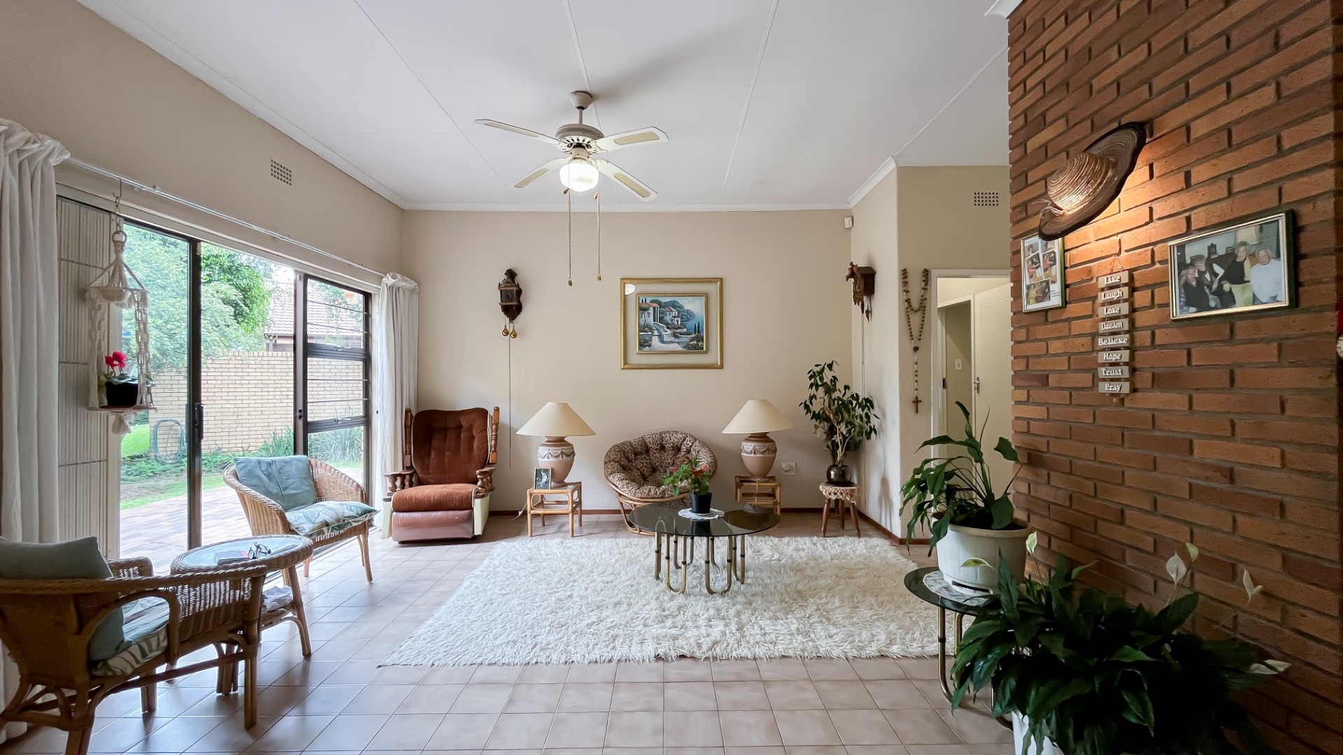 The interior boasts two spacious living areas and a dedicated dining space, ensuring versatile living arrangements. The main living areas feature durable tiled flooring and benefit from abundant natural light, with a distinctive exposed brick accent wall adding character. Large sliding doors which connect the indoor spaces to the lush garden, enhancing the sense of openness and providing a pleasant backdrop for daily living. A functional kitchen caters to everyday needs.
