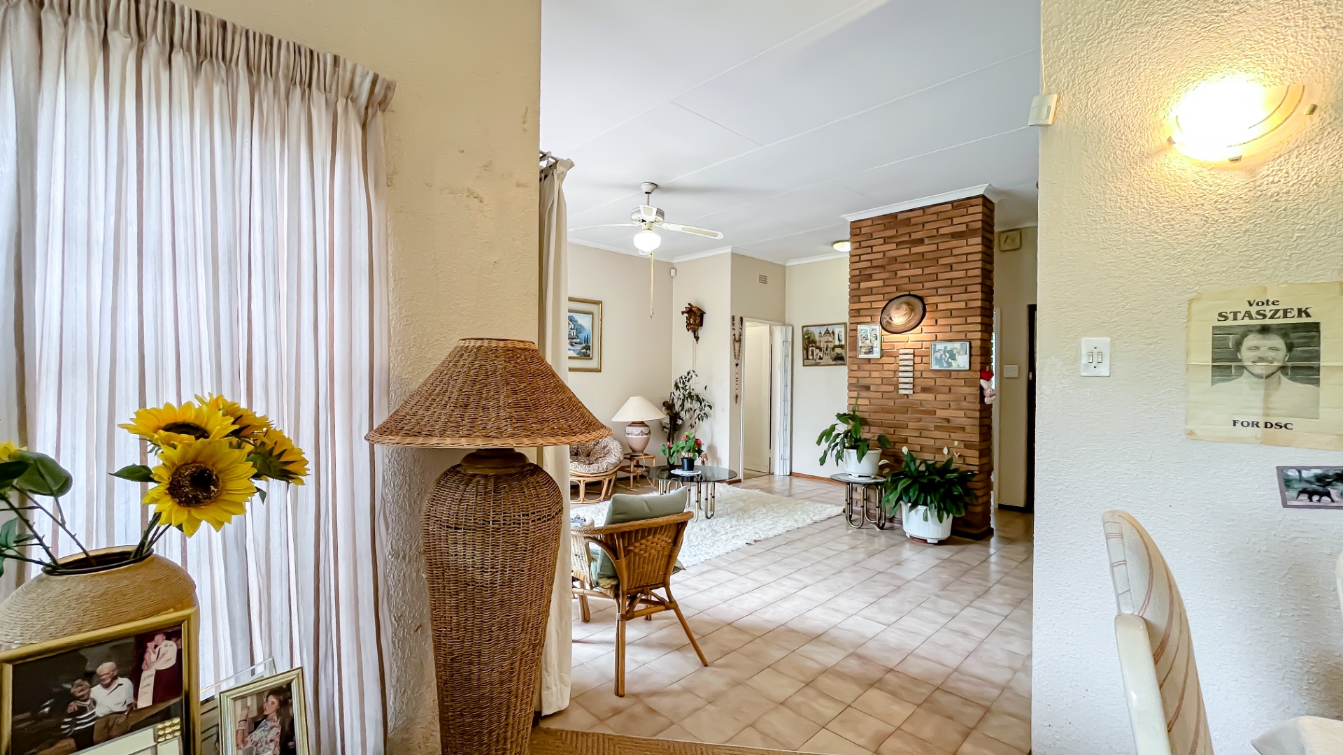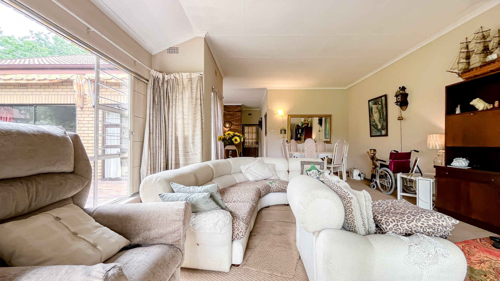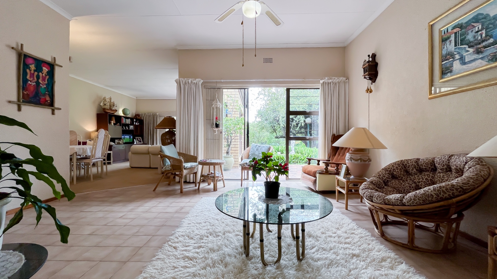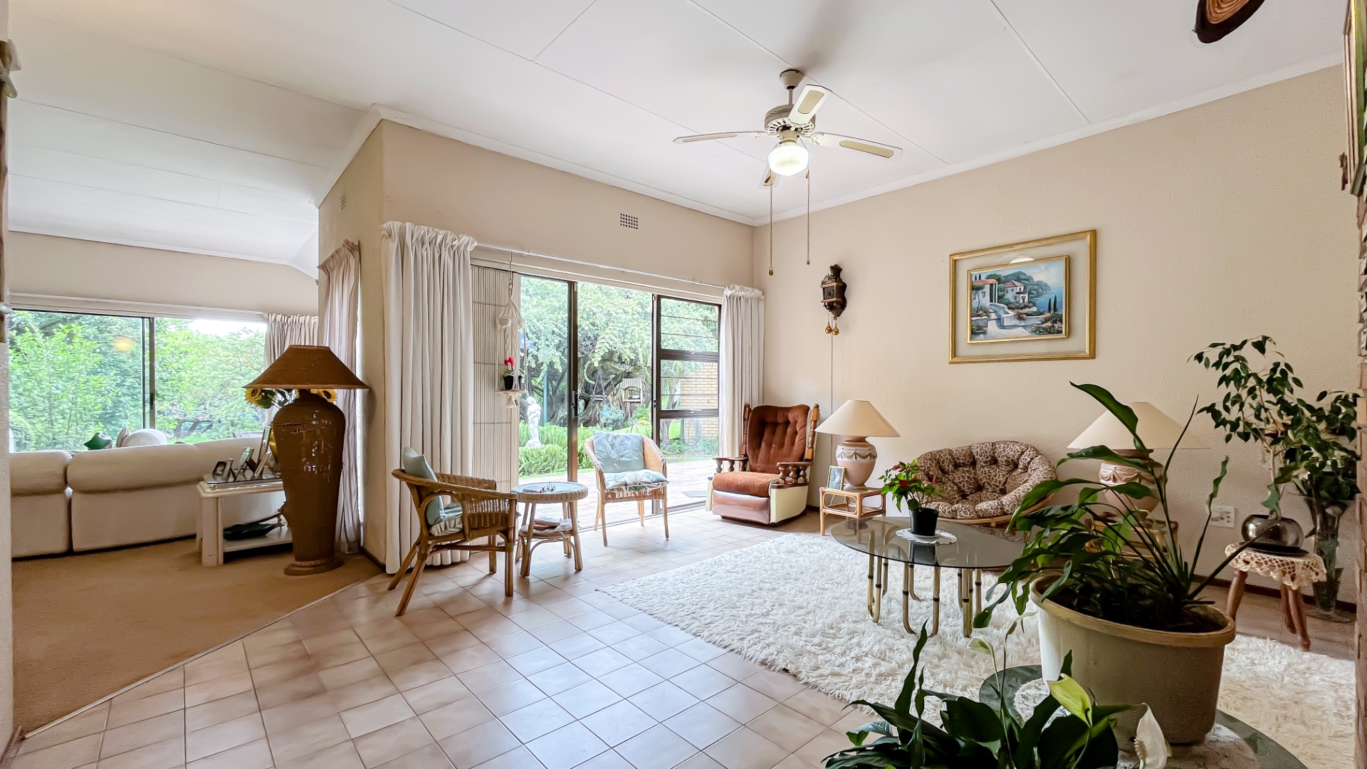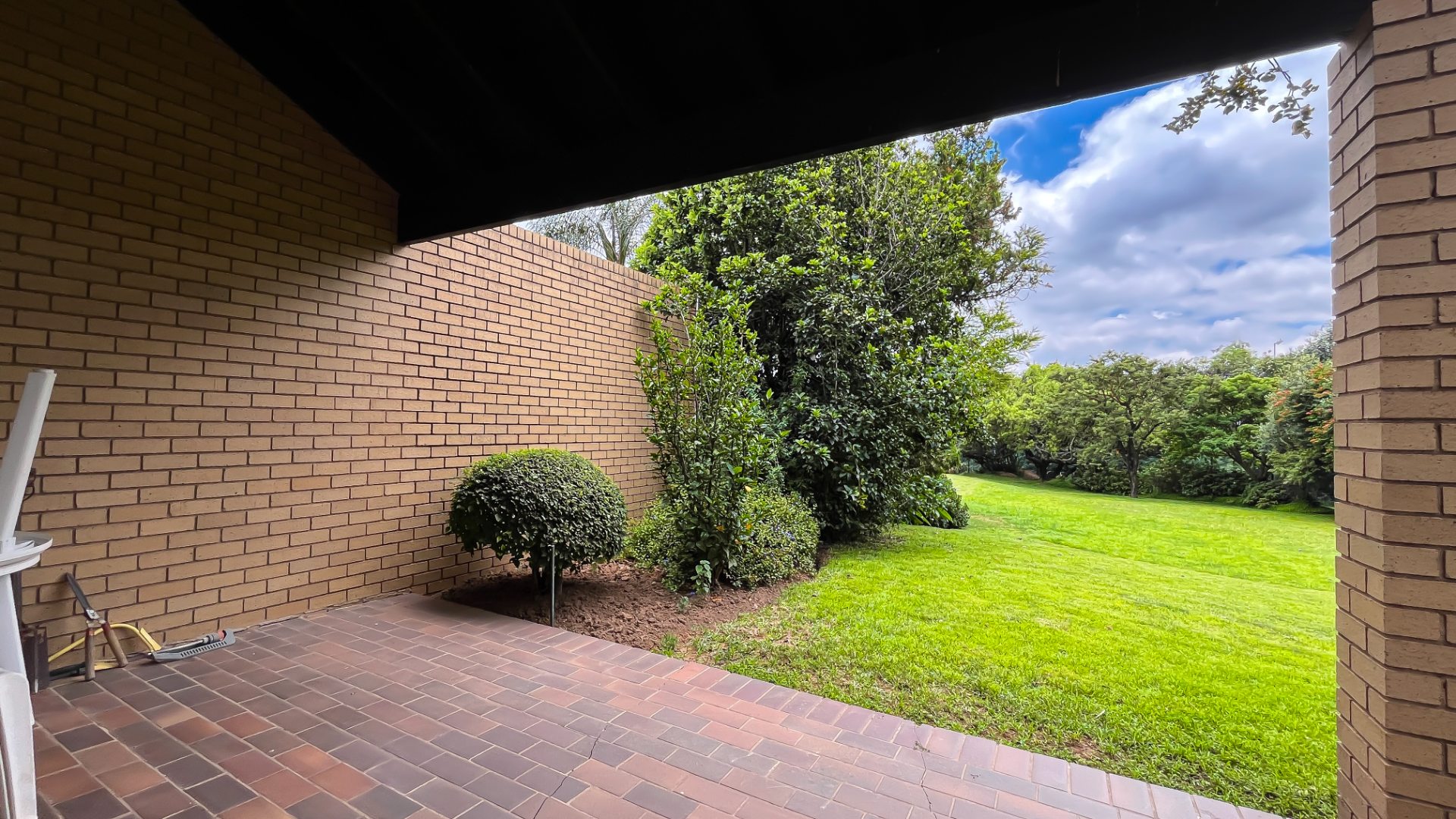 The interior boasts two spacious living areas and a dedicated dining space, ensuring versatile living arrangements. The main living areas feature durable tiled flooring and benefit from abundant natural light, with a distinctive exposed brick accent wall adding character. Large sliding doors which connect the indoor spaces to the lush garden, enhancing the sense of openness and providing a pleasant backdrop for daily living. A functional kitchen caters to everyday needs.