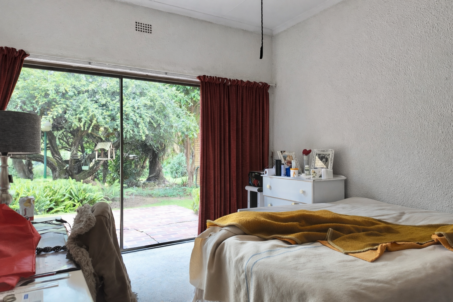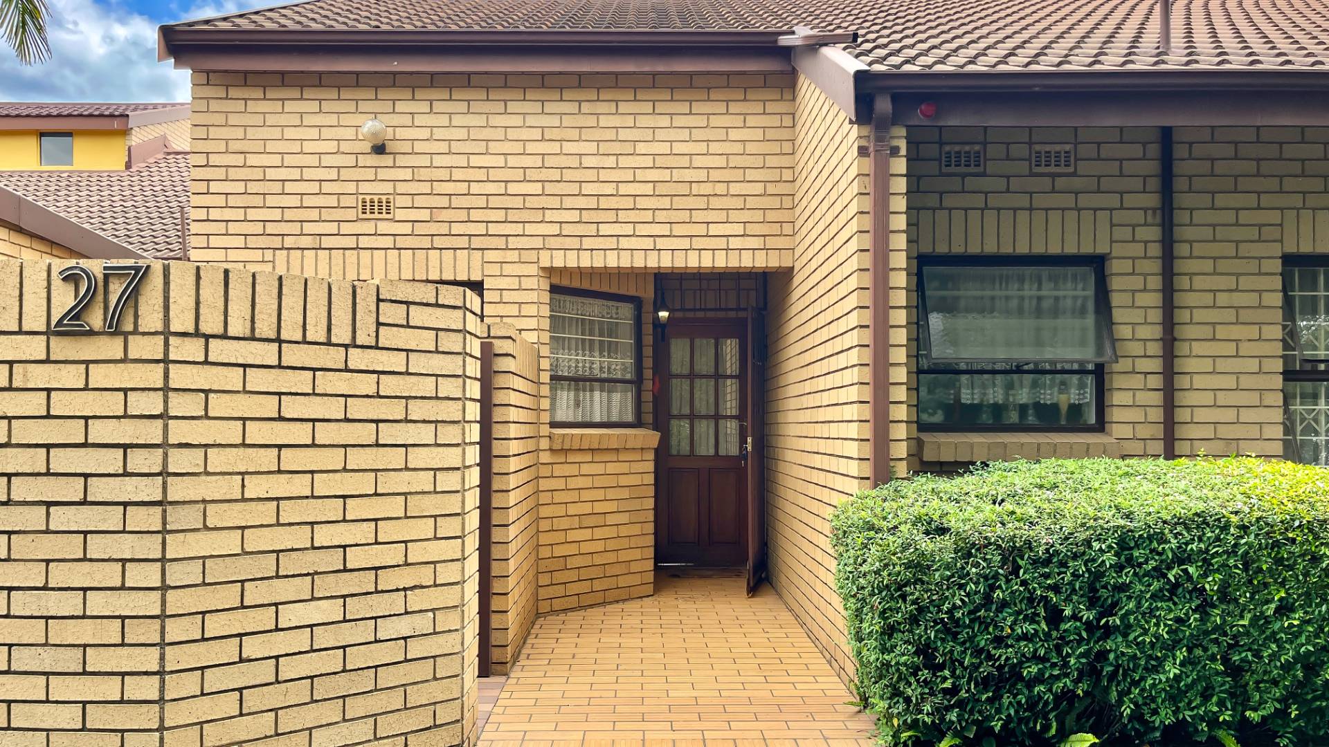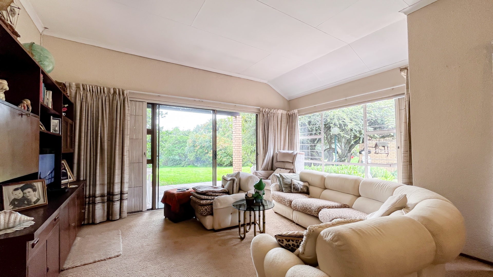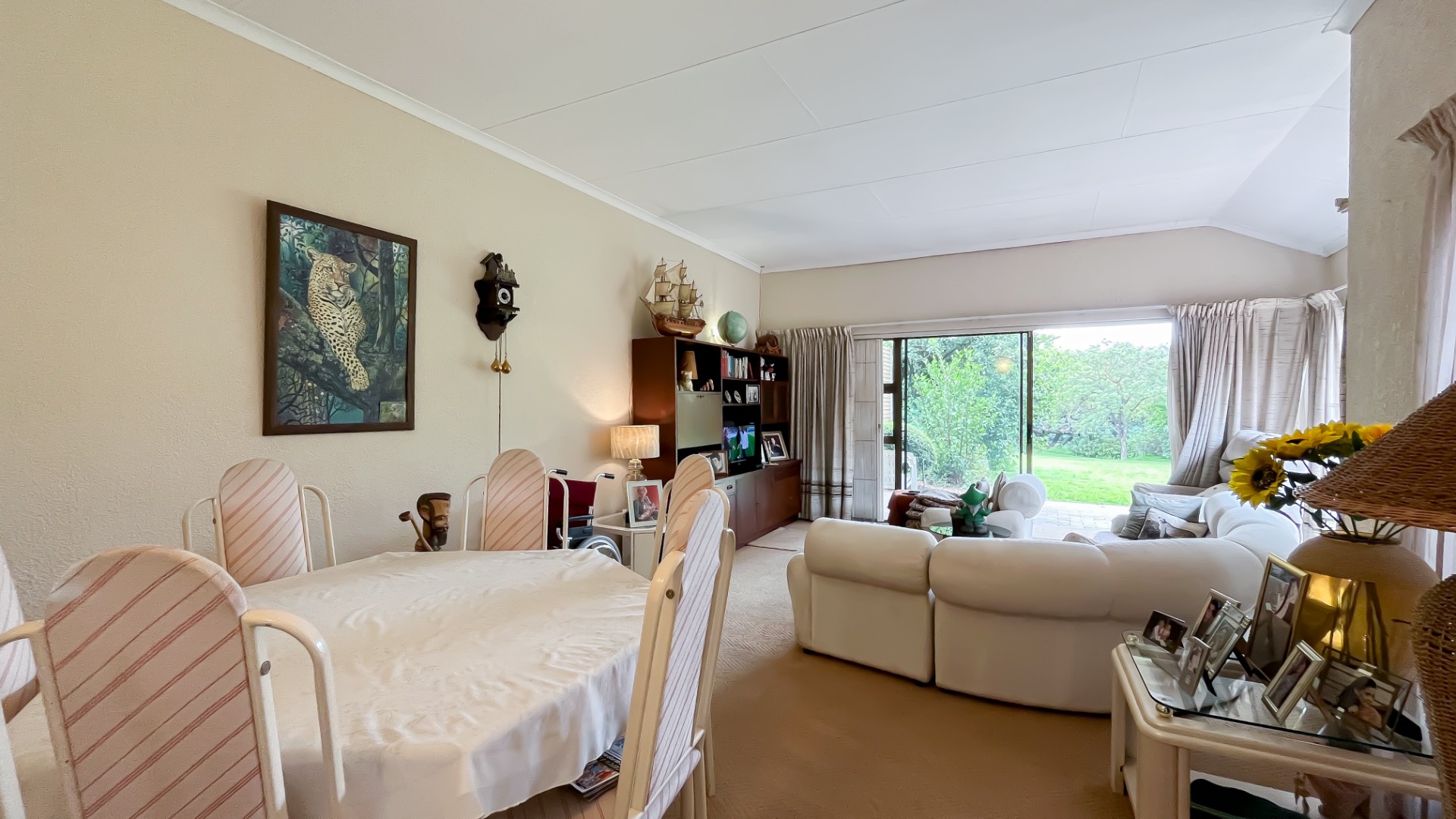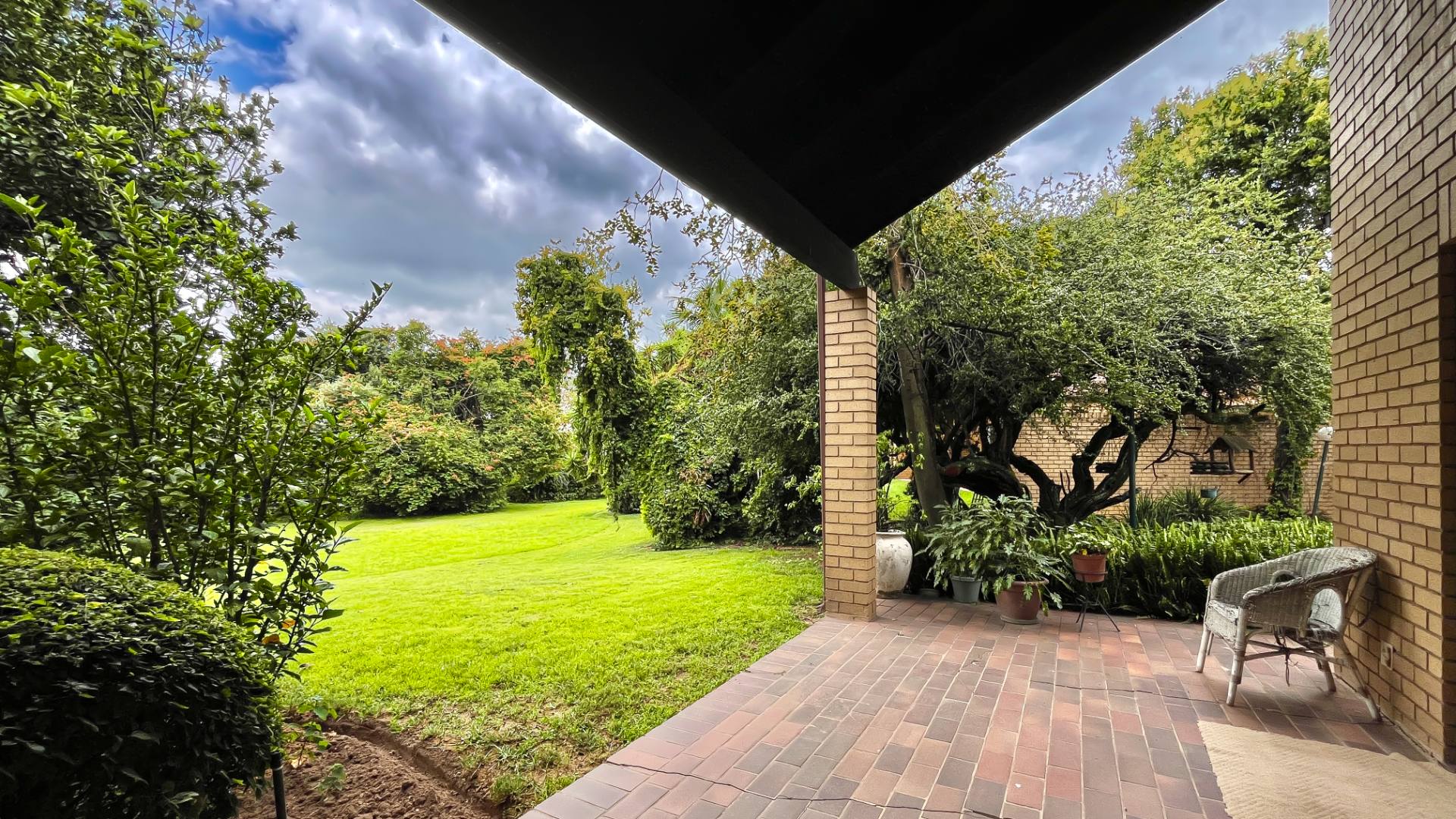 The interior boasts two spacious living areas and a dedicated dining space, ensuring versatile living arrangements. The main living areas feature durable tiled flooring and benefit from abundant natural light, with a distinctive exposed brick accent wall adding character. Large sliding doors which connect the indoor spaces to the lush garden, enhancing the sense of openness and providing a pleasant backdrop for daily living. A functional kitchen caters to everyday needs.