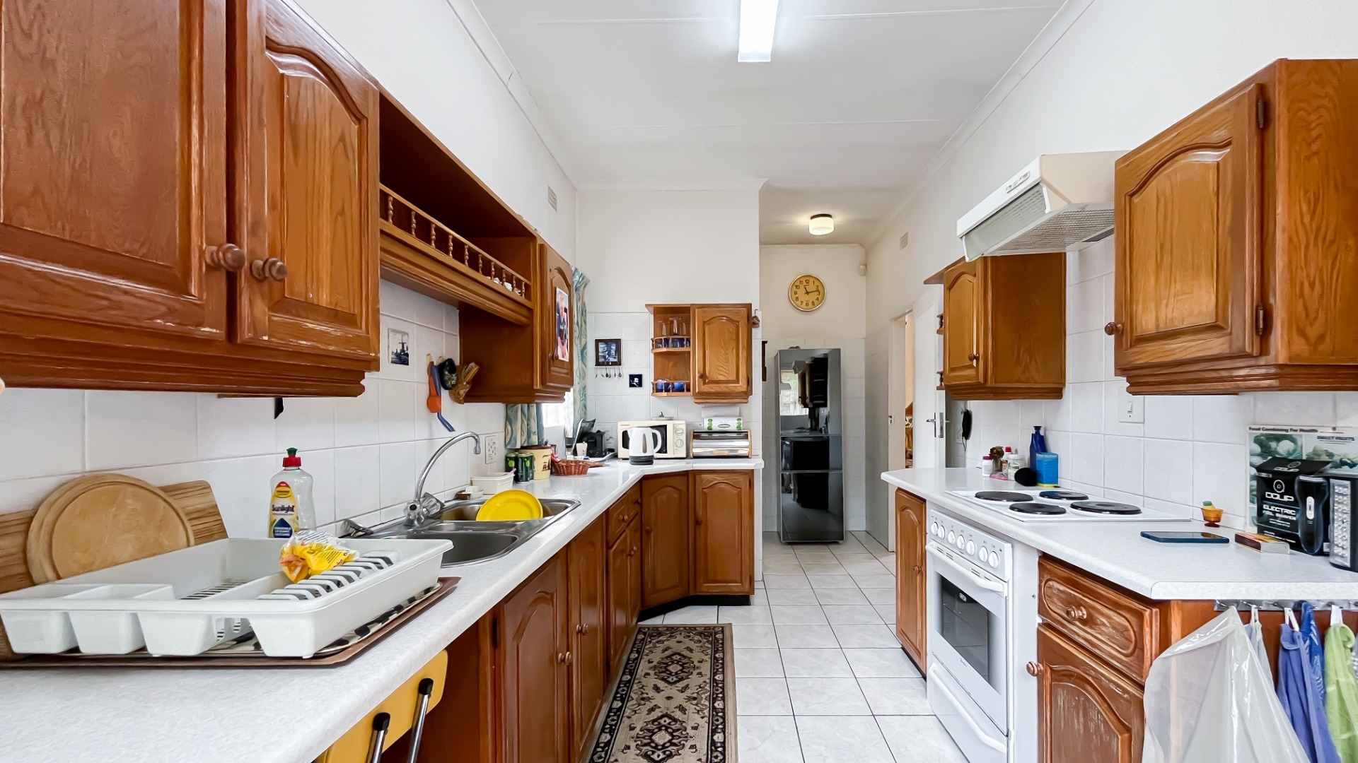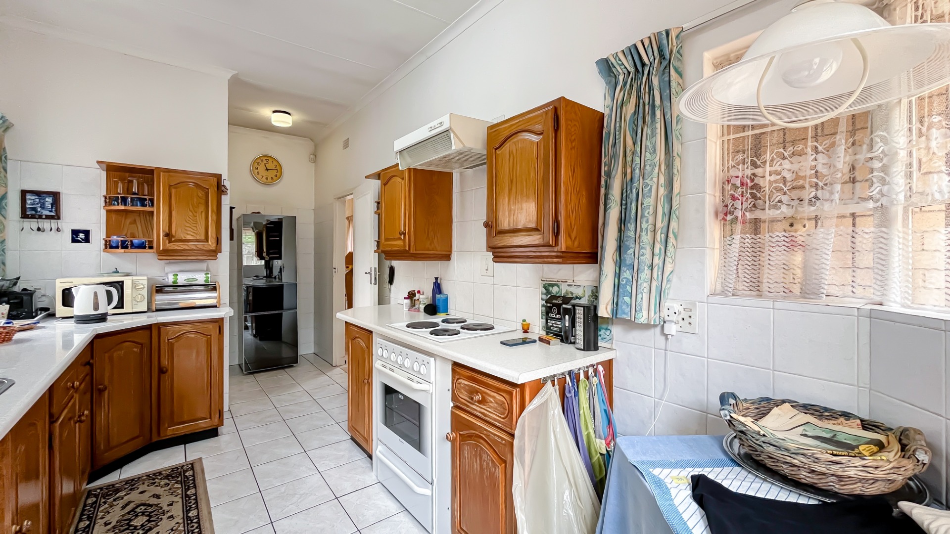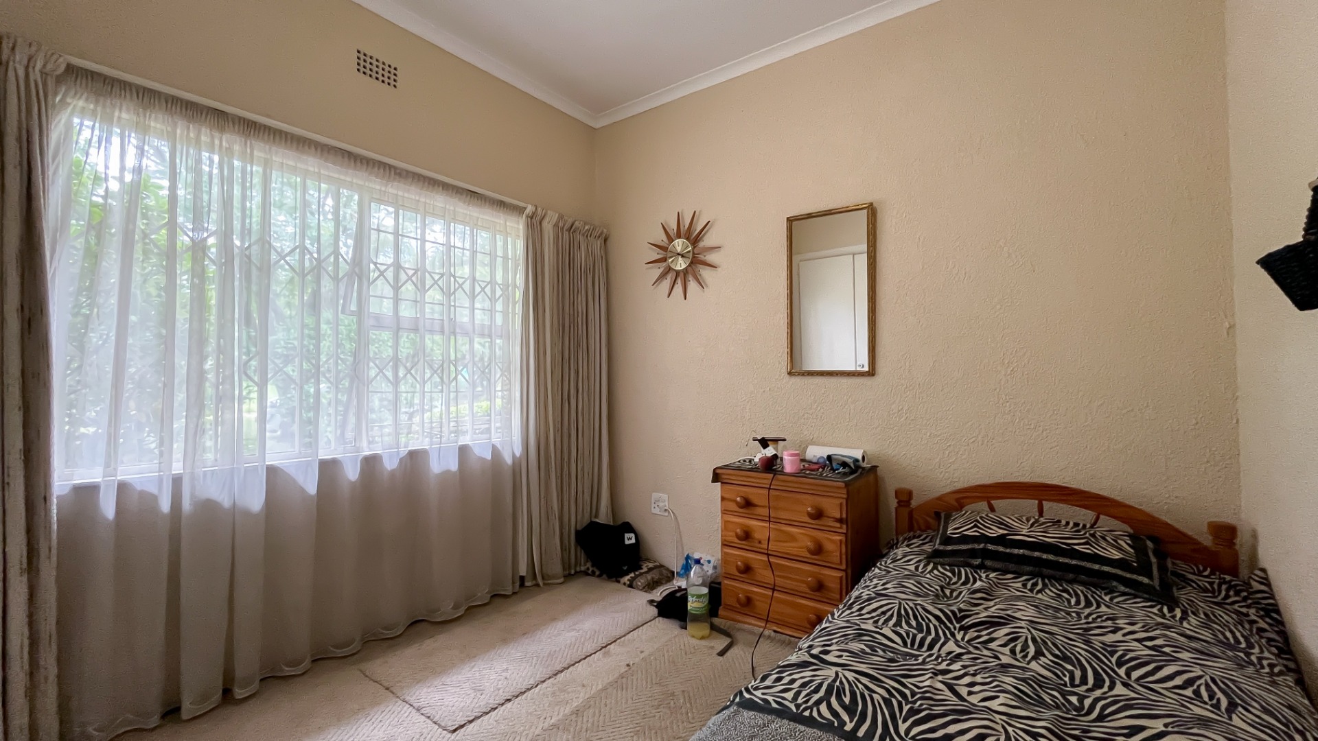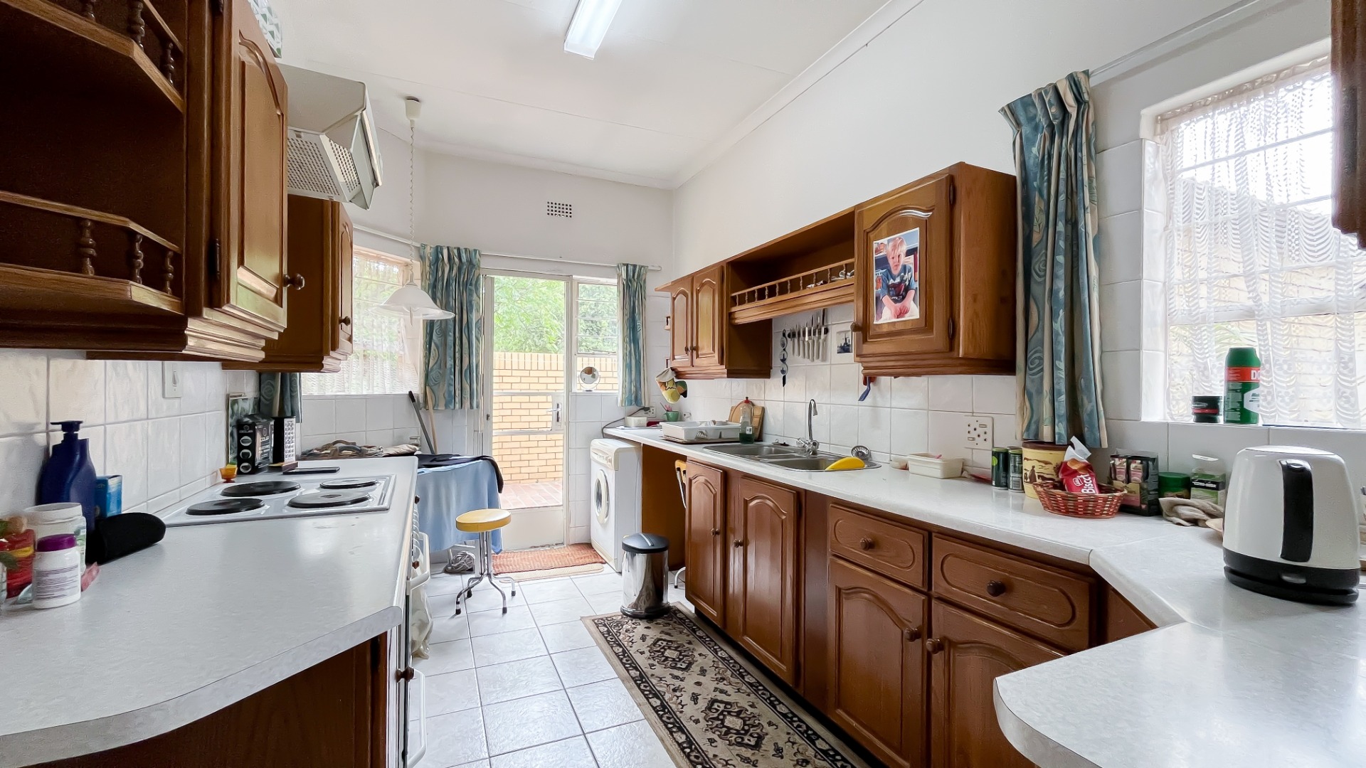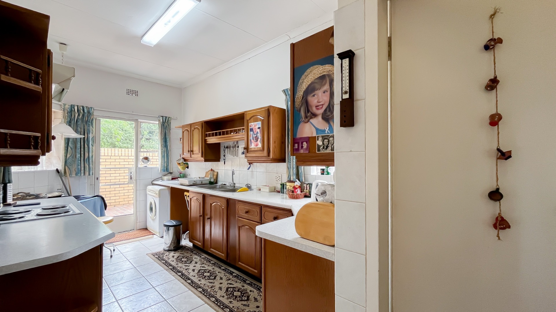 The interior boasts two spacious living areas and a dedicated dining space, ensuring versatile living arrangements. The main living areas feature durable tiled flooring and benefit from abundant natural light, with a distinctive exposed brick accent wall adding character. Large sliding doors which connect the indoor spaces to the lush garden, enhancing the sense of openness and providing a pleasant backdrop for daily living. A functional kitchen caters to everyday needs.