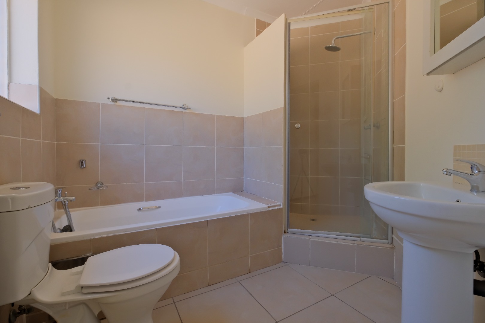 Bathroom: A neat, full bathroom with bath, shower, toilet, and basin – perfectly positioned between the two rooms.