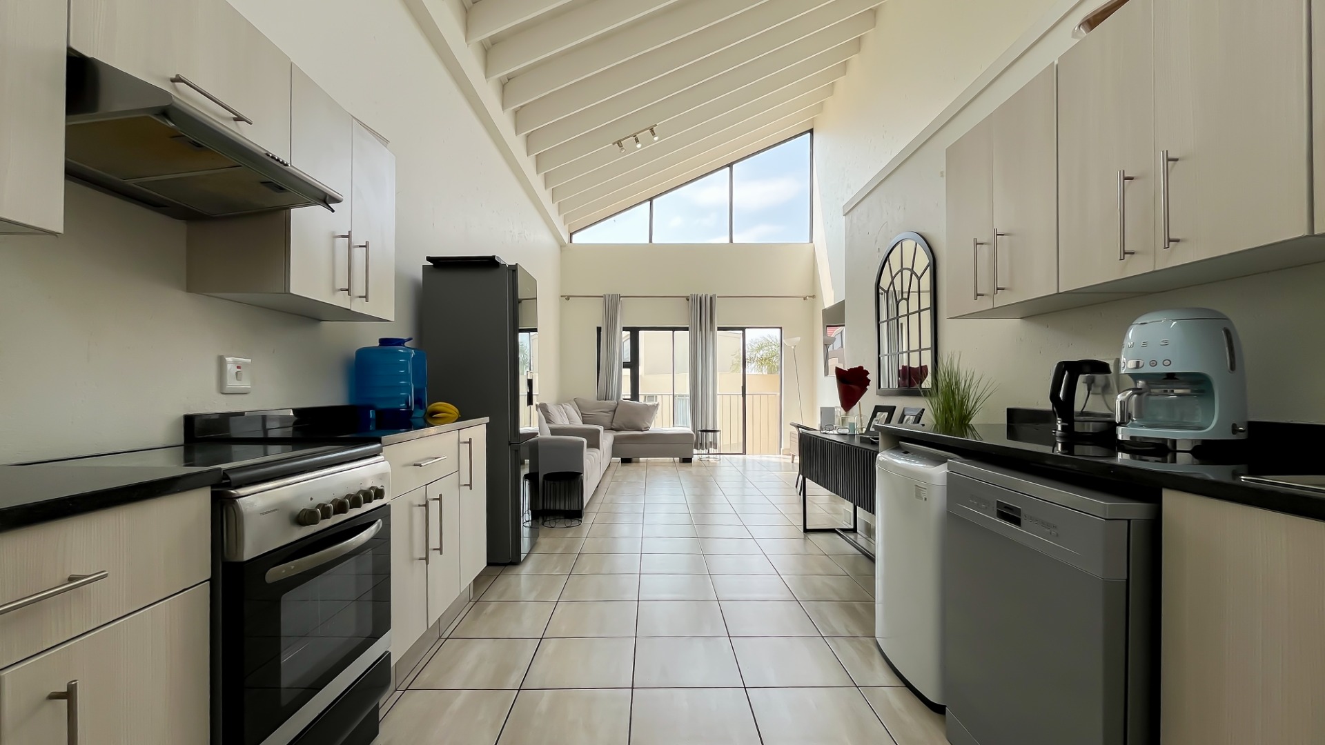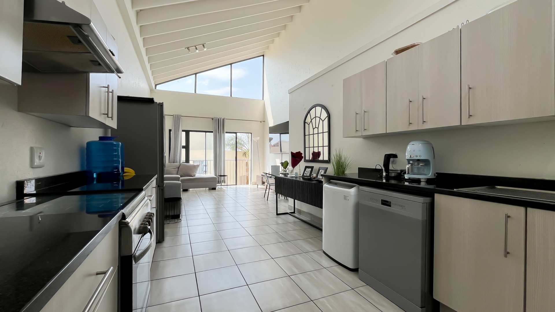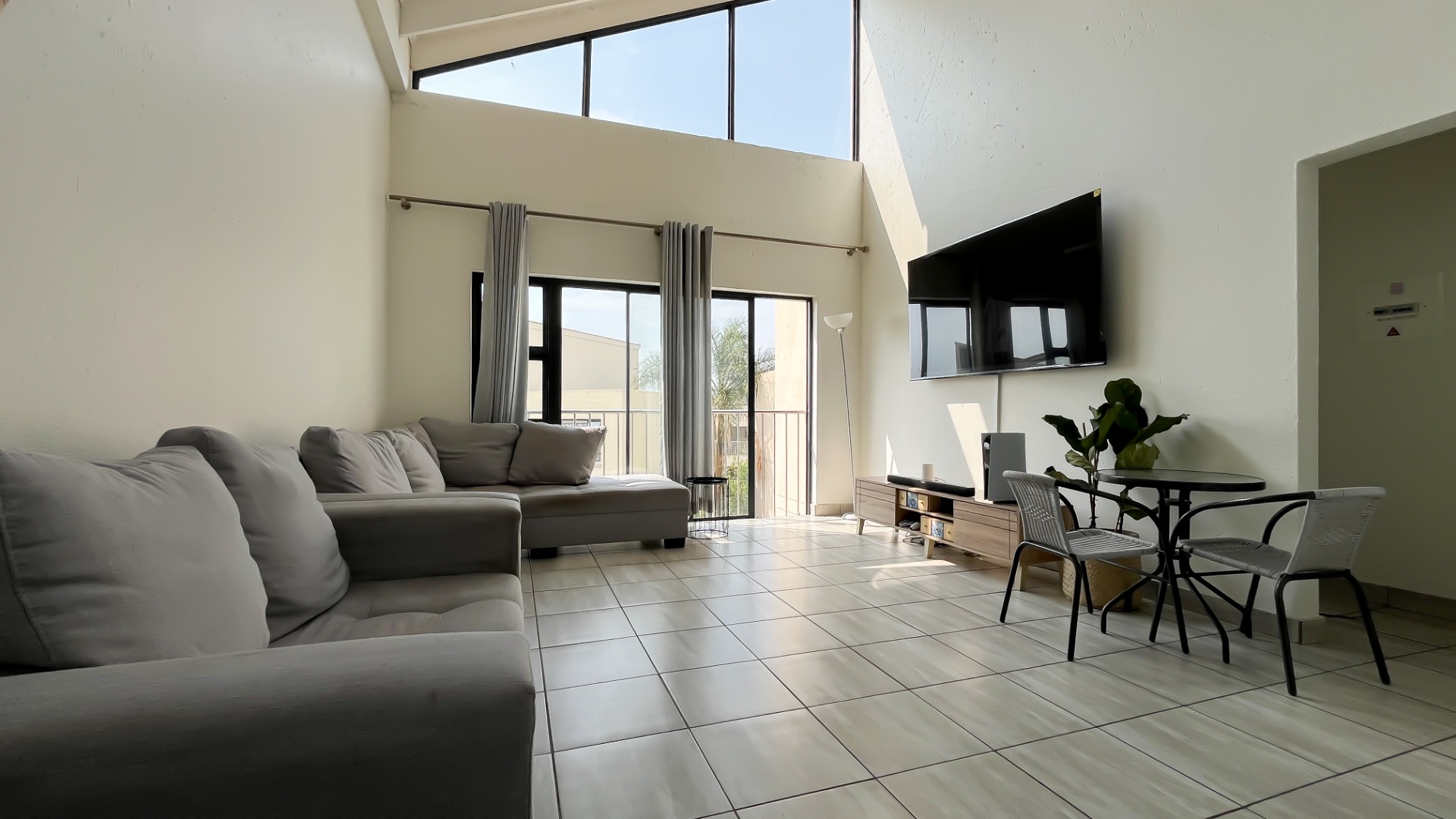 Discover this bright and modern 3-bedroom, 2-bathroom apartment located within a secure complex in Beverley, Sandton. This residence is designed for comfort and style, featuring an inviting open-plan layout enhanced by impressive high vaulted ceilings and expansive windows that flood the space with abundant natural light. The entire apartment boasts tiled flooring, ensuring easy maintenance and a sleek aesthetic throughout.
