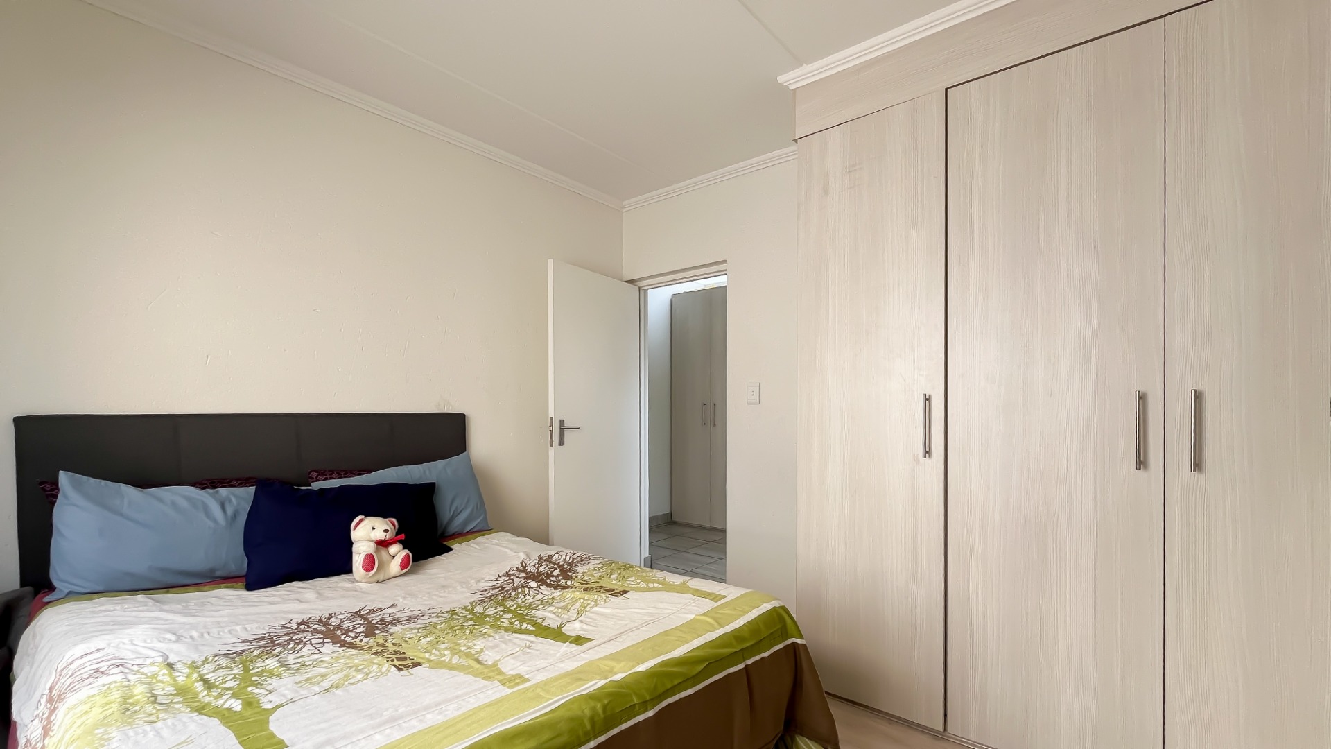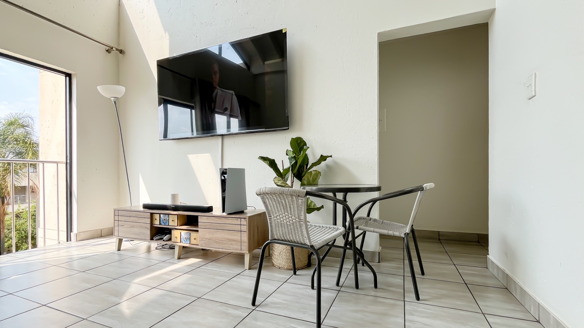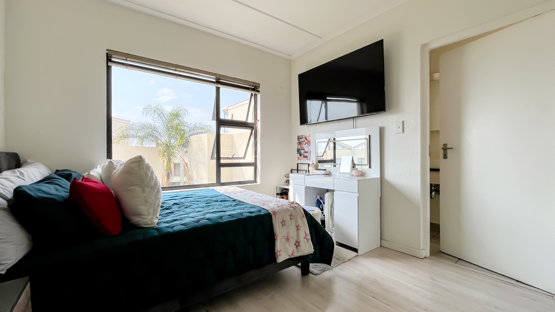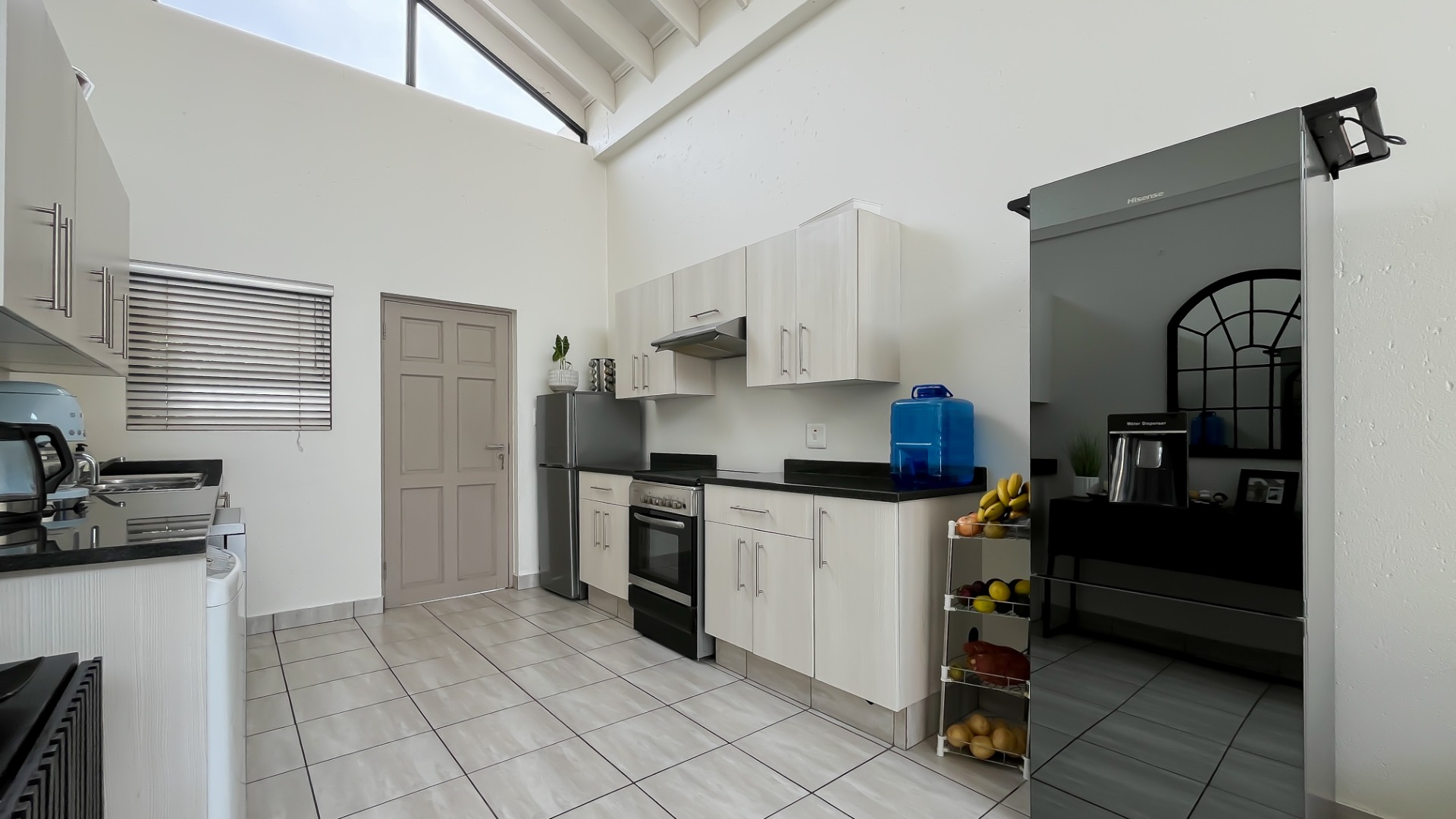 Discover this bright and modern 3-bedroom, 2-bathroom apartment located within a secure complex in Beverley, Sandton. This residence is designed for comfort and style, featuring an inviting open-plan layout enhanced by impressive high vaulted ceilings and expansive windows that flood the space with abundant natural light. The entire apartment boasts tiled flooring, ensuring easy maintenance and a sleek aesthetic throughout.