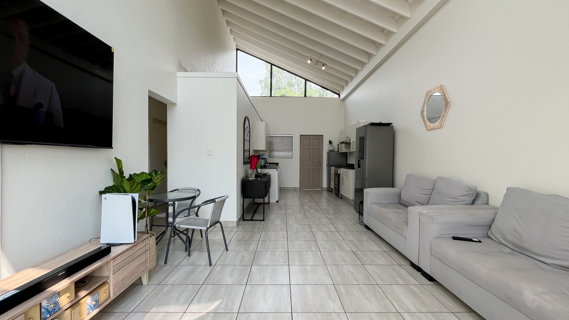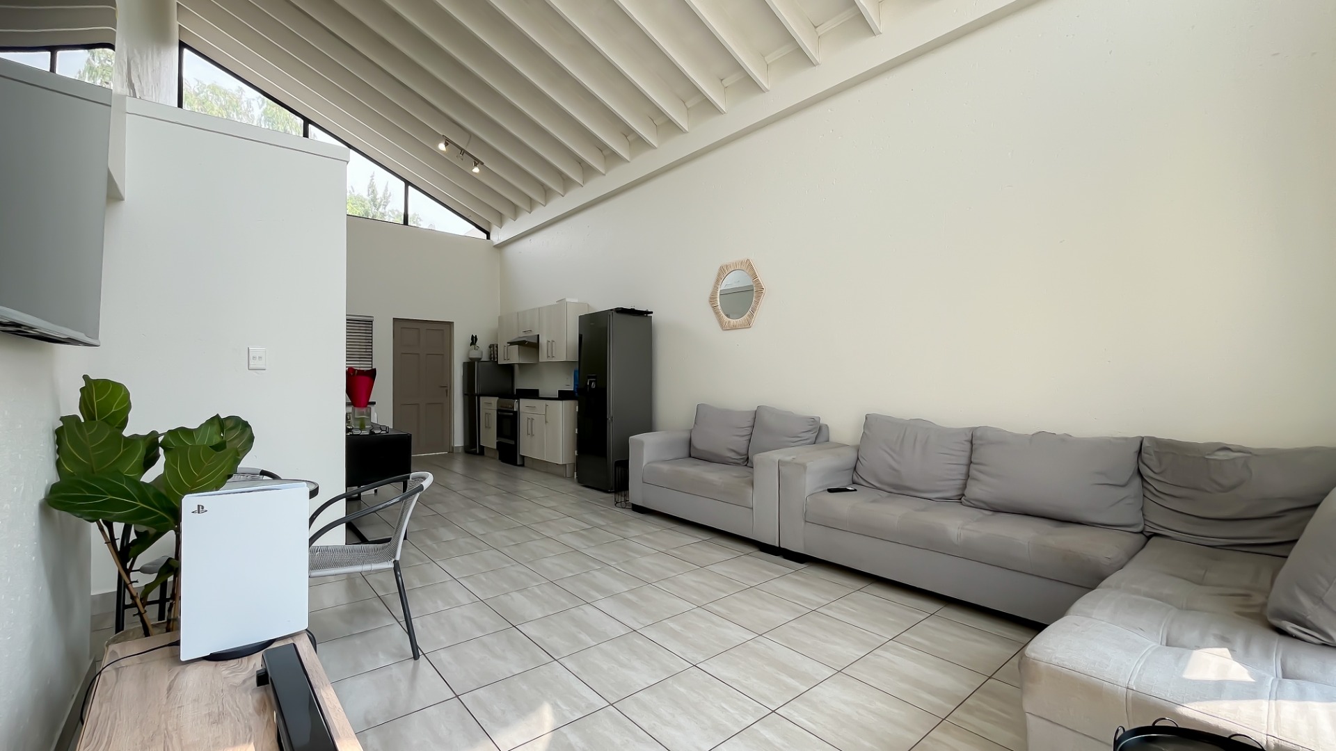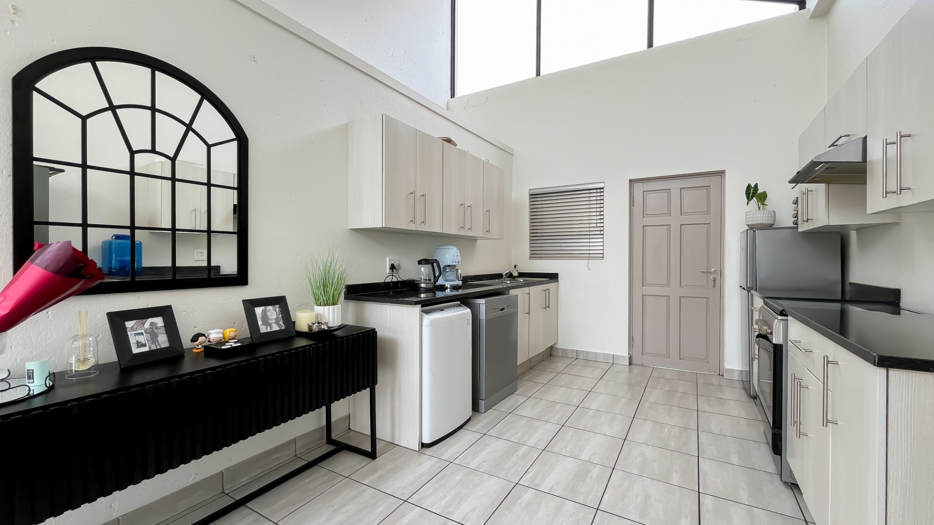Discover this bright and modern 3-bedroom, 2-bathroom apartment located within a secure complex in Beverley, Sandton. This residence is designed for comfort and style, featuring an inviting open-plan layout enhanced by impressive high vaulted ceilings and expansive windows that flood the space with abundant natural light. The entire apartment boasts tiled flooring, ensuring easy maintenance and a sleek aesthetic throughout.