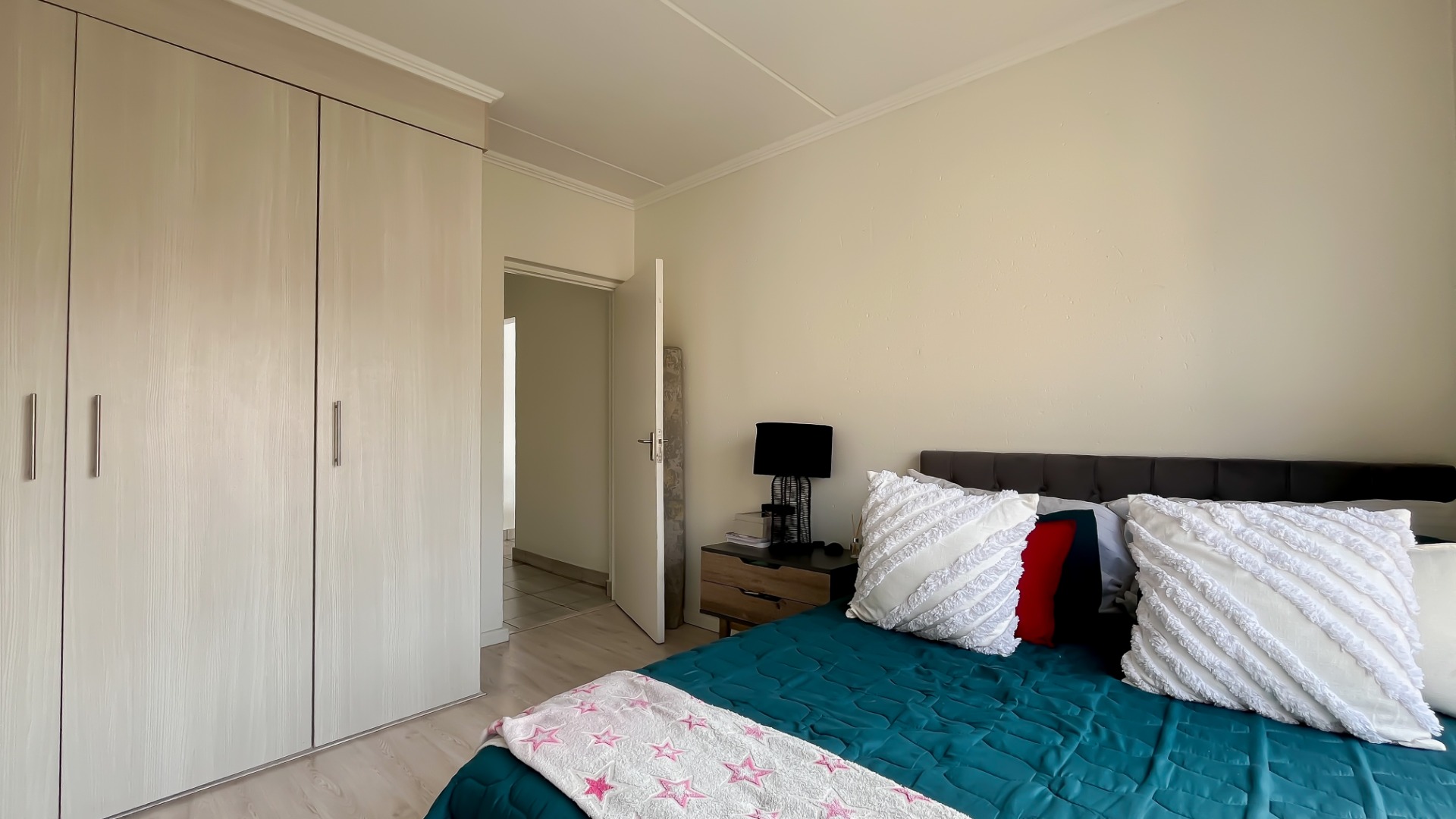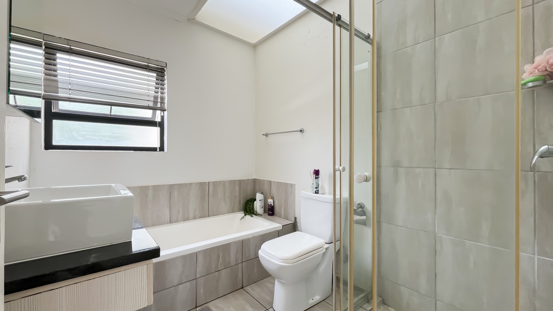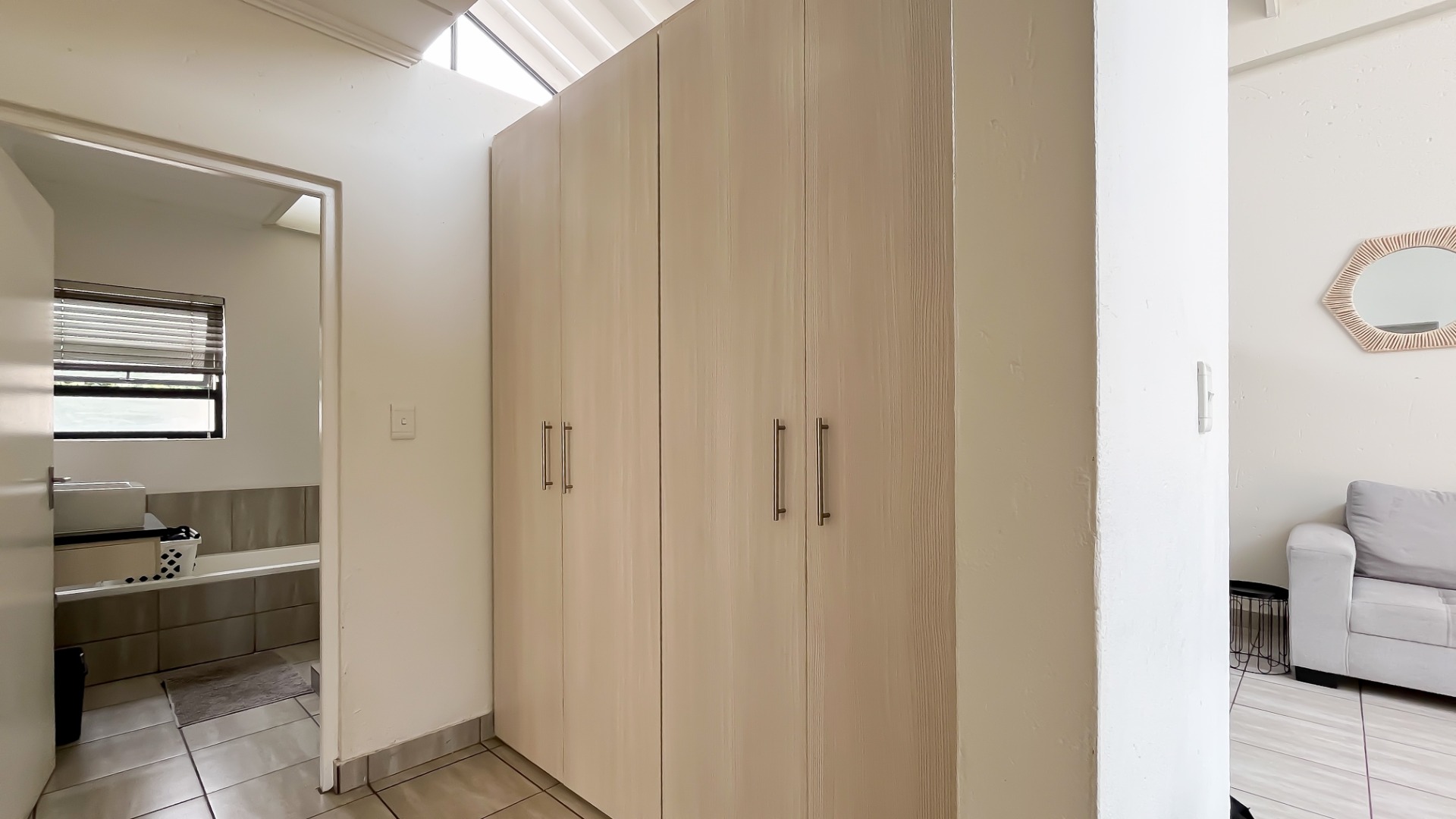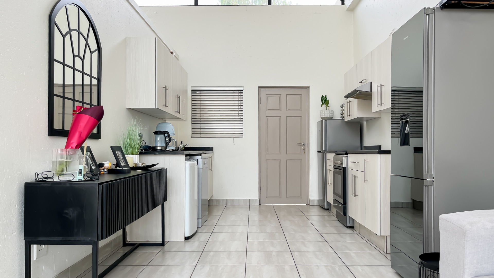 Discover this bright and modern 3-bedroom, 2-bathroom apartment located within a secure complex in Beverley, Sandton. This residence is designed for comfort and style, featuring an inviting open-plan layout enhanced by impressive high vaulted ceilings and expansive windows that flood the space with abundant natural light. The entire apartment boasts tiled flooring, ensuring easy maintenance and a sleek aesthetic throughout.