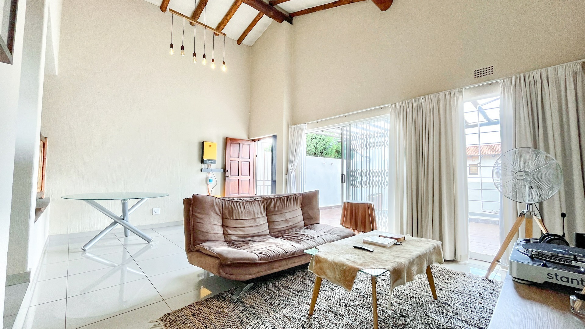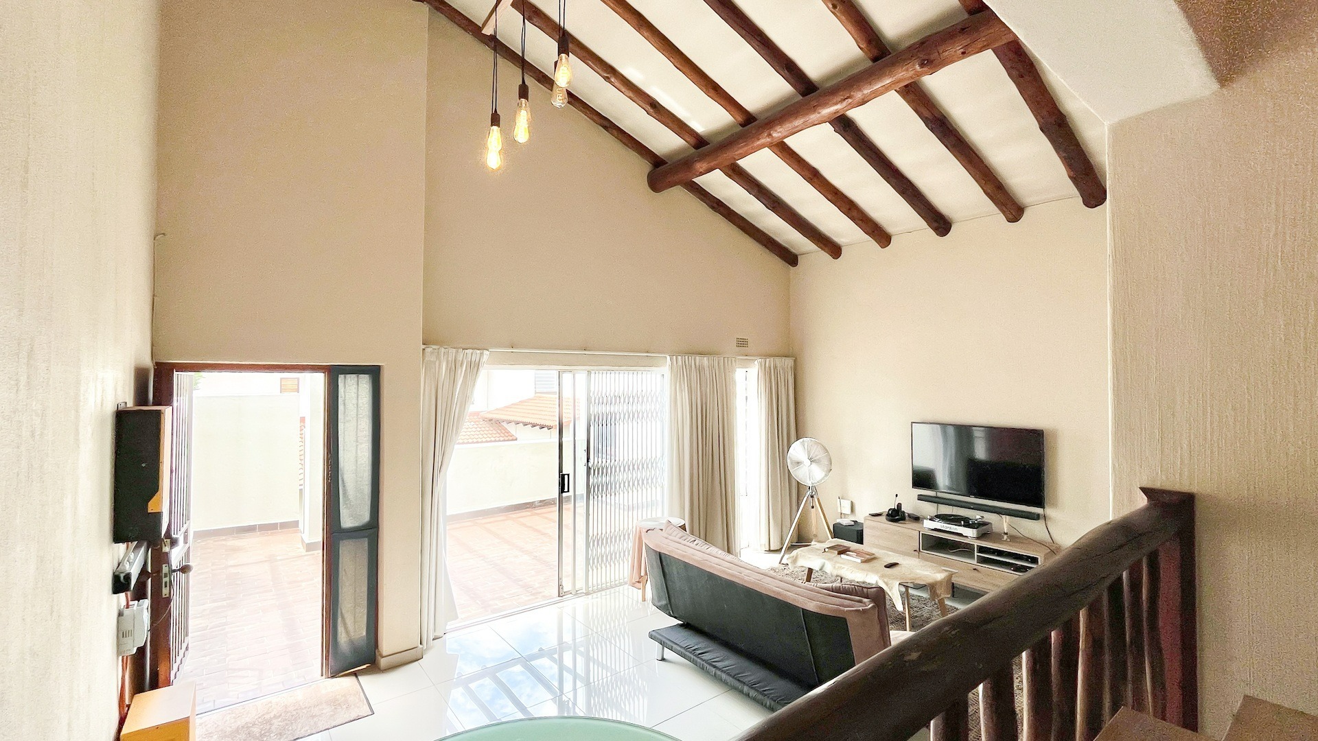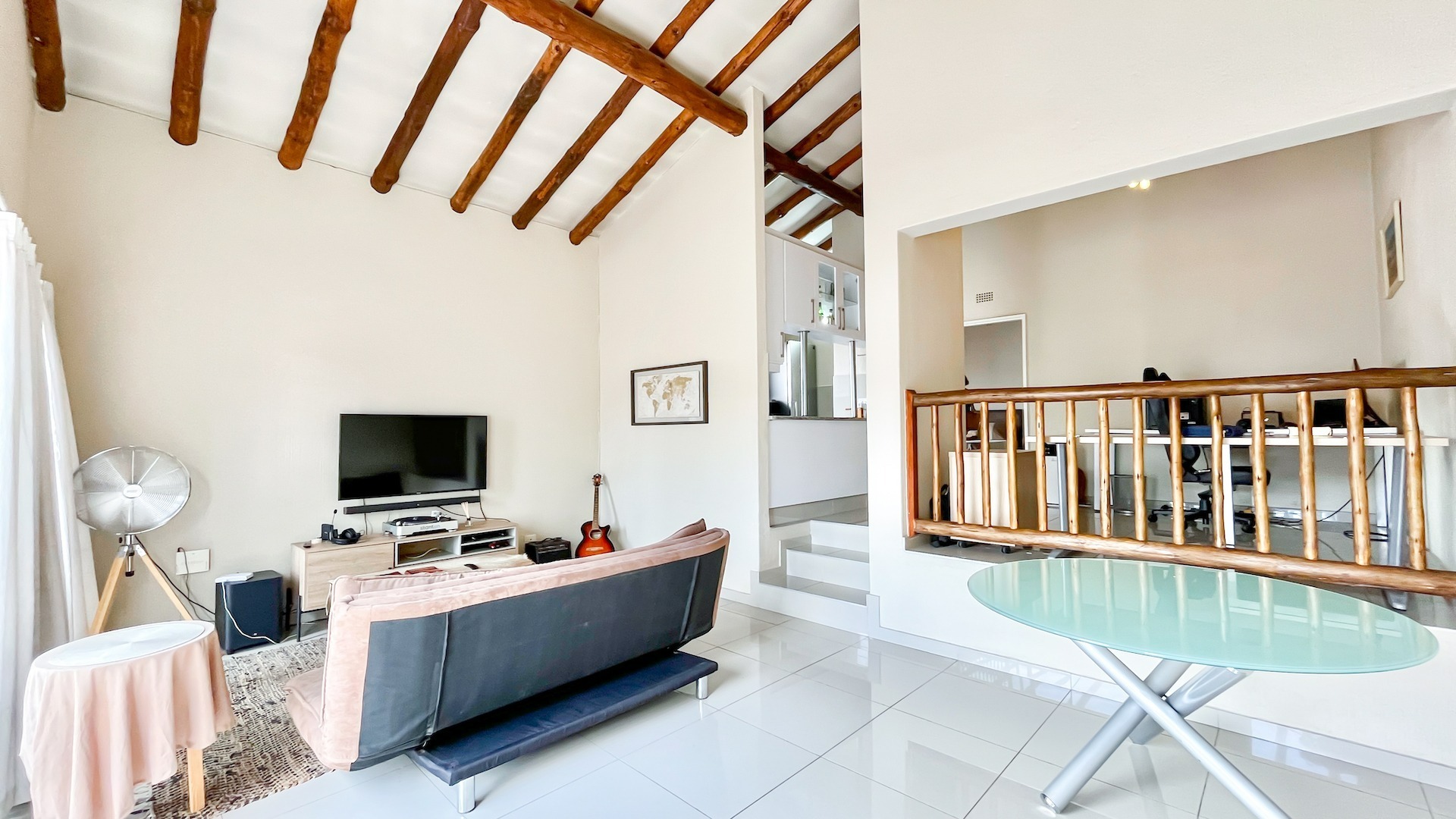 Small flight of stairs leading to totally renovated one bed unit with a garage. From nice sized uncovered patio with built in braai, wooden roof trusses through sliding and front door which opens onto large lounge which can accommodate effortlessly a double couch and dining room table.