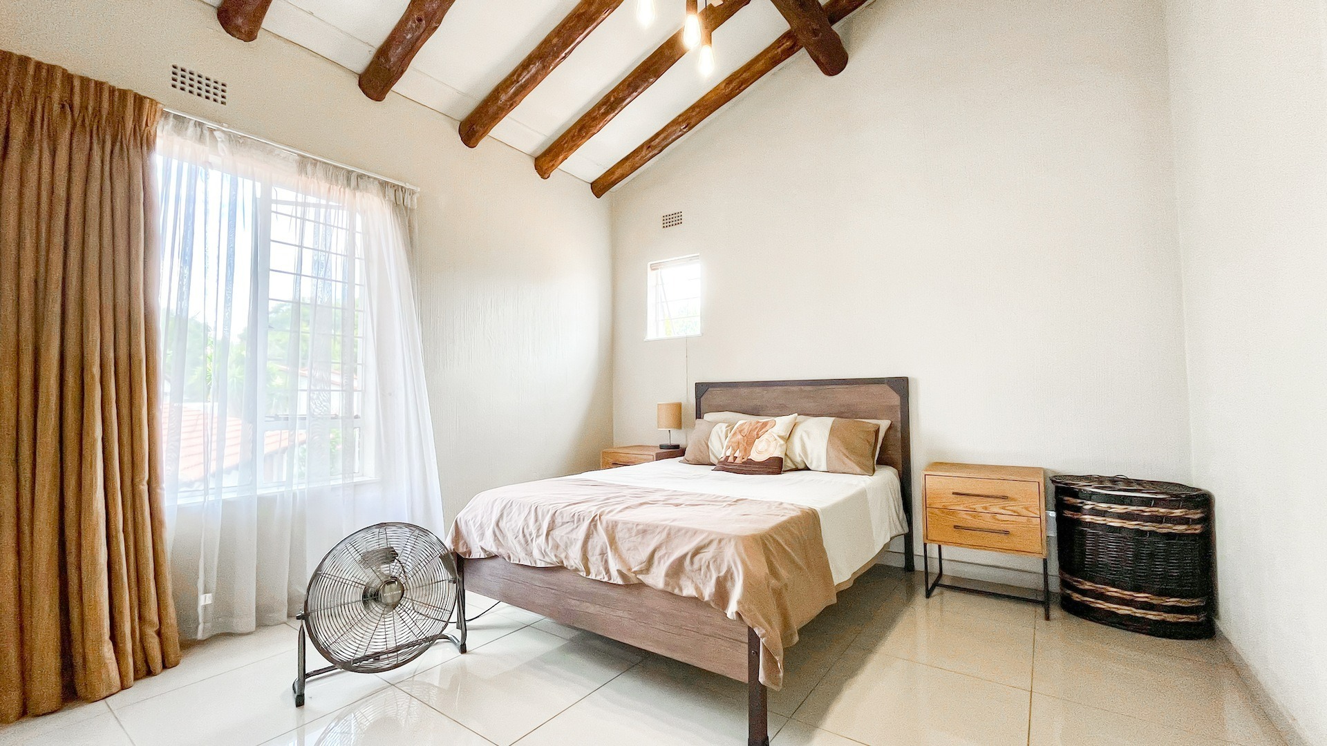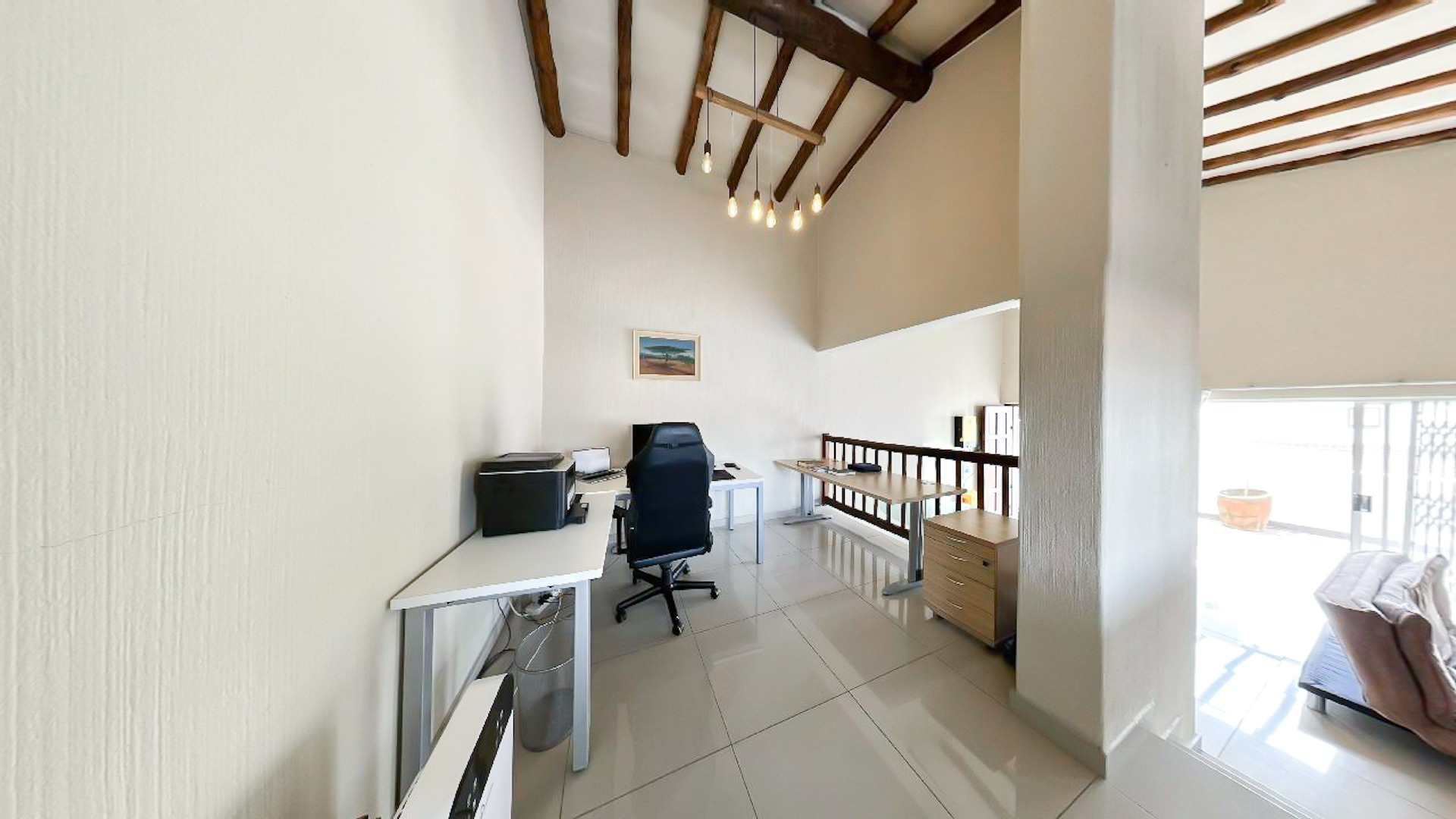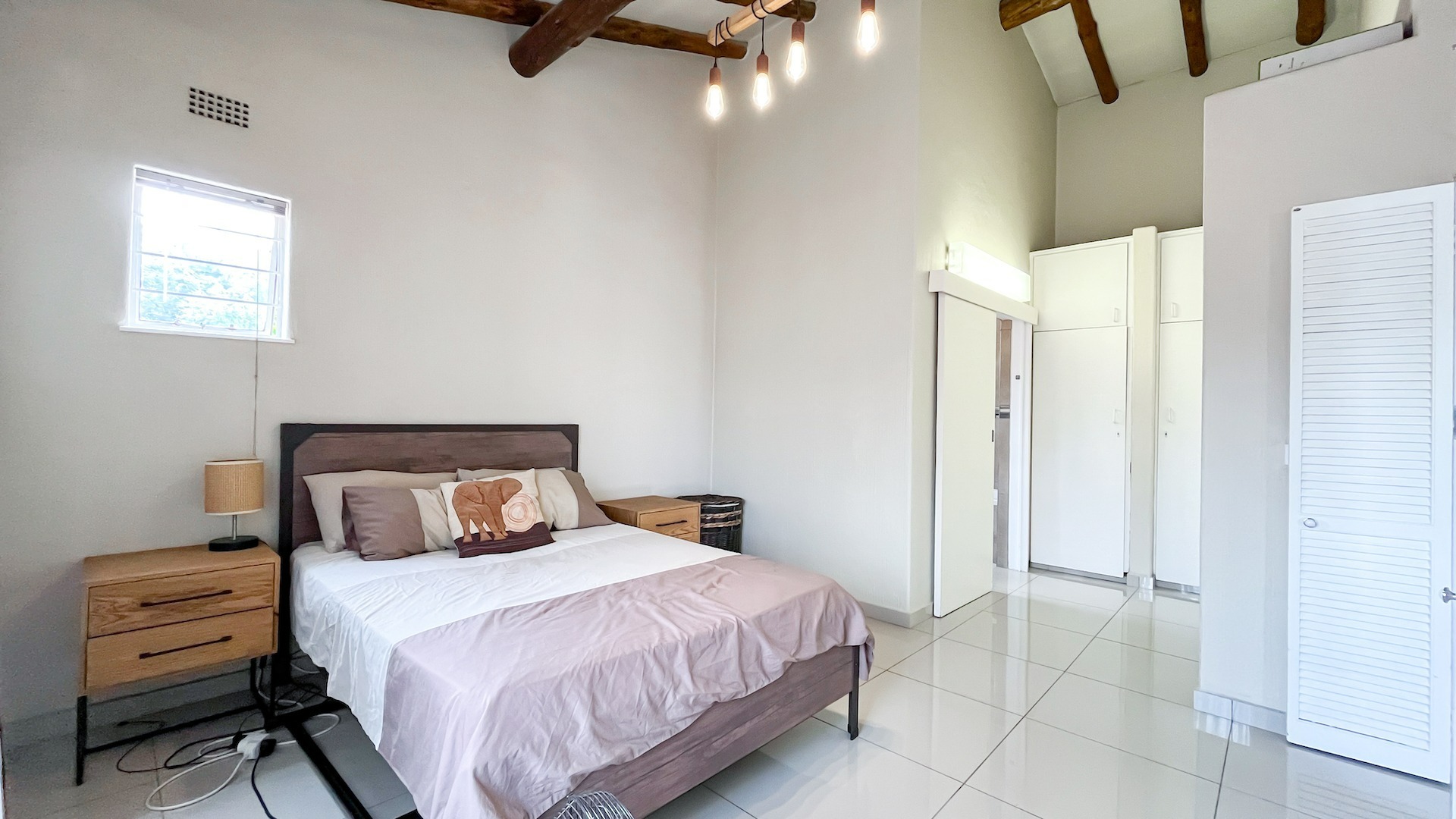 Small flight of stairs leading to totally renovated one bed unit with a garage. From nice sized uncovered patio with built in braai, wooden roof trusses through sliding and front door which opens onto large lounge which can accommodate effortlessly a double couch and dining room table.