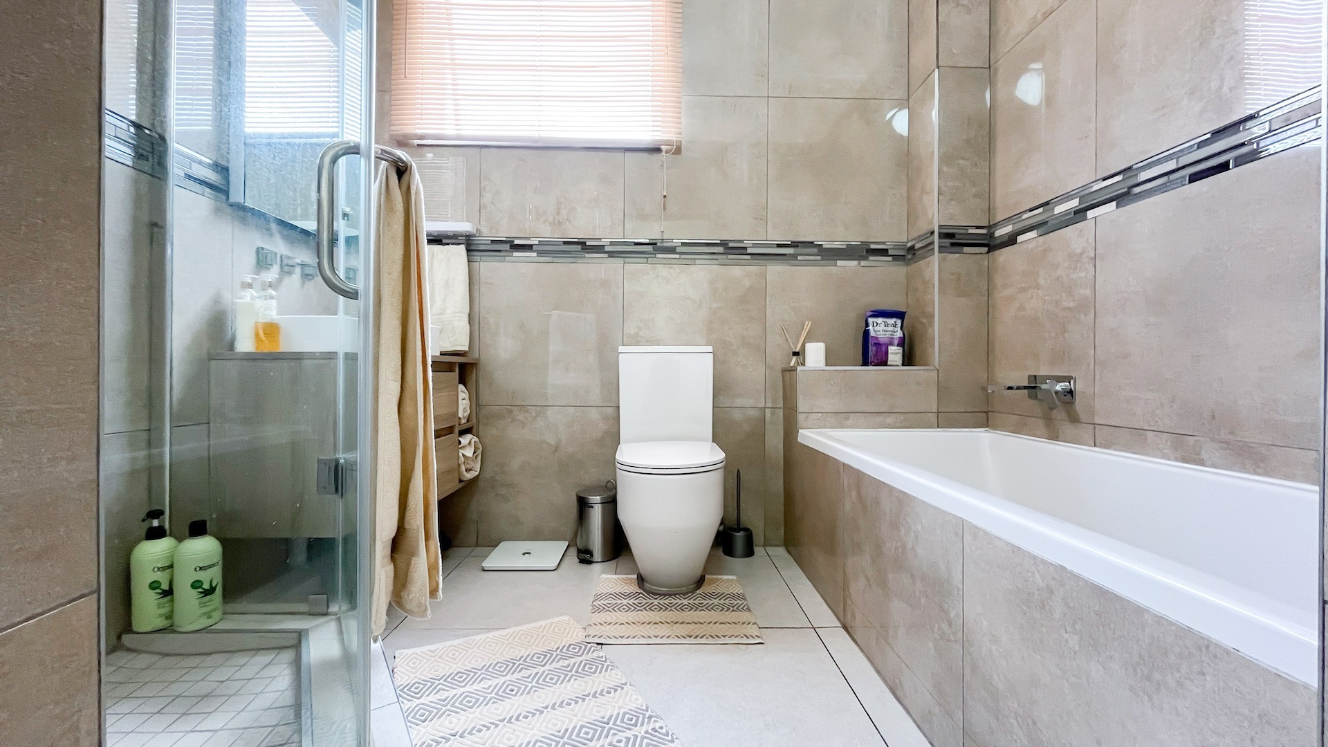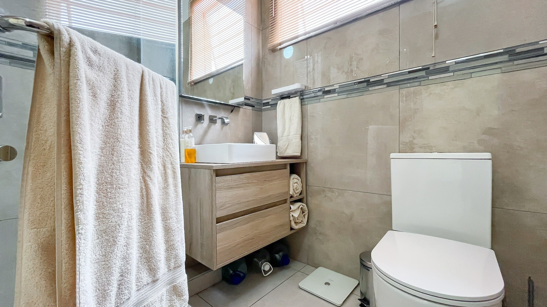 Linen cupboard which houses the washing machine. Designer bathroom, grey porcelain wall tiles centered with tires of stone beading. Hexegonal shower with large flat shower head. Stylish compactum with 2 wooden drawer and vanity mirror.