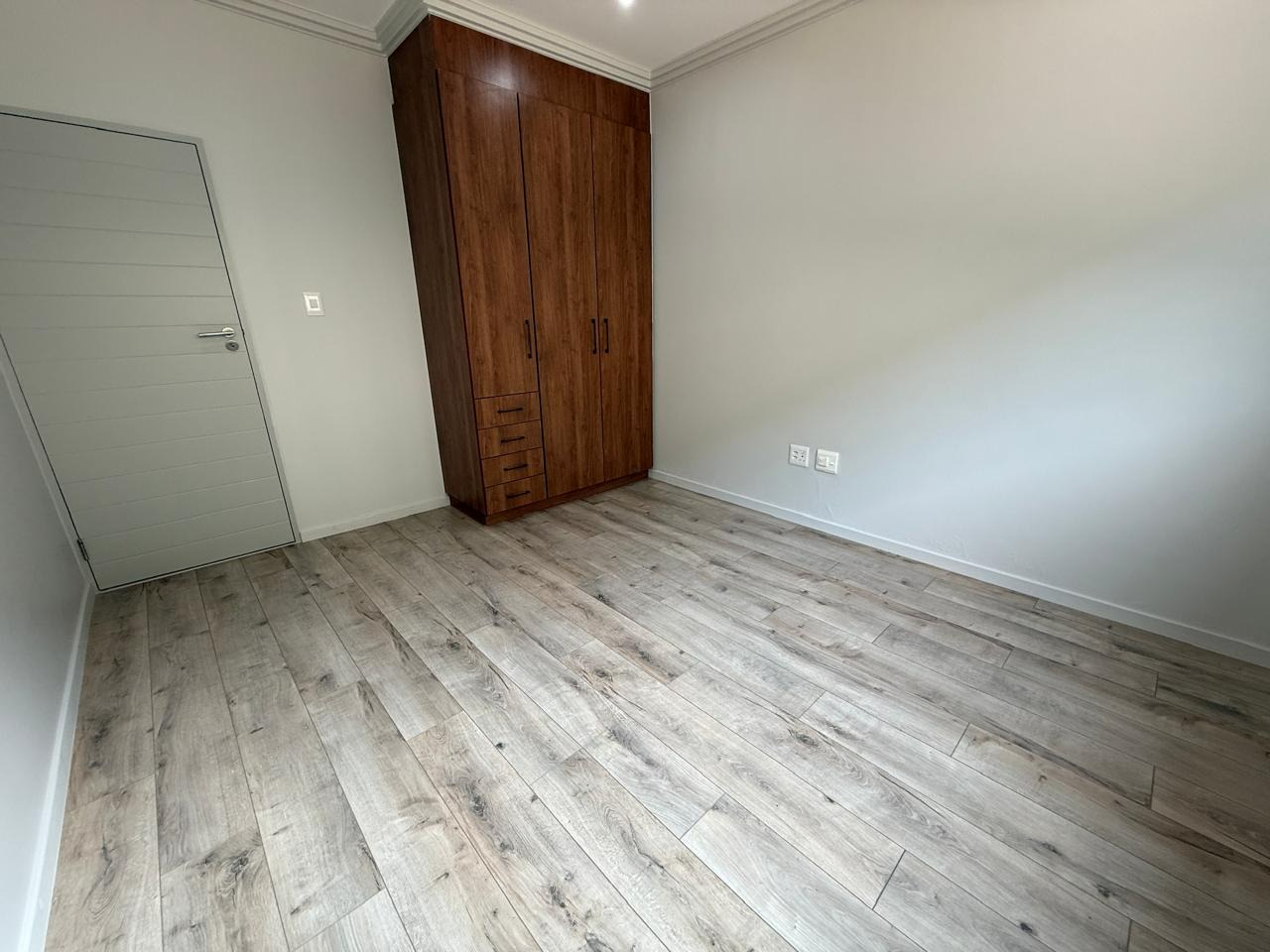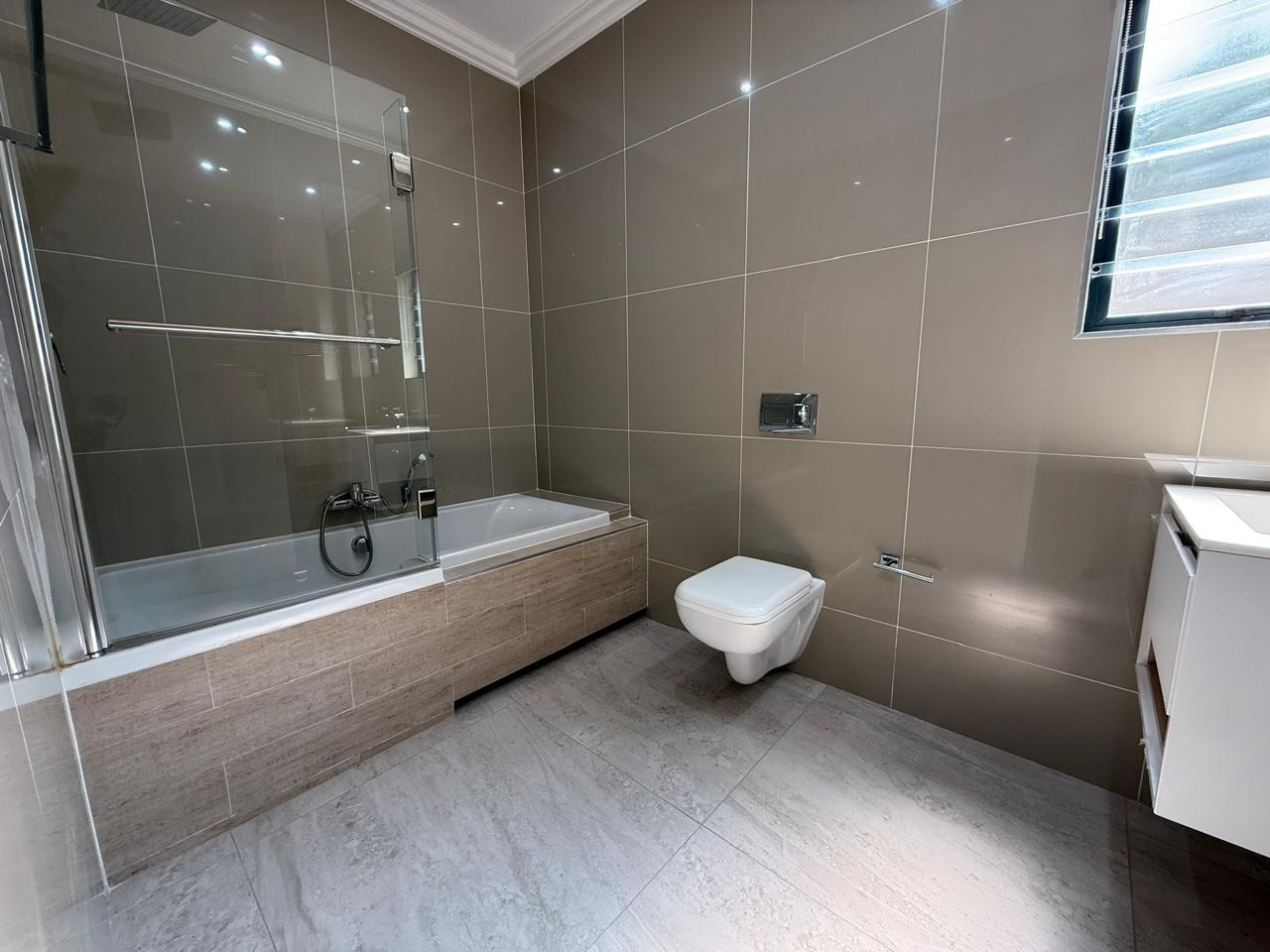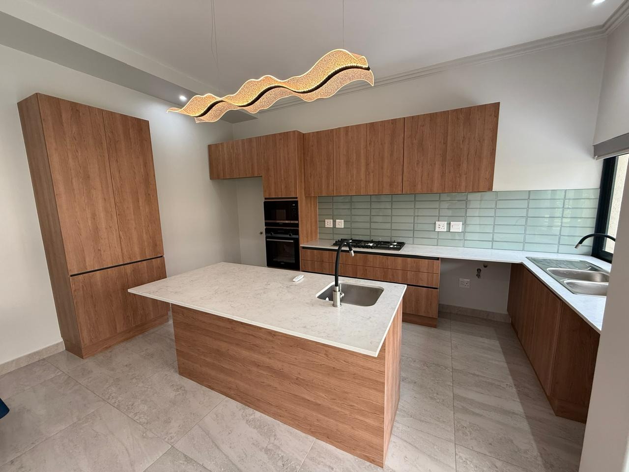 Step into an expansive open-plan living and dining area, where bulkhead lighting and suspended ceilings create a sleek, modern ambiance. The designer kitchen is a culinary enthusiast’s dream, featuring premium countertops, a gas hob, and high-end appliances. The master suite serves as a private sanctuary, complete with a walk-in closet and a beautifully appointed en-suite bathroom. High-quality tiling and laminated flooring in all three bedrooms add a touch of warmth to the home’s polished aesthetic.