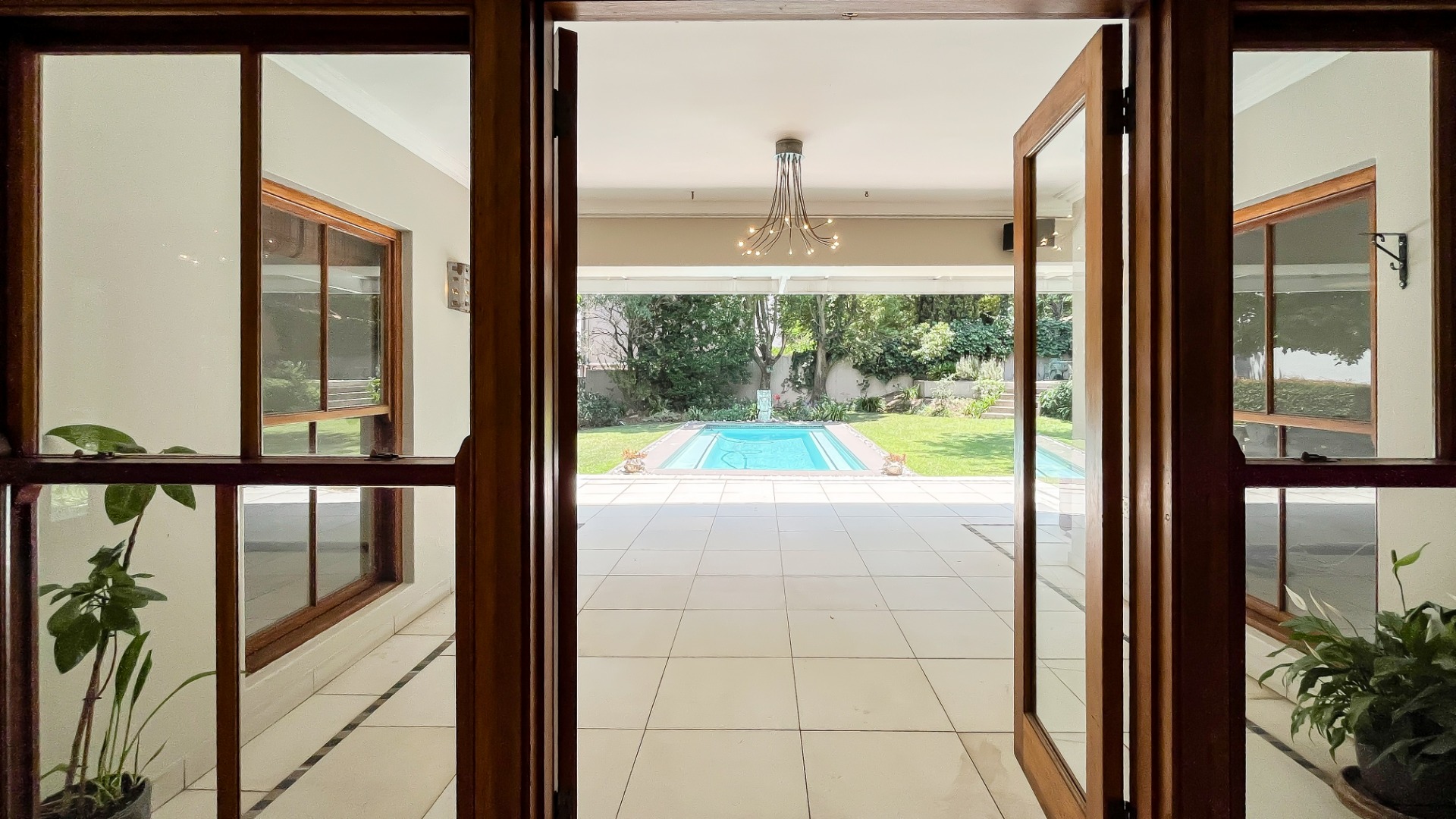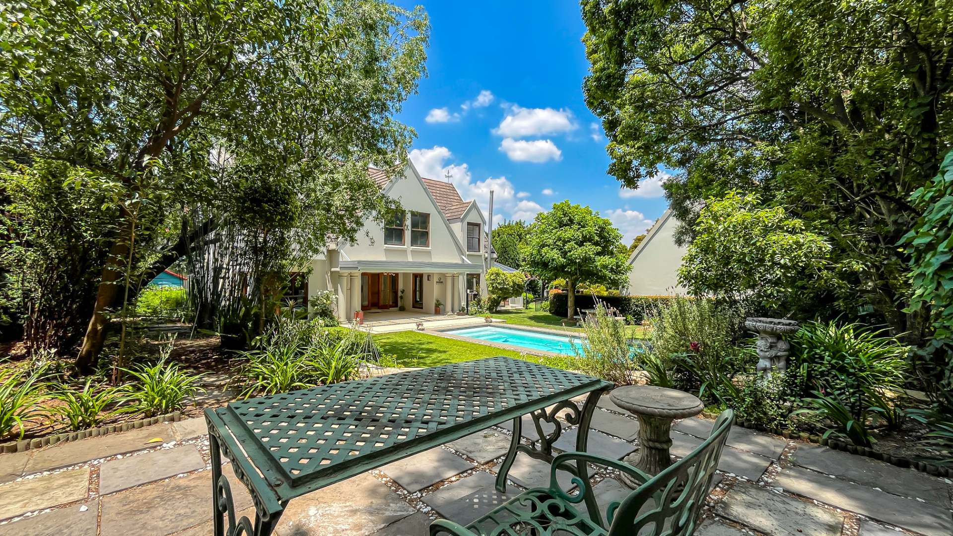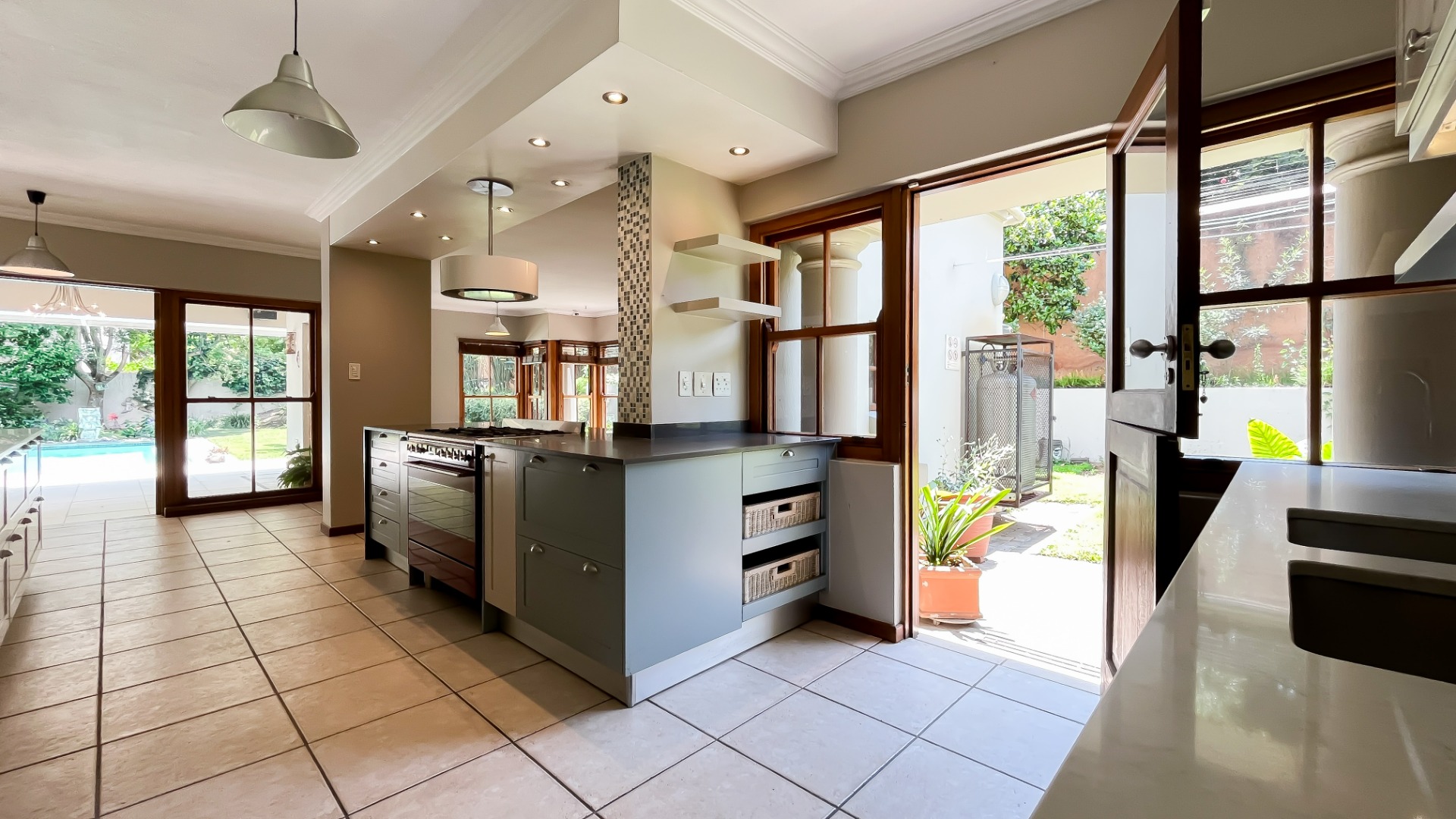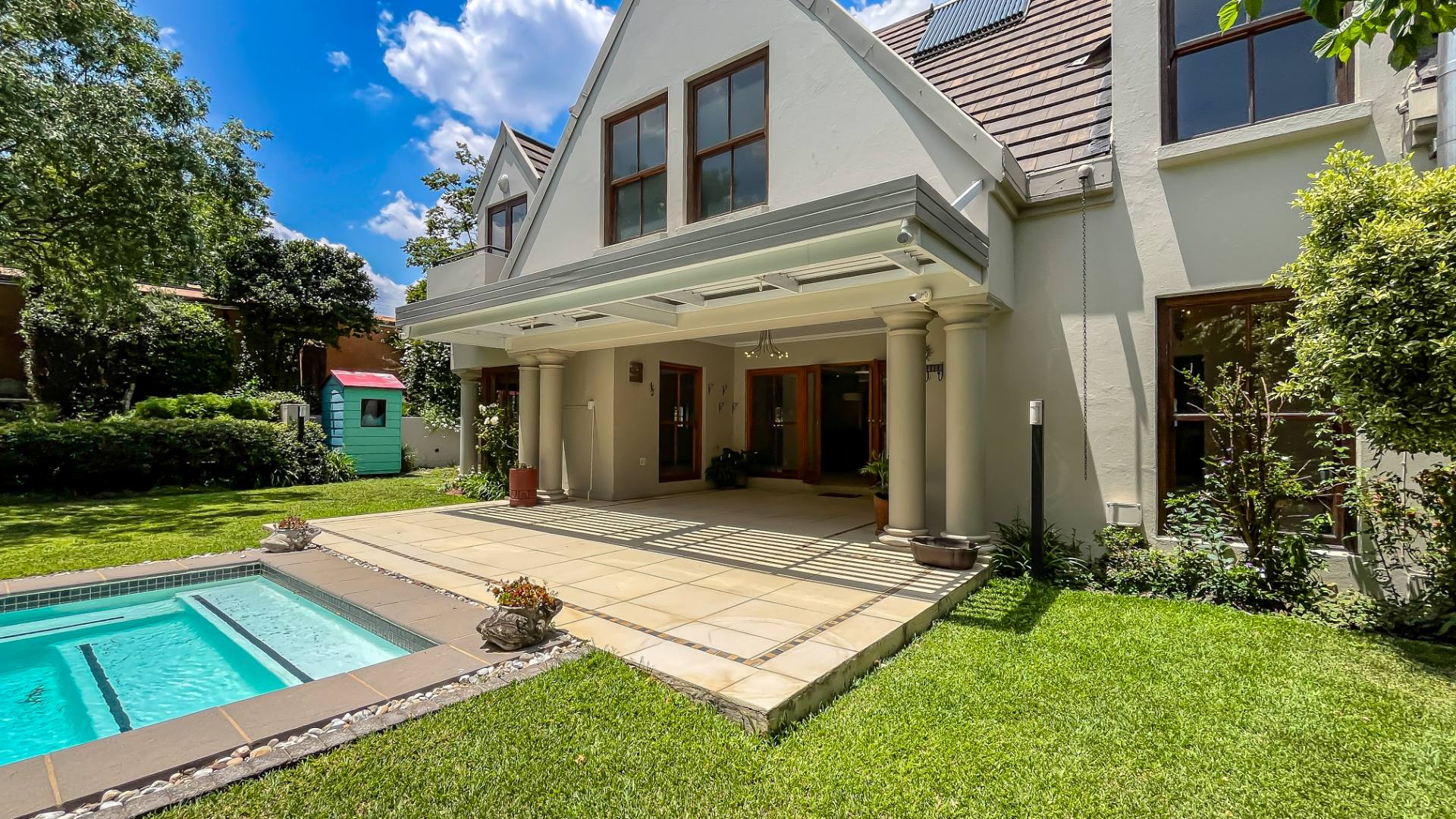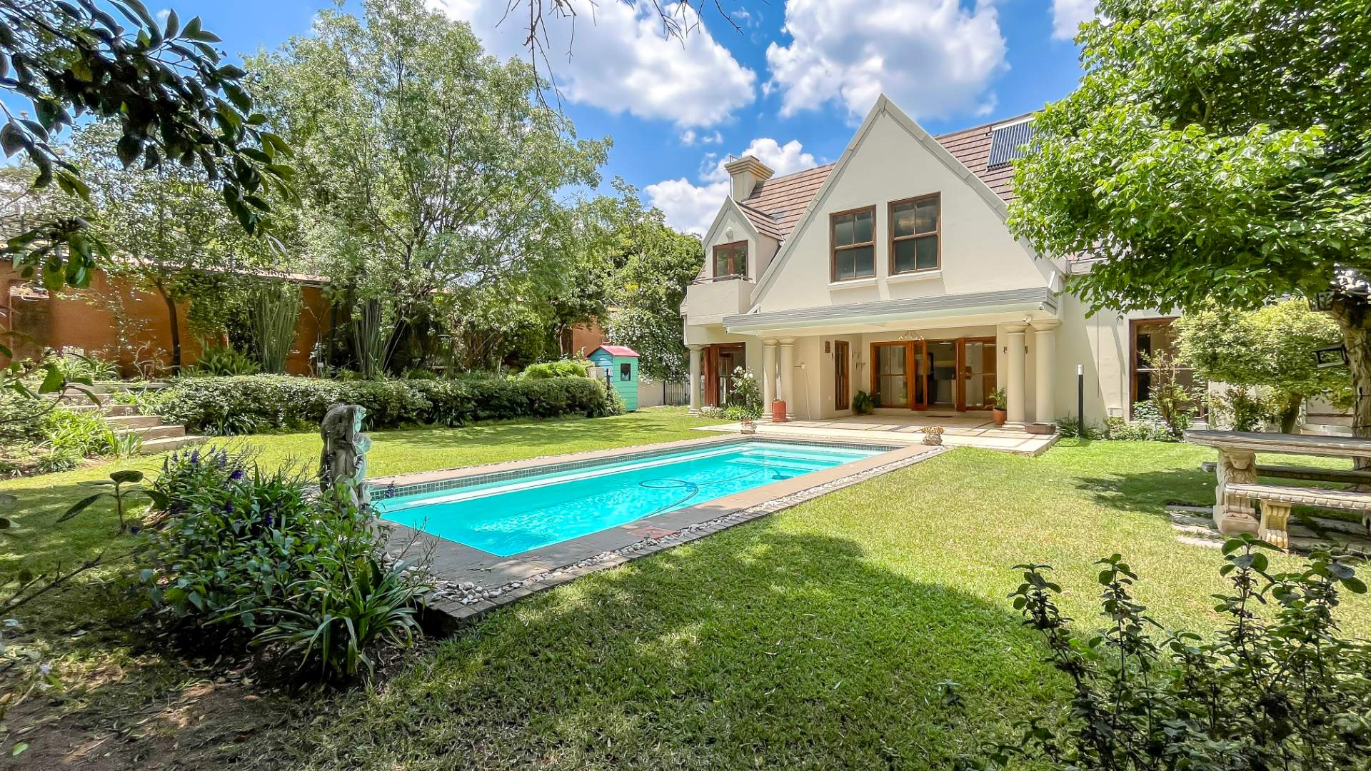 Accommodation comprises four well-proportioned bedrooms and two and a half bathrooms, including a private en-suite, ensuring comfort and privacy. The exterior is equally impressive, set on a generous 1561 sqm erf featuring an expansive, meticulously maintained garden with mature trees. A private swimming pool and a spacious covered patio provide ideal settings for outdoor relaxation and entertaining. A double garage and eight additional parking spaces offer ample vehicle accommodation.