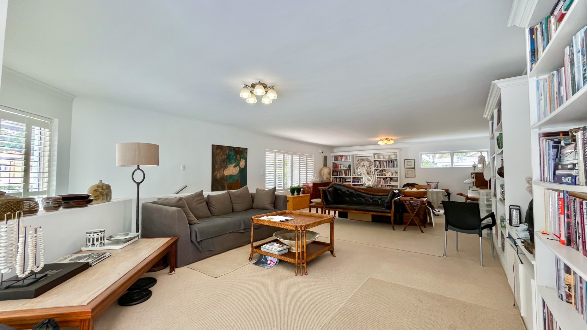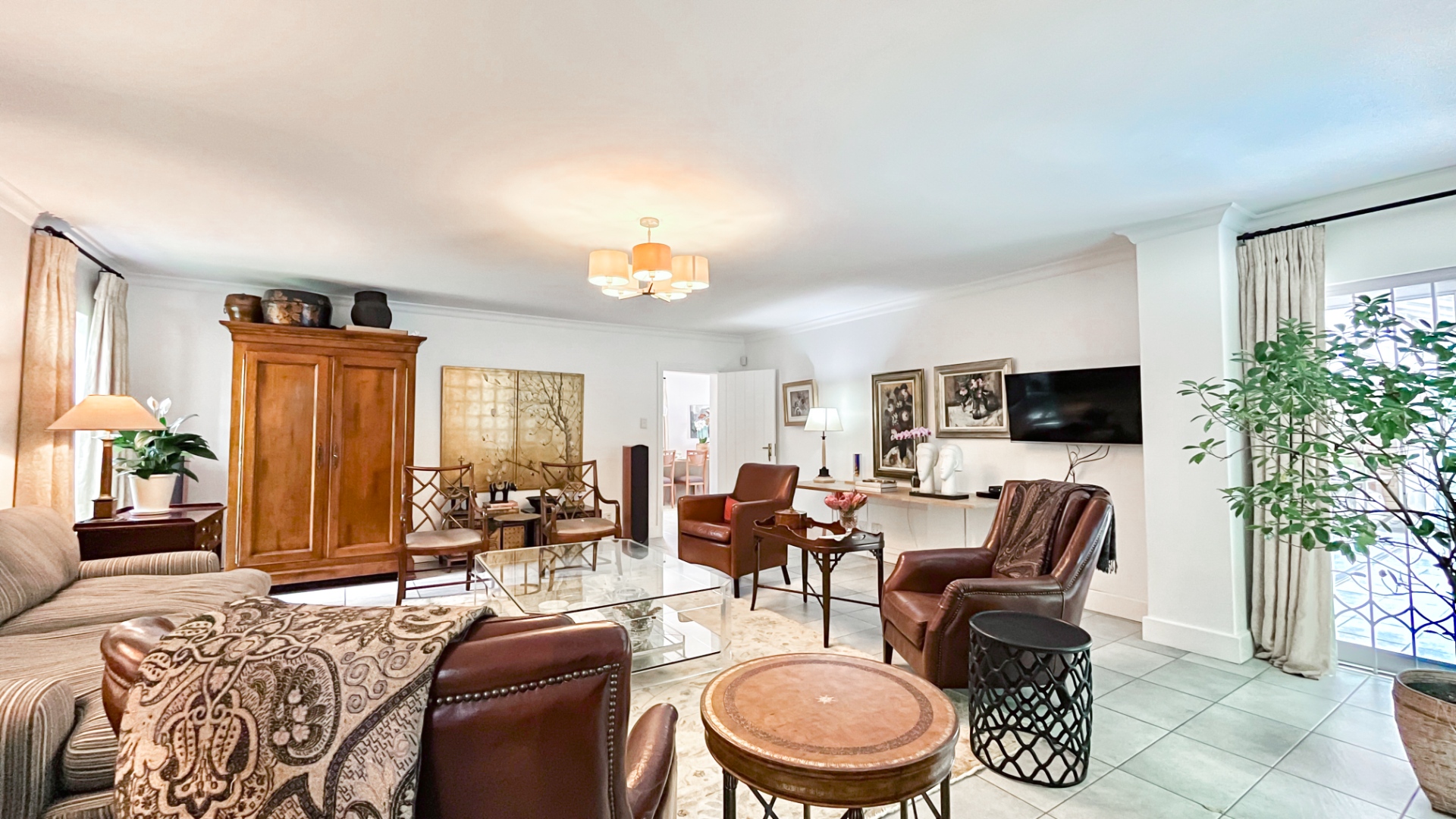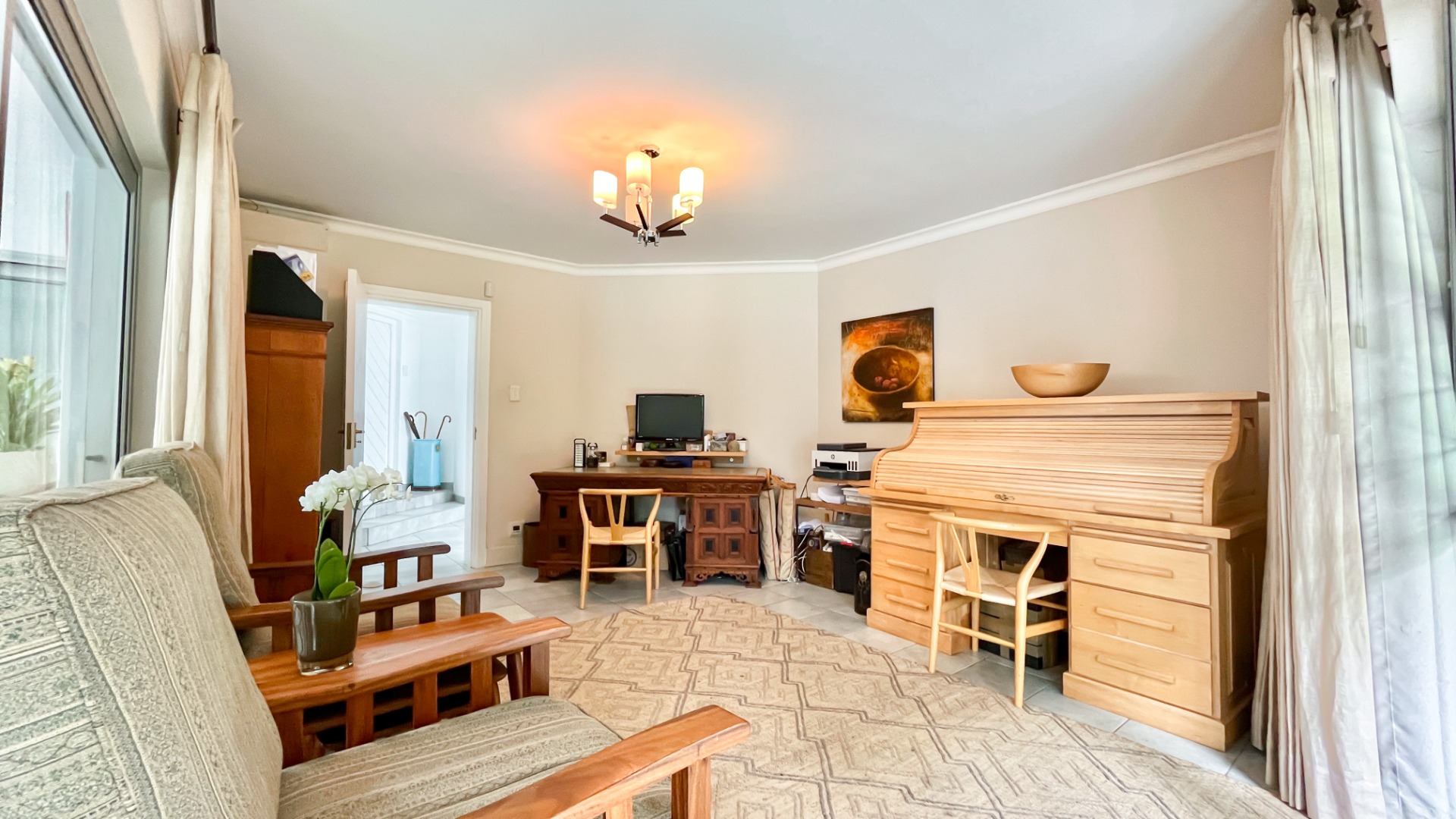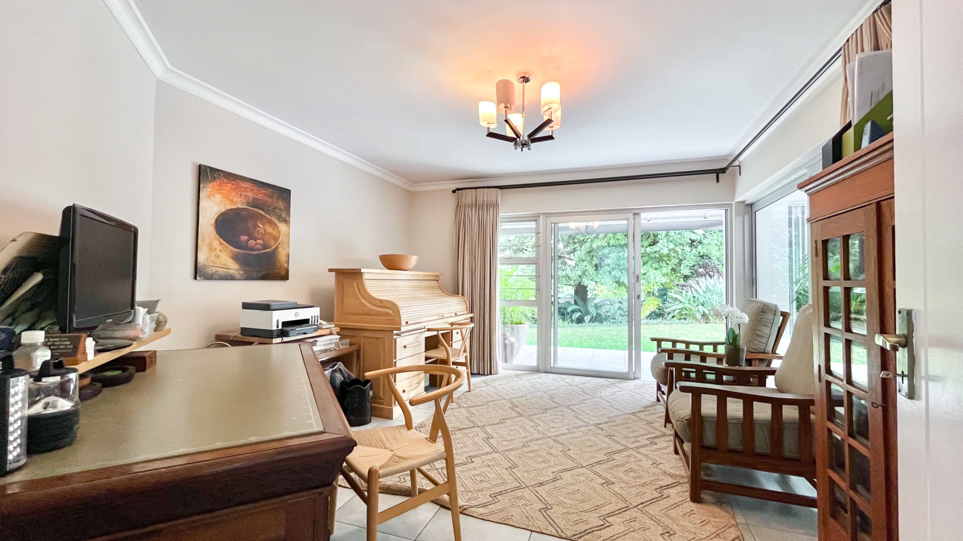 Upstairs, a family room overlooks the garden and pool, providing a serene retreat for relaxation and leisure.