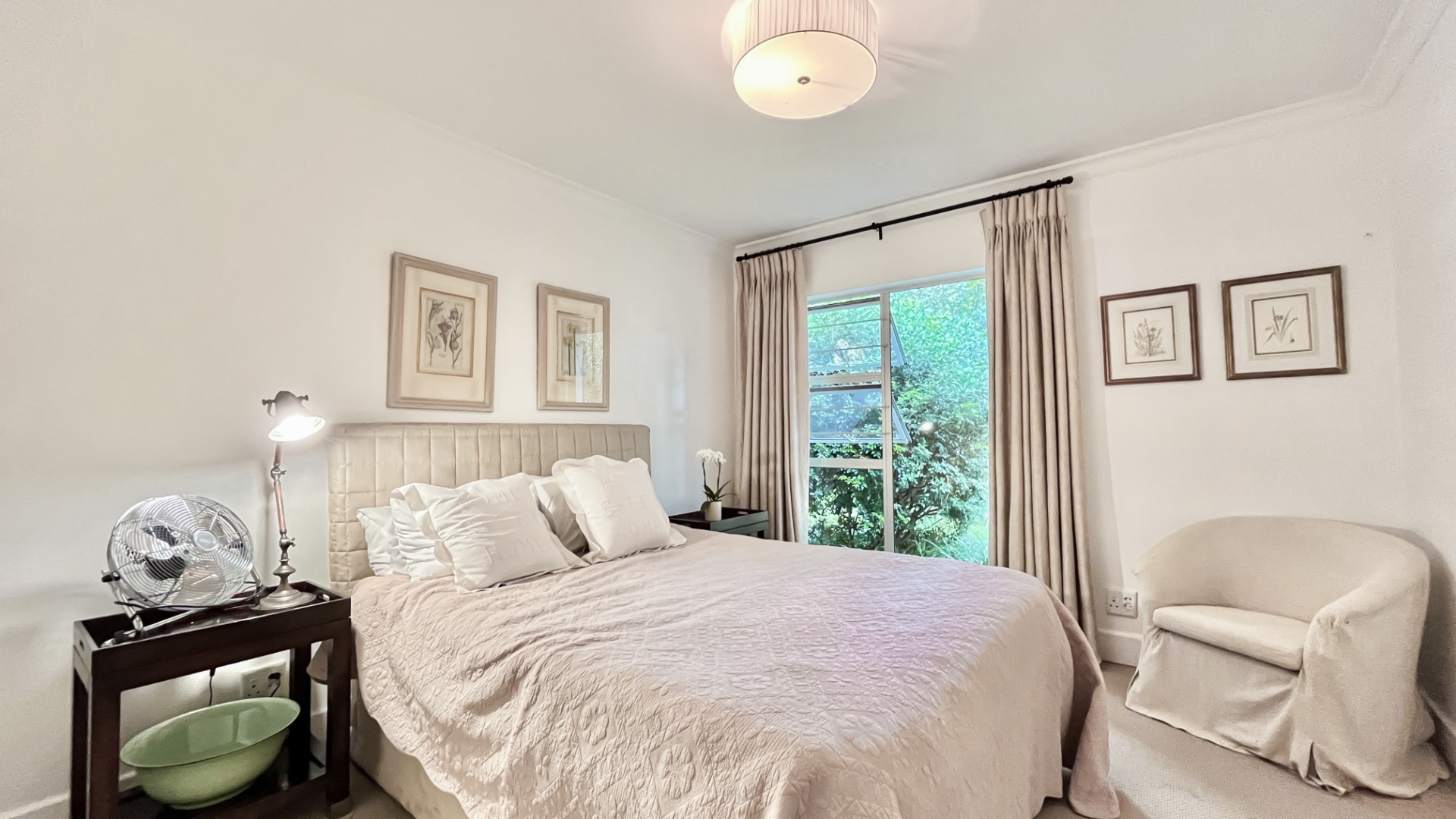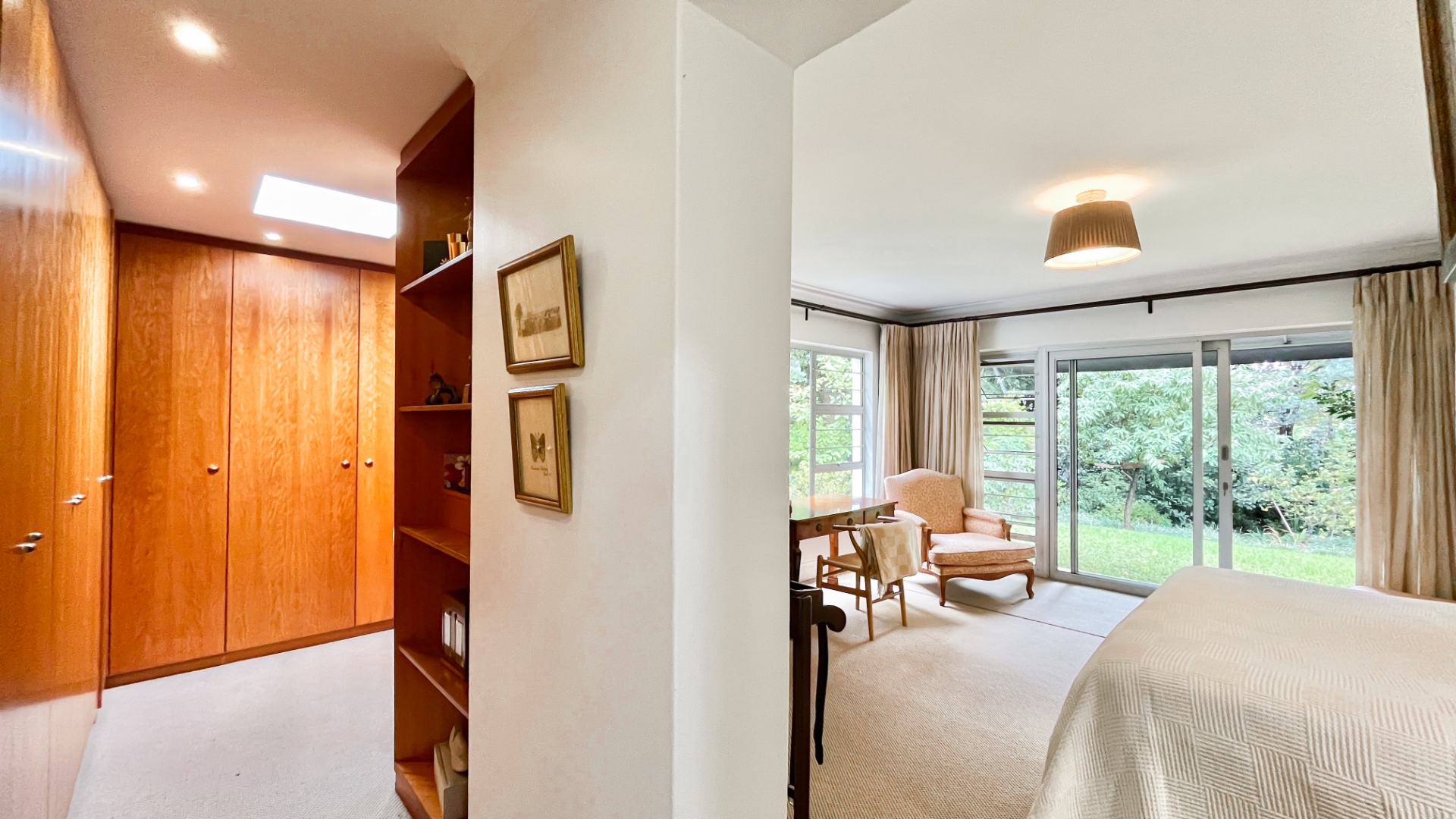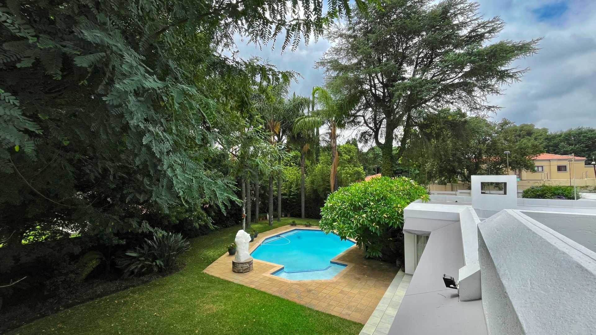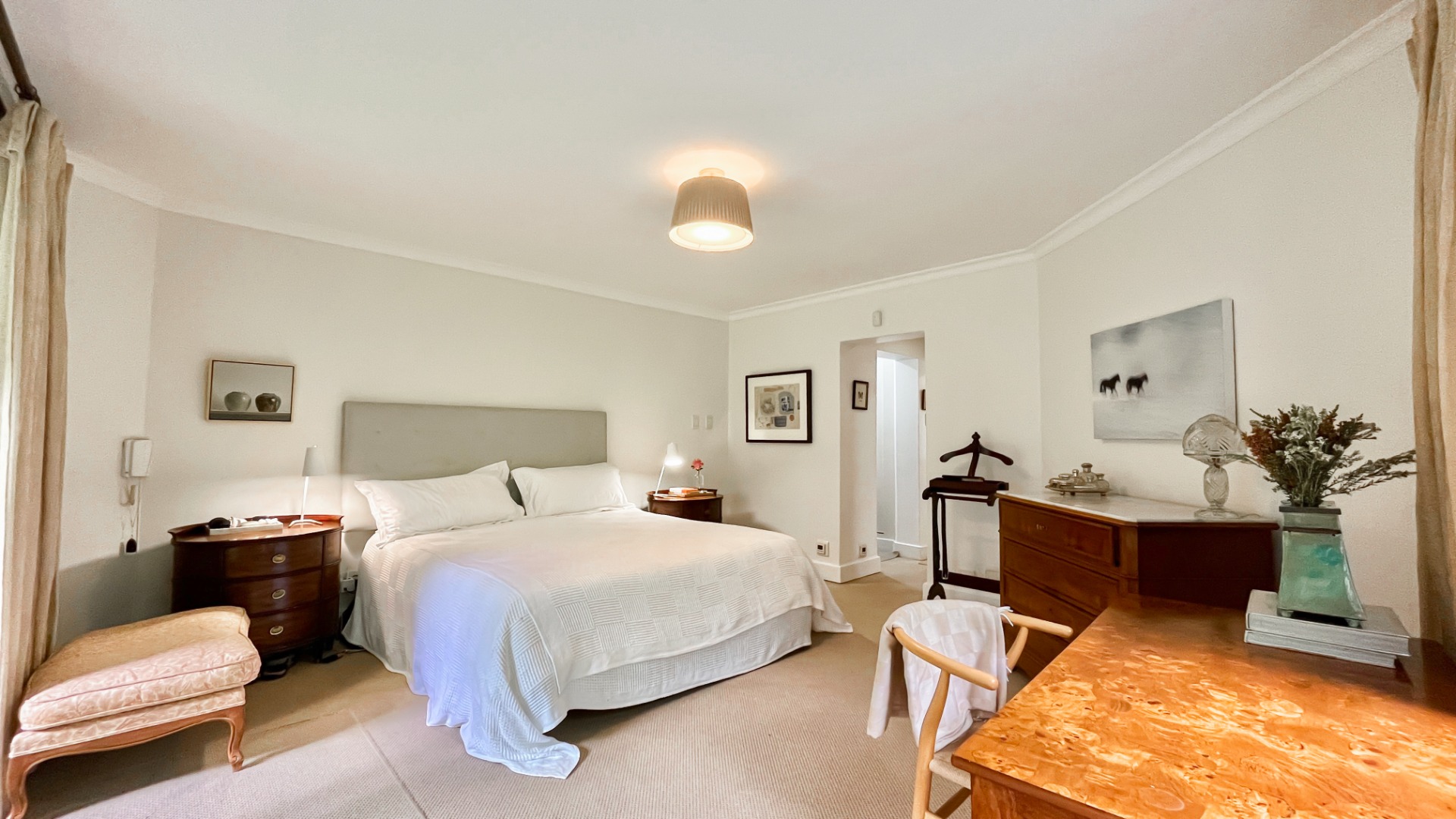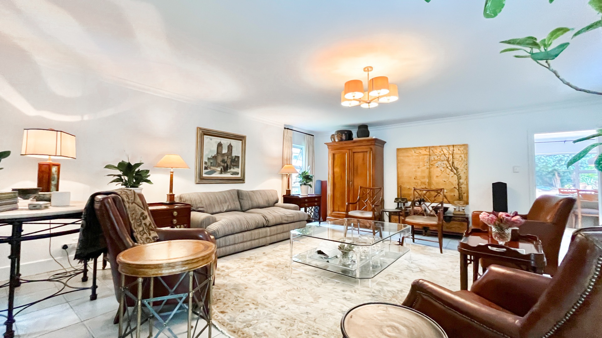 Upstairs, a family room overlooks the garden and pool, providing a serene retreat for relaxation and leisure.