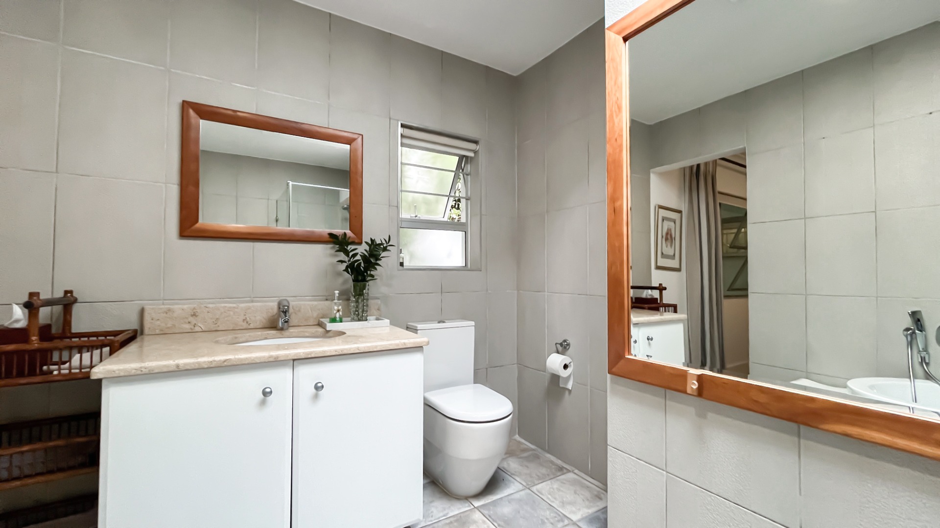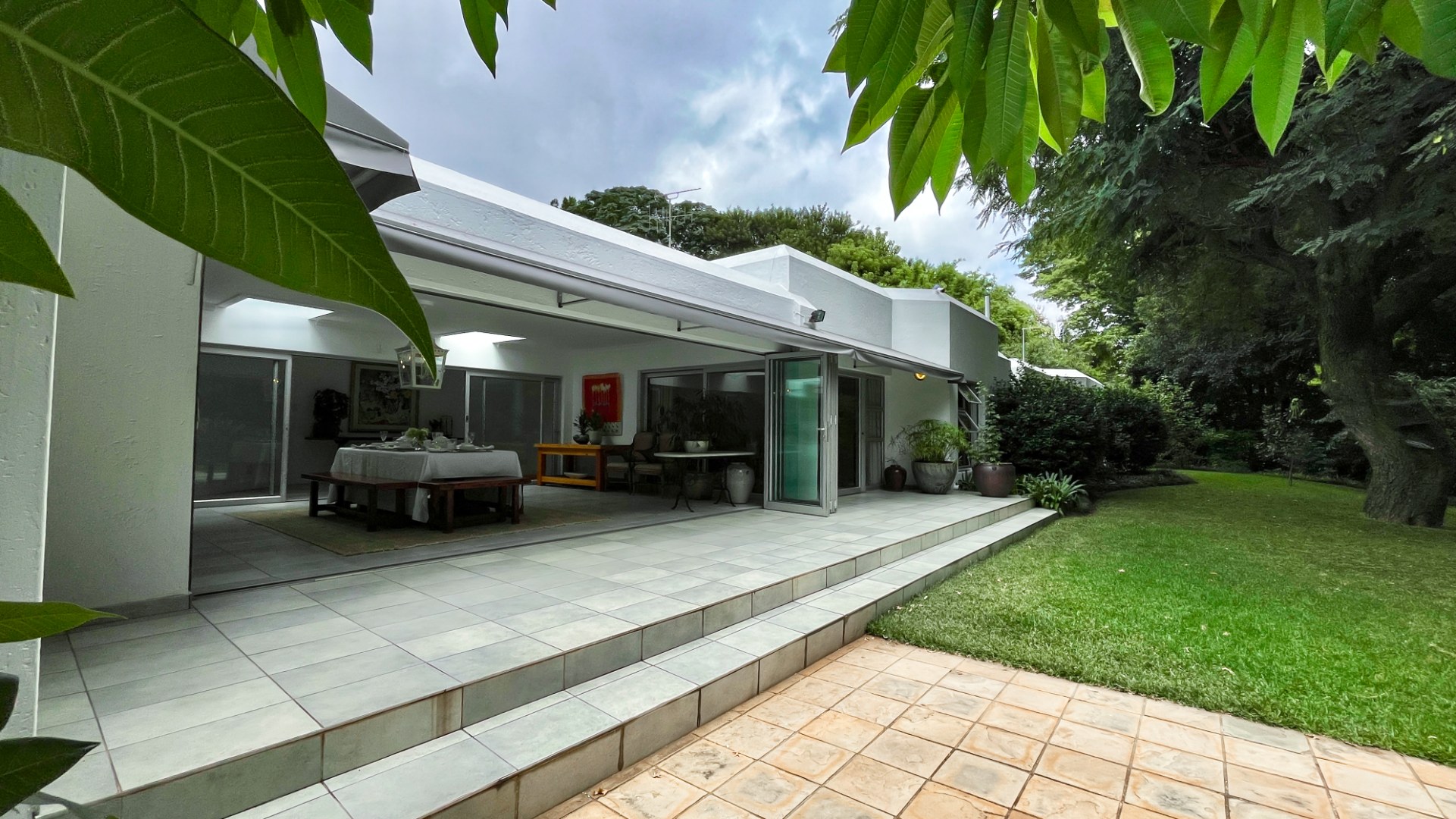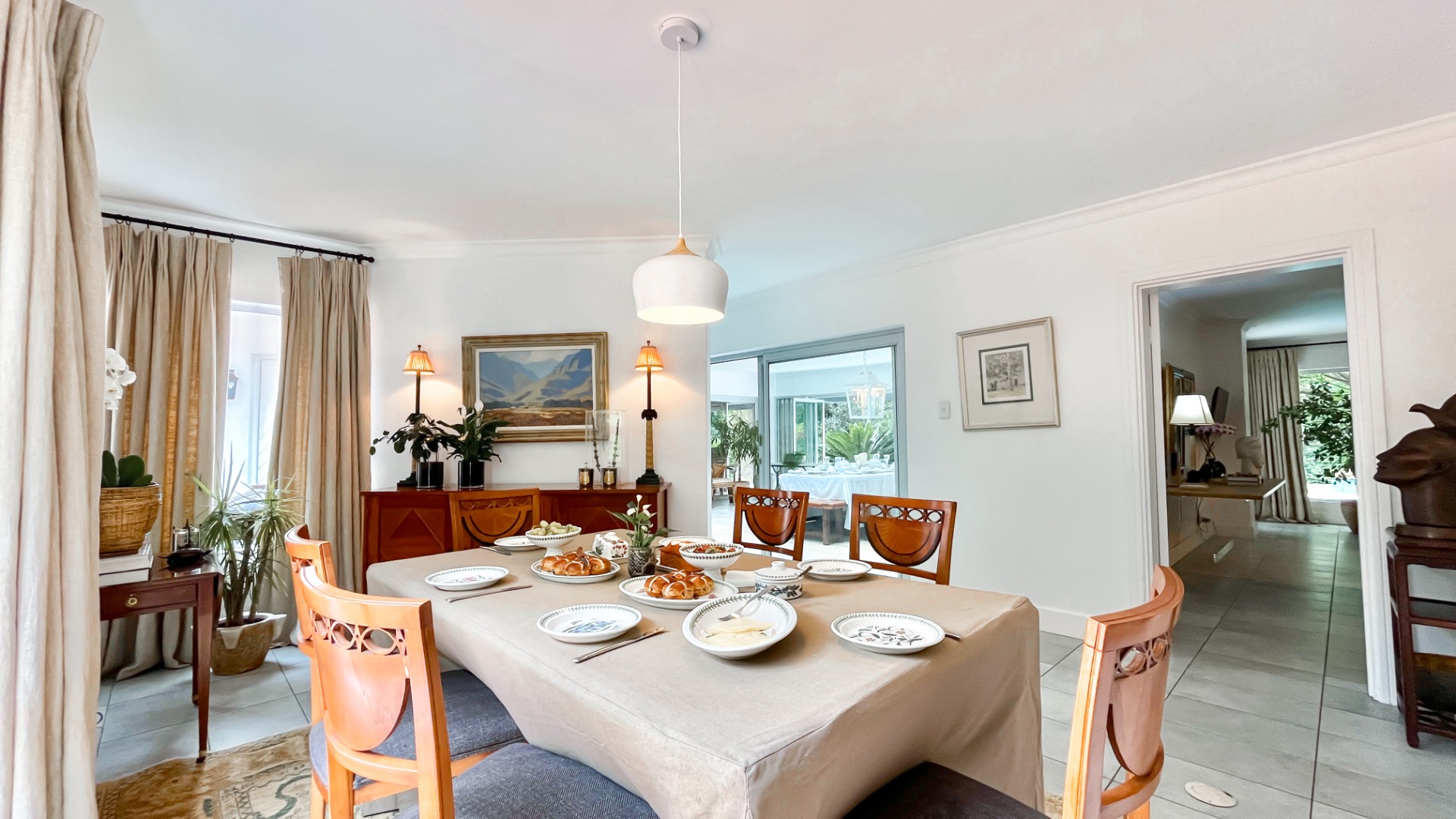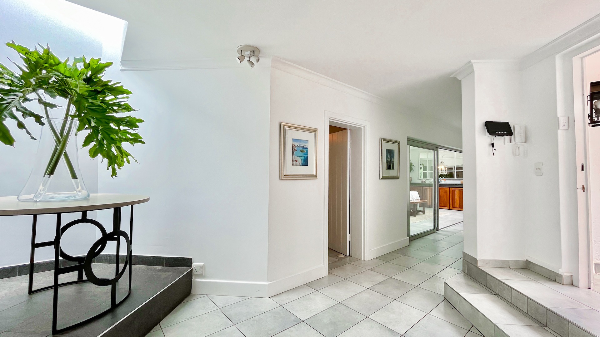 Upstairs, a family room overlooks the garden and pool, providing a serene retreat for relaxation and leisure.