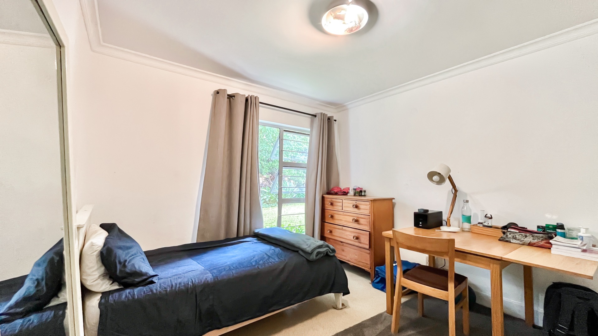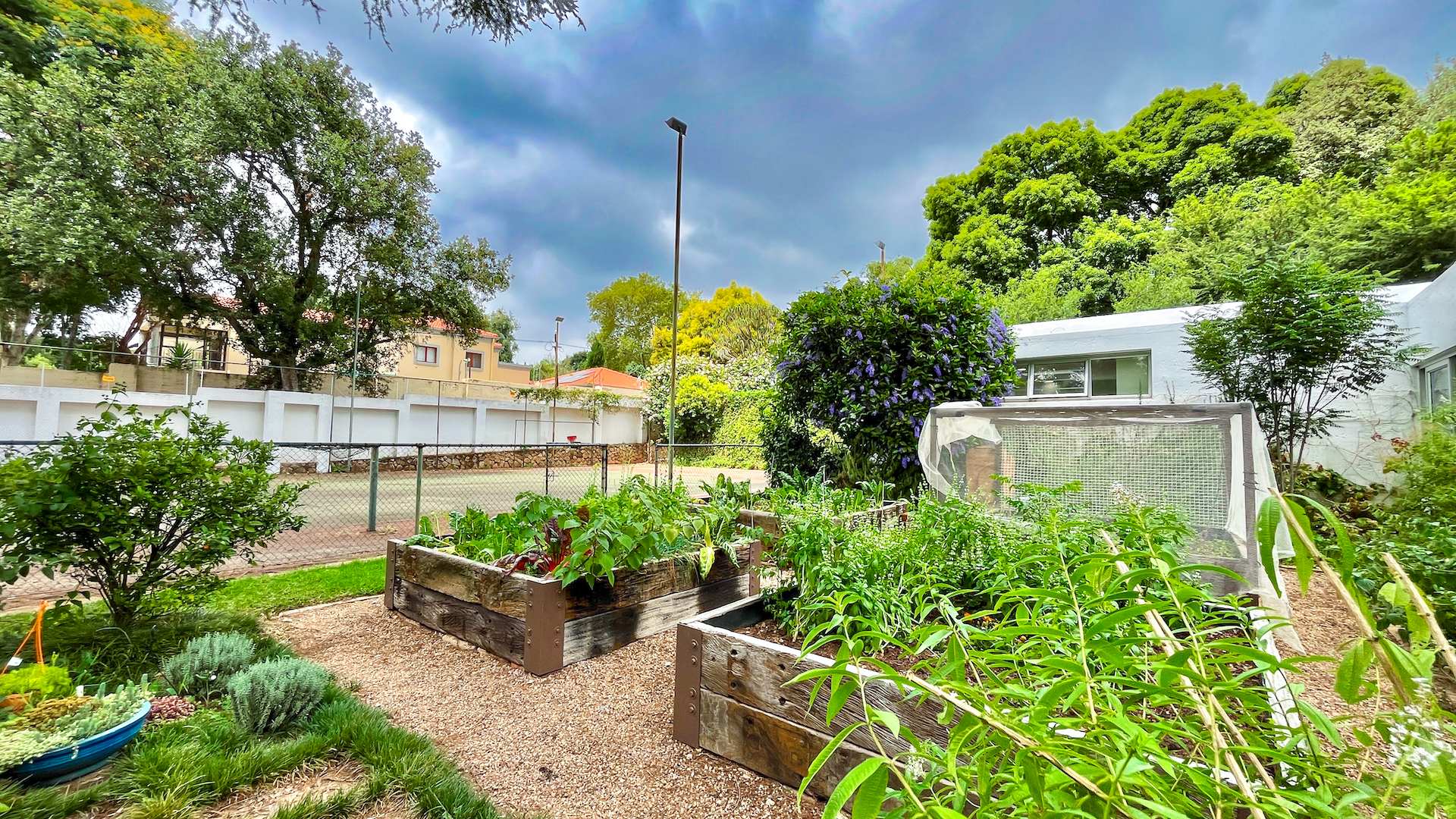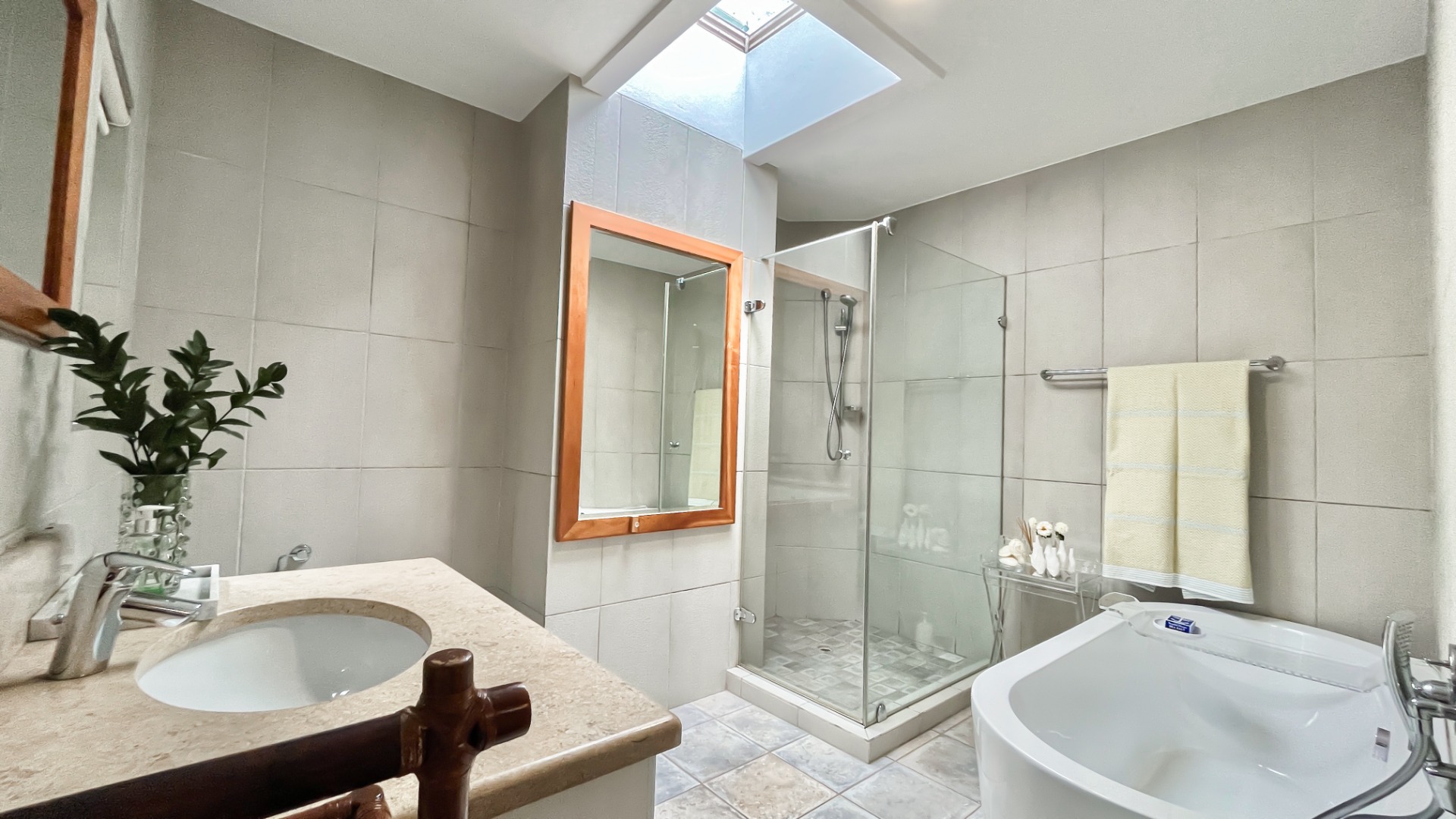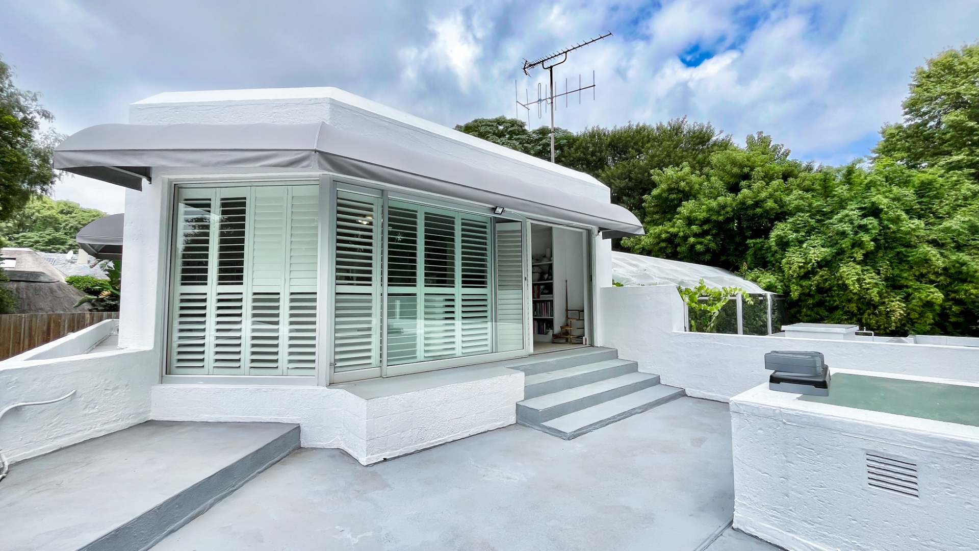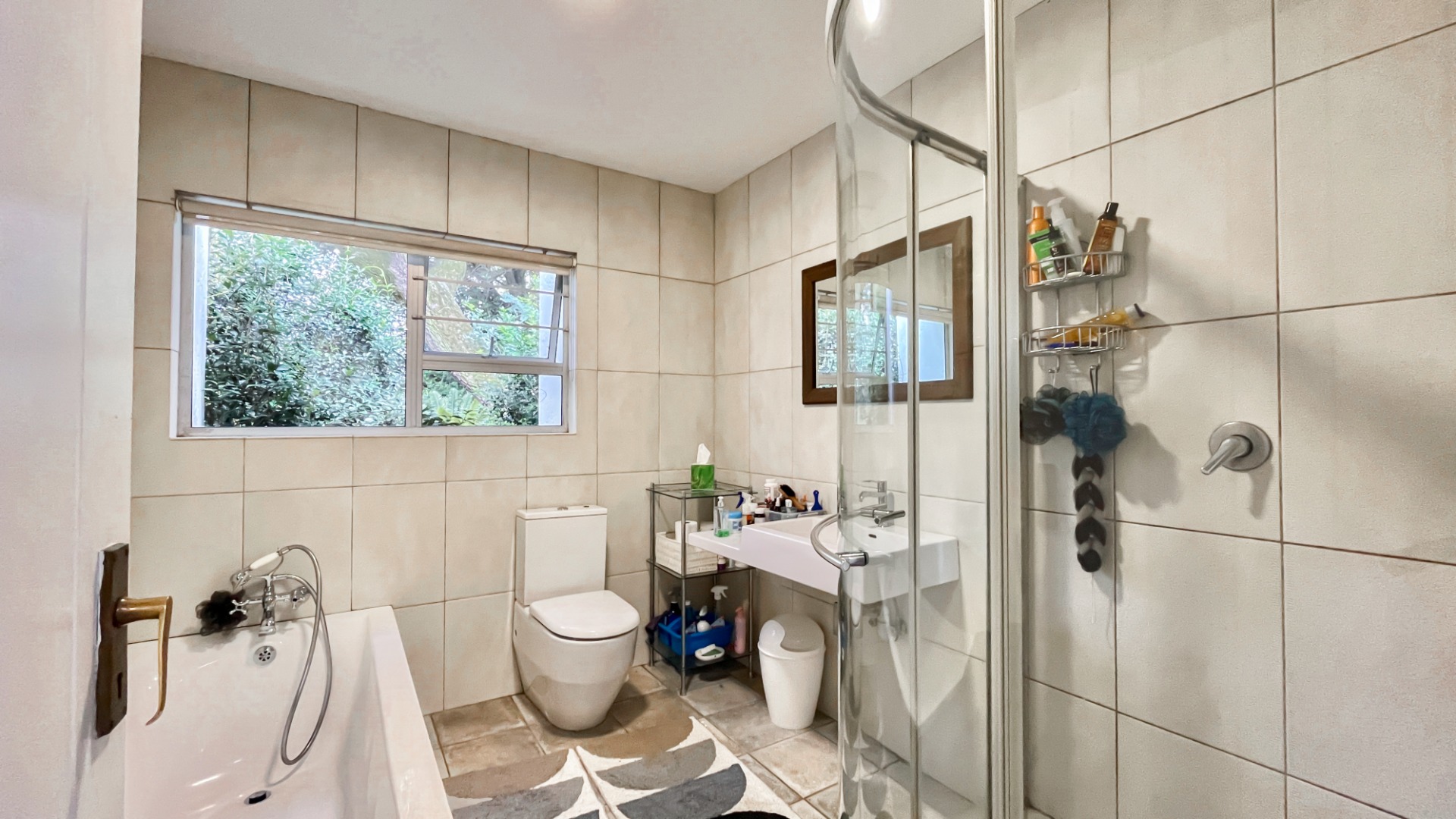 Upstairs, a family room overlooks the garden and pool, providing a serene retreat for relaxation and leisure.
