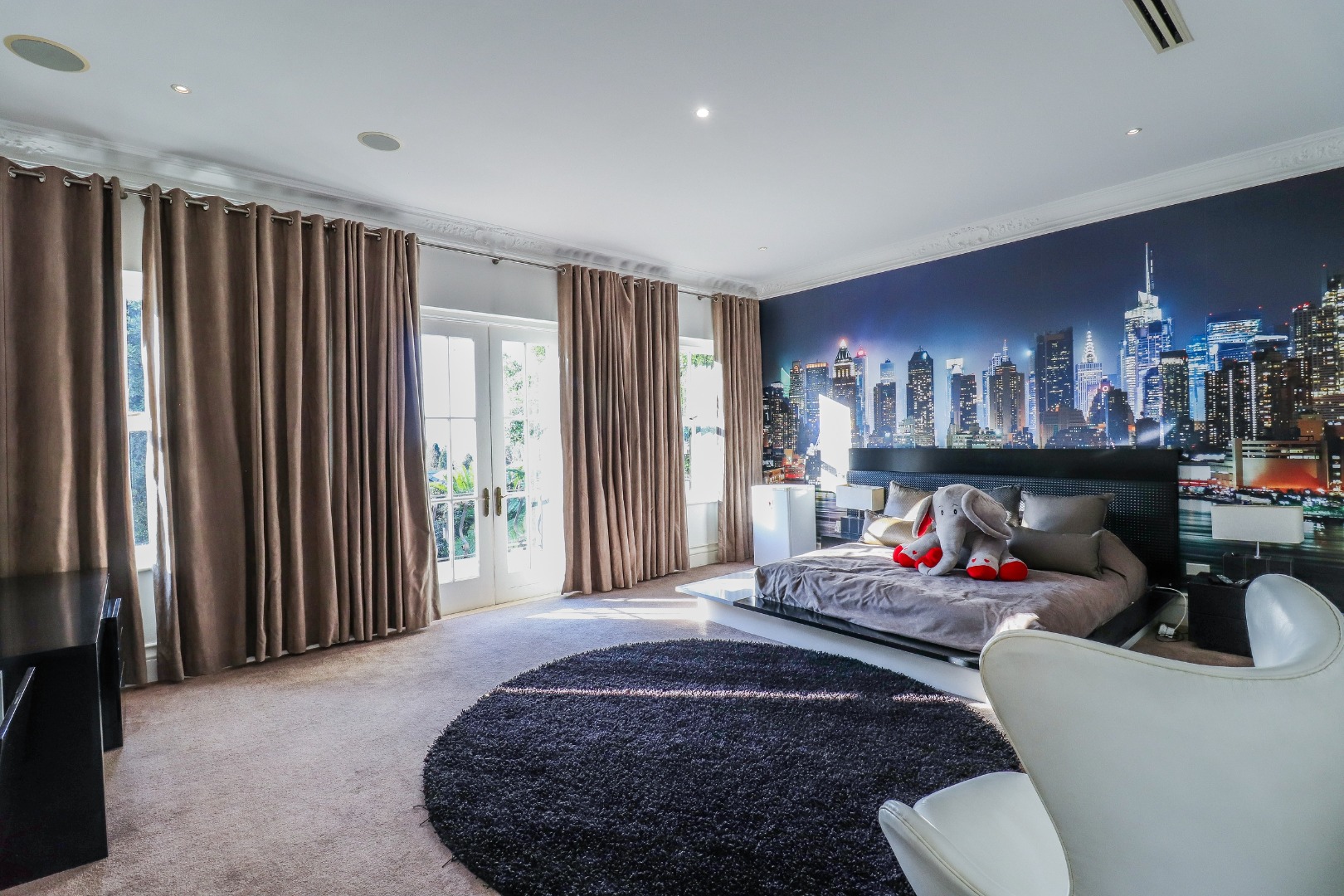 The accommodations redefine indulgence. A spacious en-suite guest bedroom on the main floor offers privacy and convenience. Upstairs, four opulent en-suite bedrooms await, each with full bathrooms, walk-through closets, and private balconies overlooking lush gardens. The master suite is a retreat unto itself, featuring a walk-in closet, gym/study, gas fireplace, underfloor heating, a luxurious soaking tub, a double shower/steam room, and even a safe room.