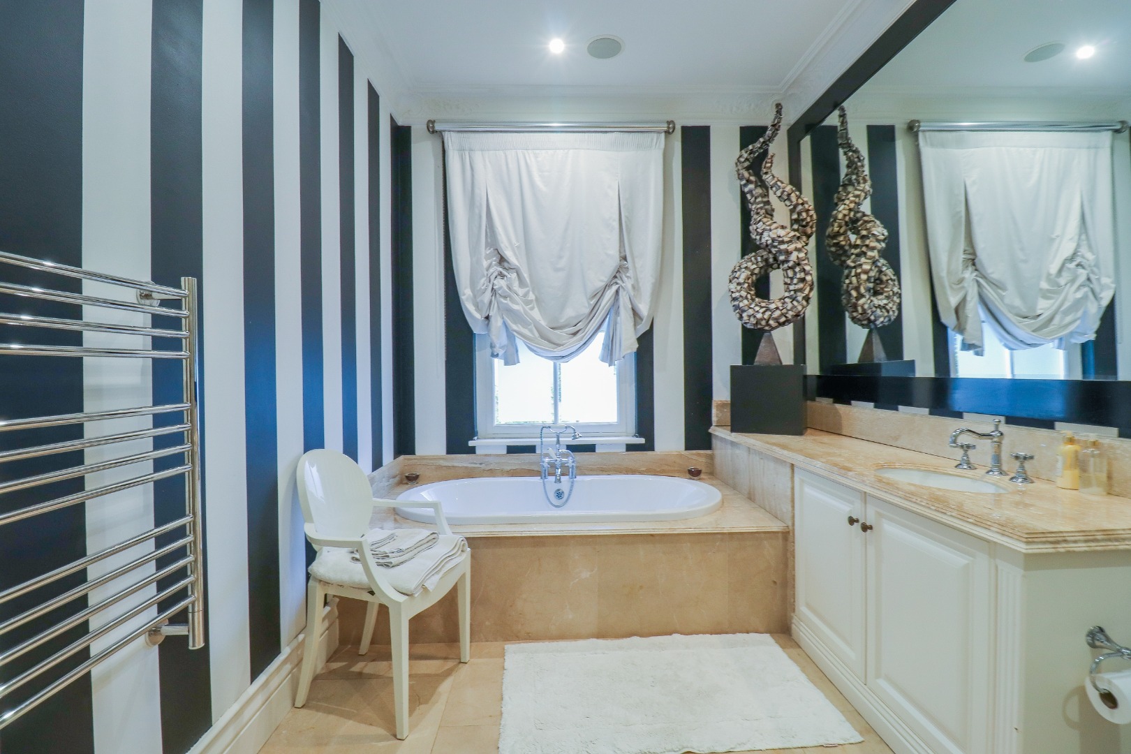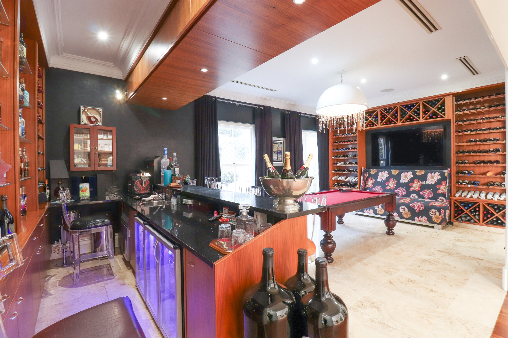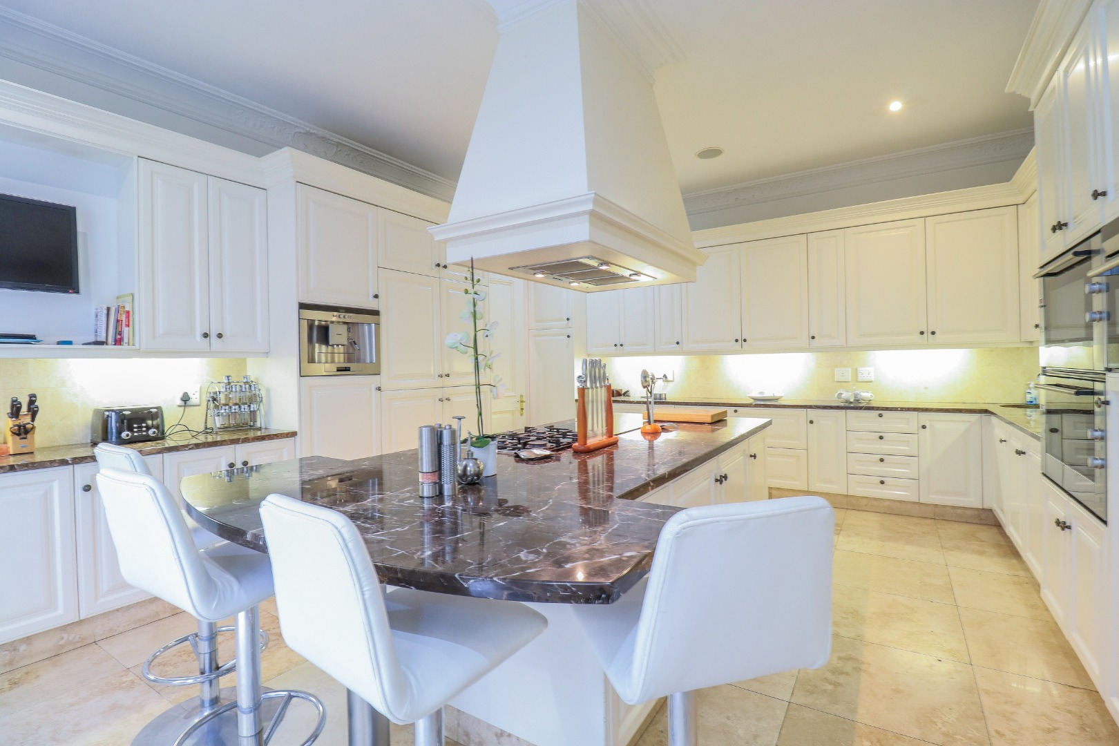Prepare culinary masterpieces in the state-of-the-art kitchen featuring granite countertops, a combination of gas and electric hobs, a coffee machine, and ample storage. The separate scullery ensures practicality with built-in fridges and freezers.