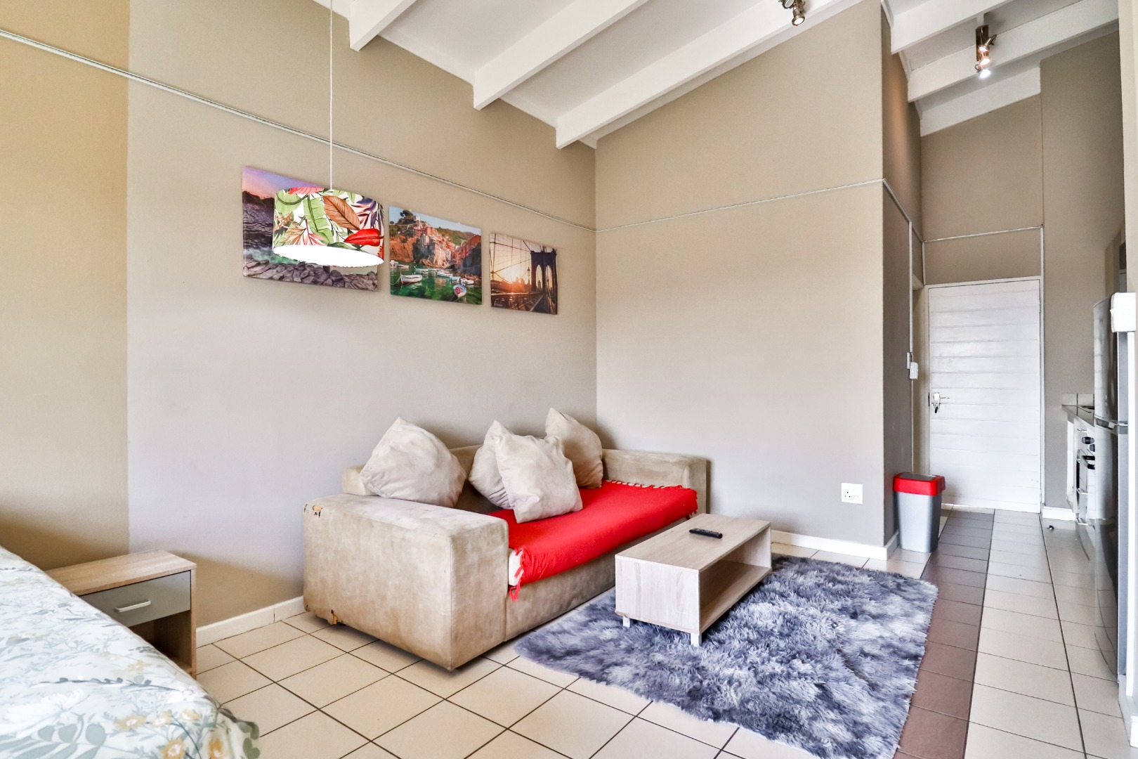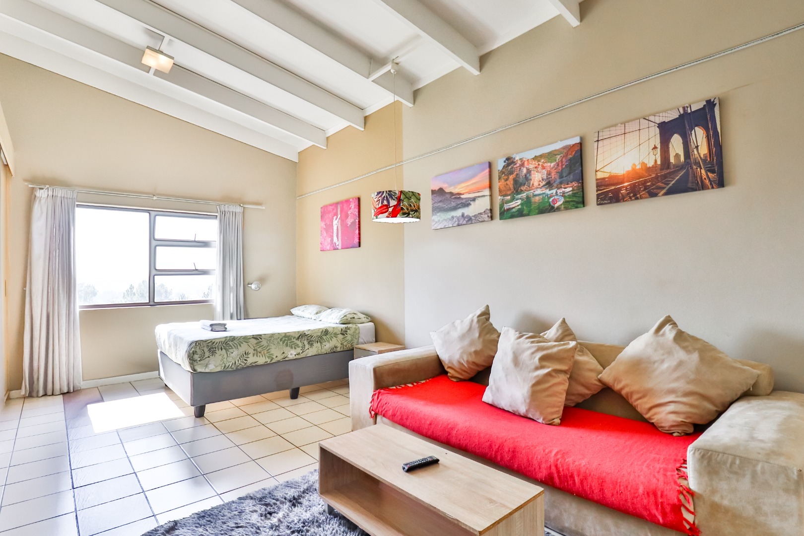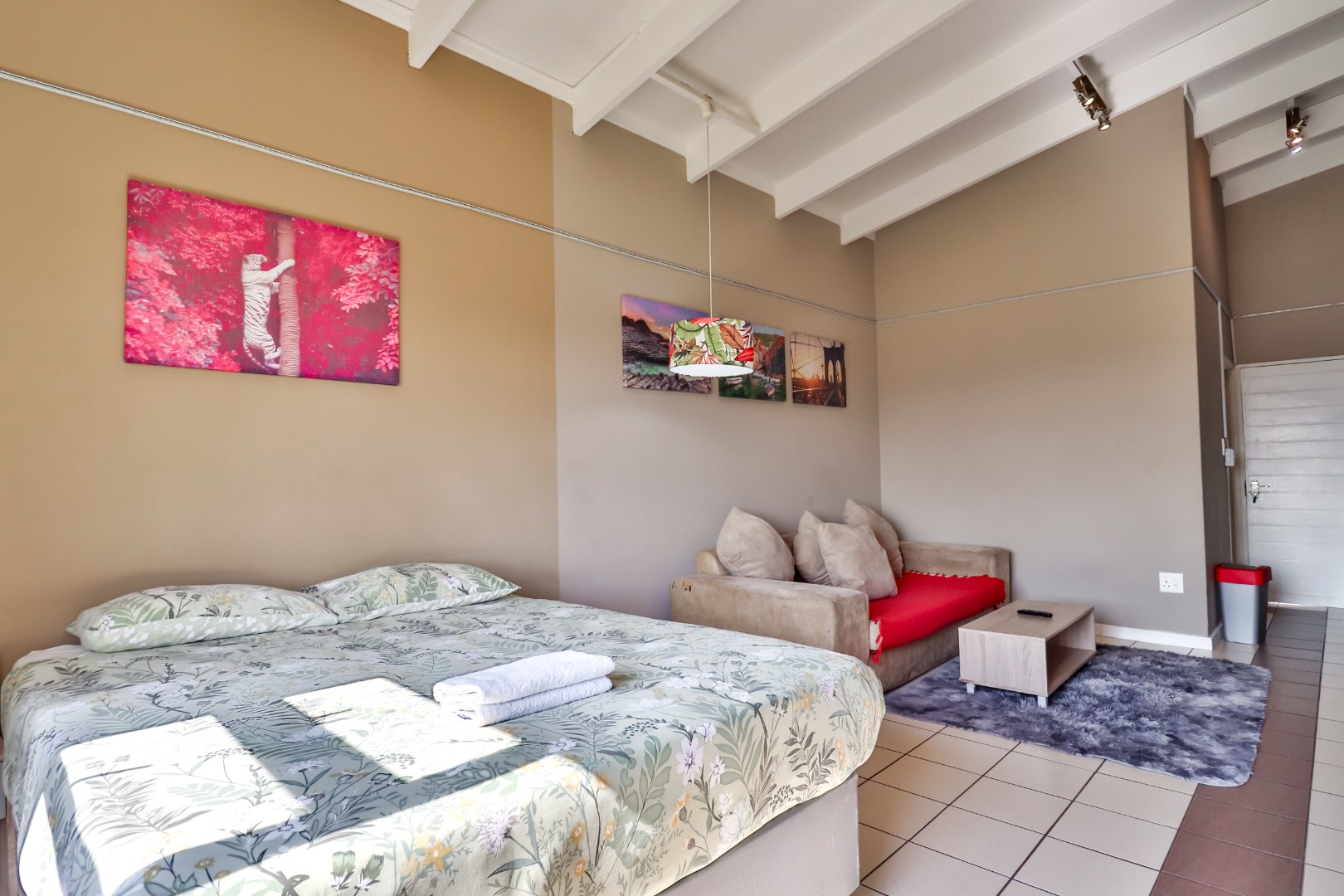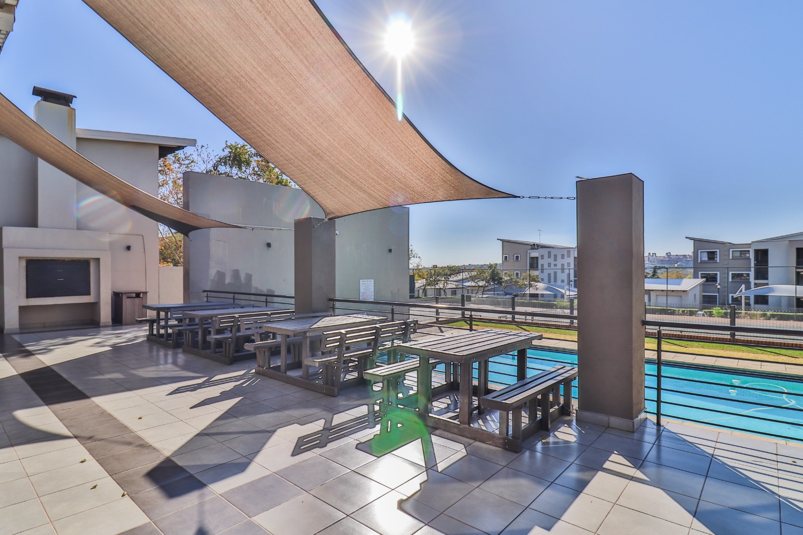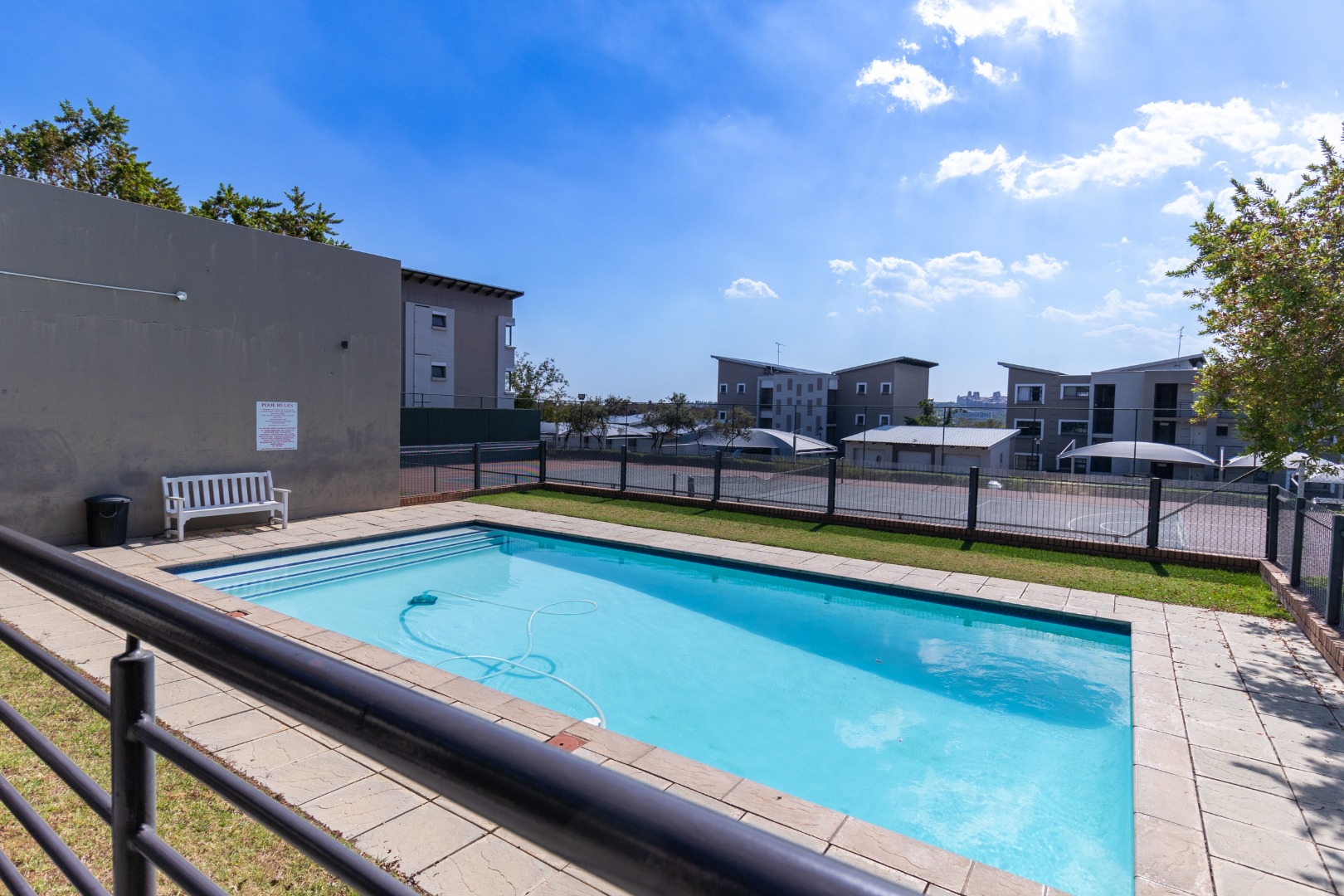 Community amenities further enhance the appeal of this studio. The communal clubhouse includes a braaI area, perfect for social gatherings and outdoor dining. On-site laundry facilities add convenience, making longer stays hassle-free. Guests can enjoy a refreshing dip in the community swimming pool, or stay active on the well-kept tennis court. Kiddies playgrounds with jungle gyms ensure children have a safe and fun place to play.