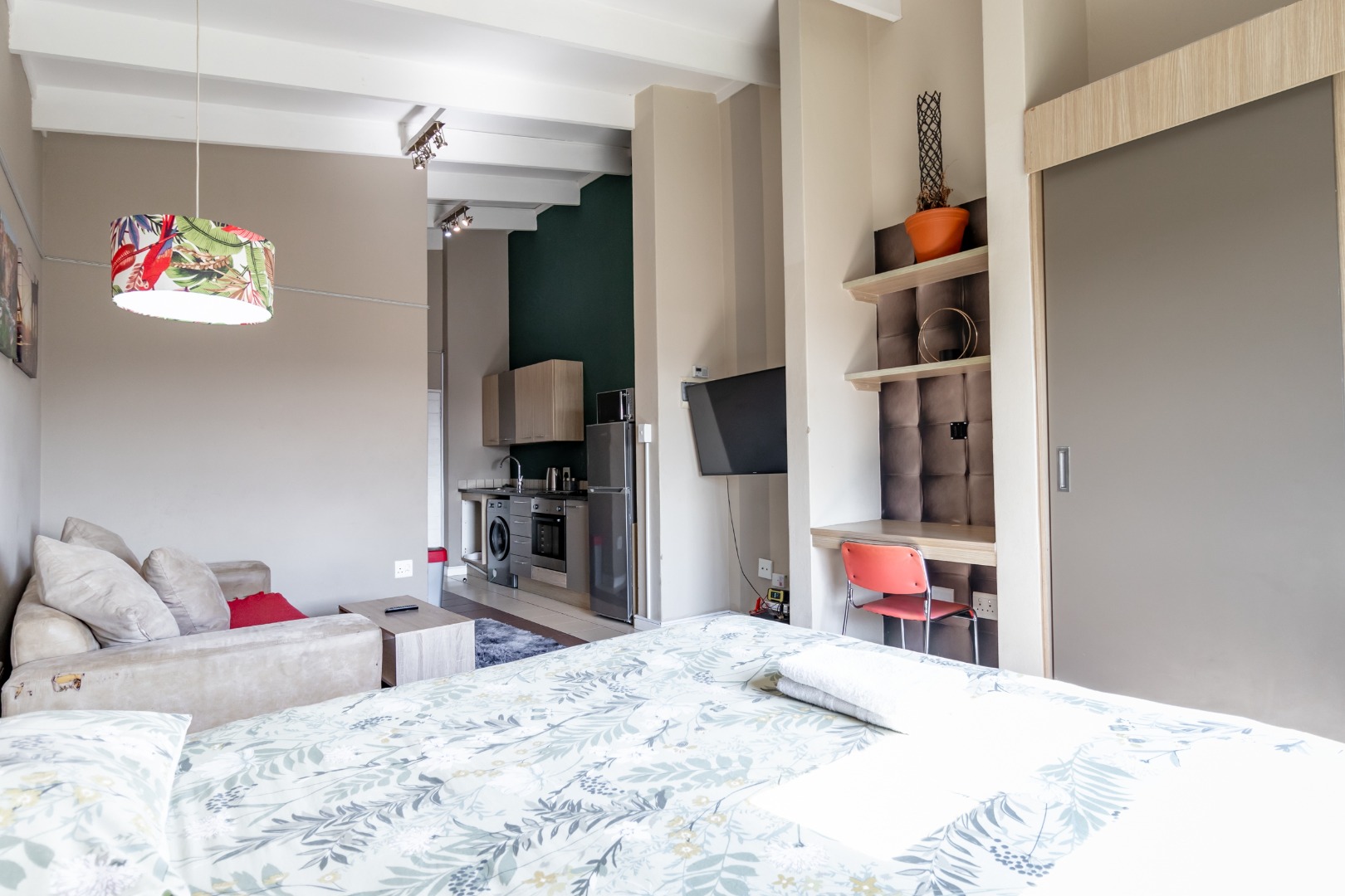 The unit is bright and airy, benefiting from its north-facing position which ensures it's filled with natural light, creating a warm and inviting atmosphere. The spacious open-plan layout provides large living areas, offering flexibility and comfort for guests. The modern kitchen features sleek cabinetry, high-quality appliances, elegant countertops, open shelving, and a tiled backsplash, creating a stylish and functional cooking space. The living area is perfect for relaxation and entertainment. Additionally, there's an integrated study nook with shelving, providing a convenient workspace for guests. The bathroom is efficiently designed, offering a modern shower, toilet, and basin for guests' comfort.