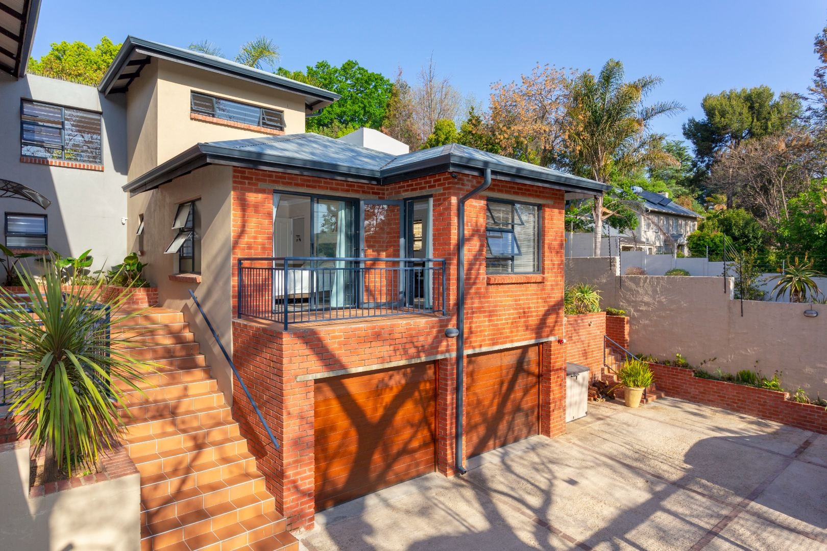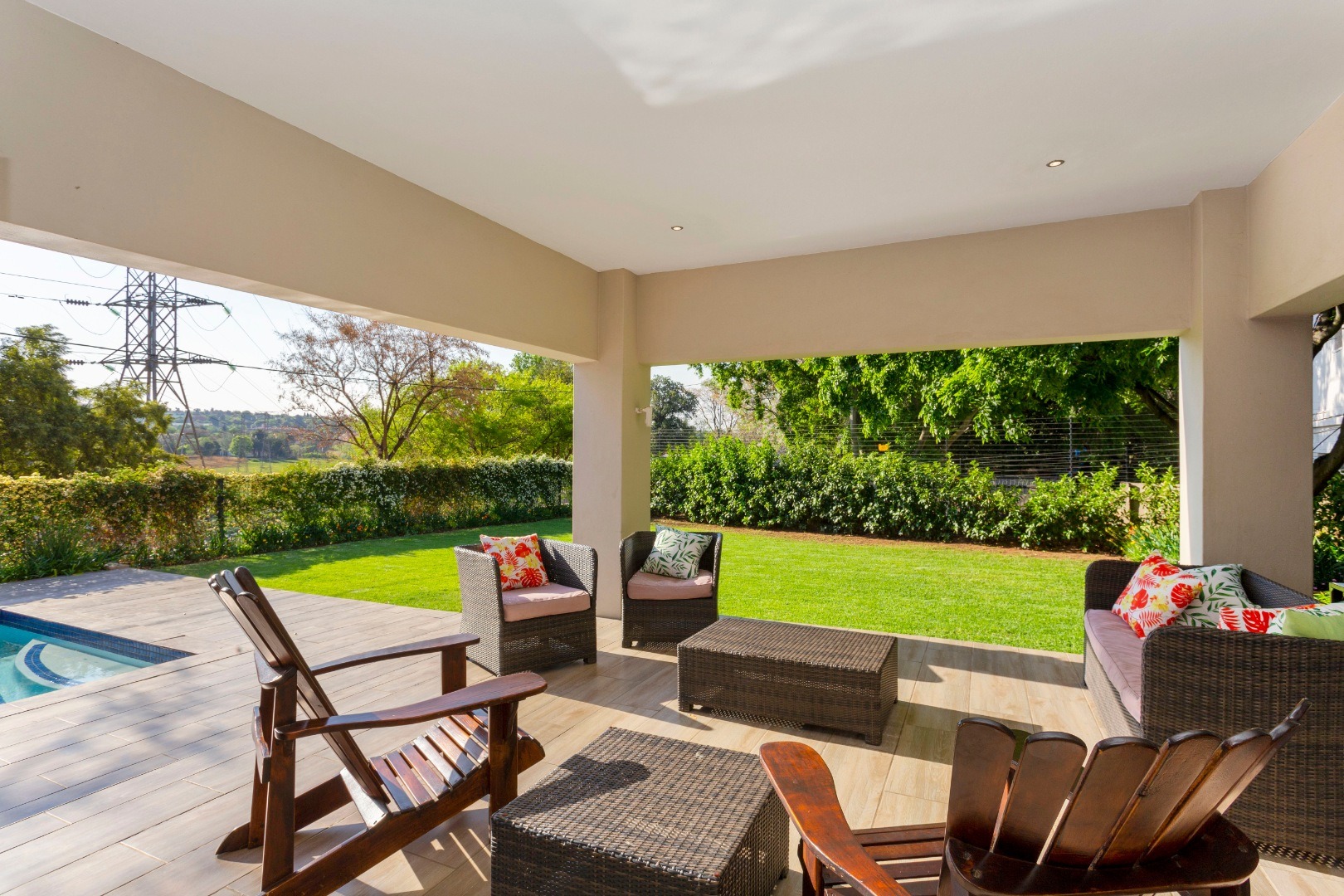 Stacking doors allow for seamless flow onto a landscaped garden and pool, facilitating casual entertainment.