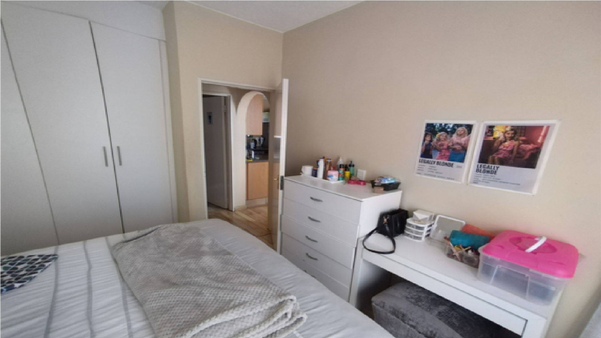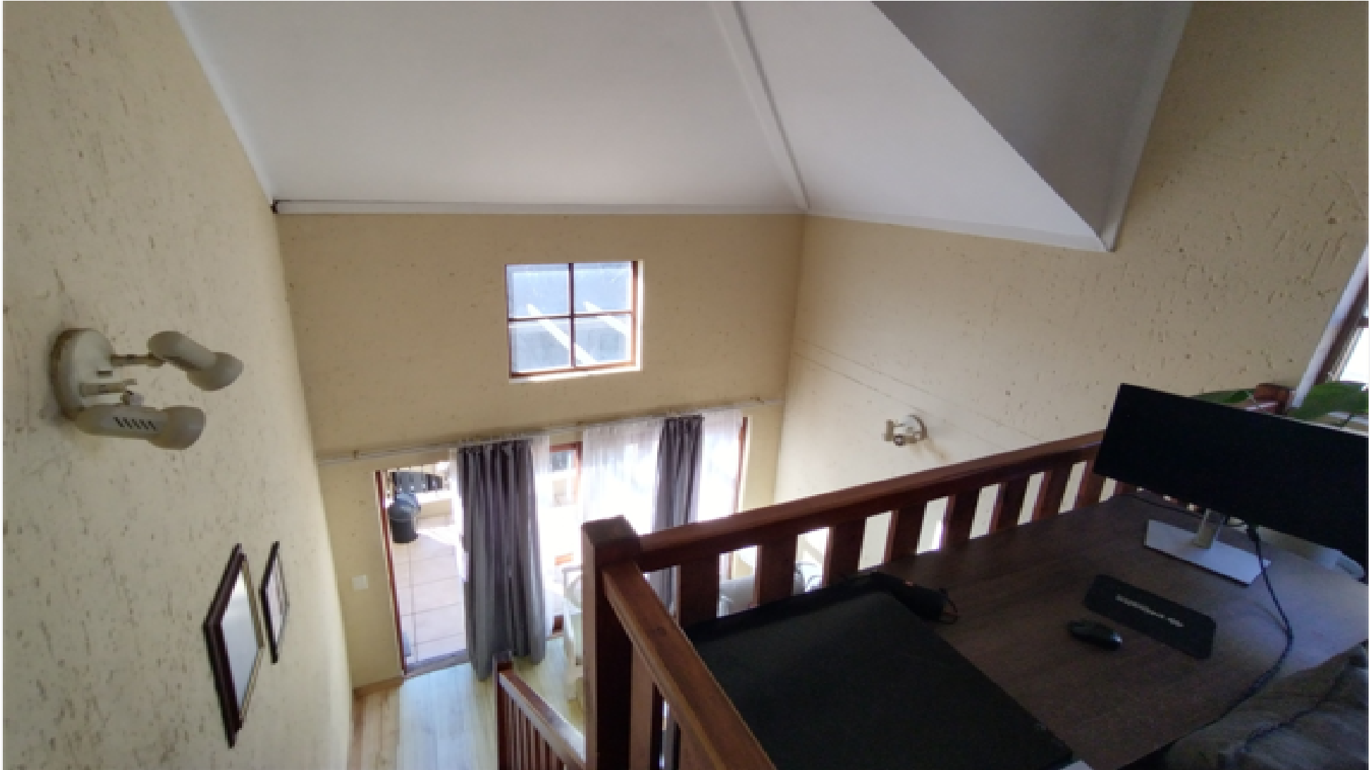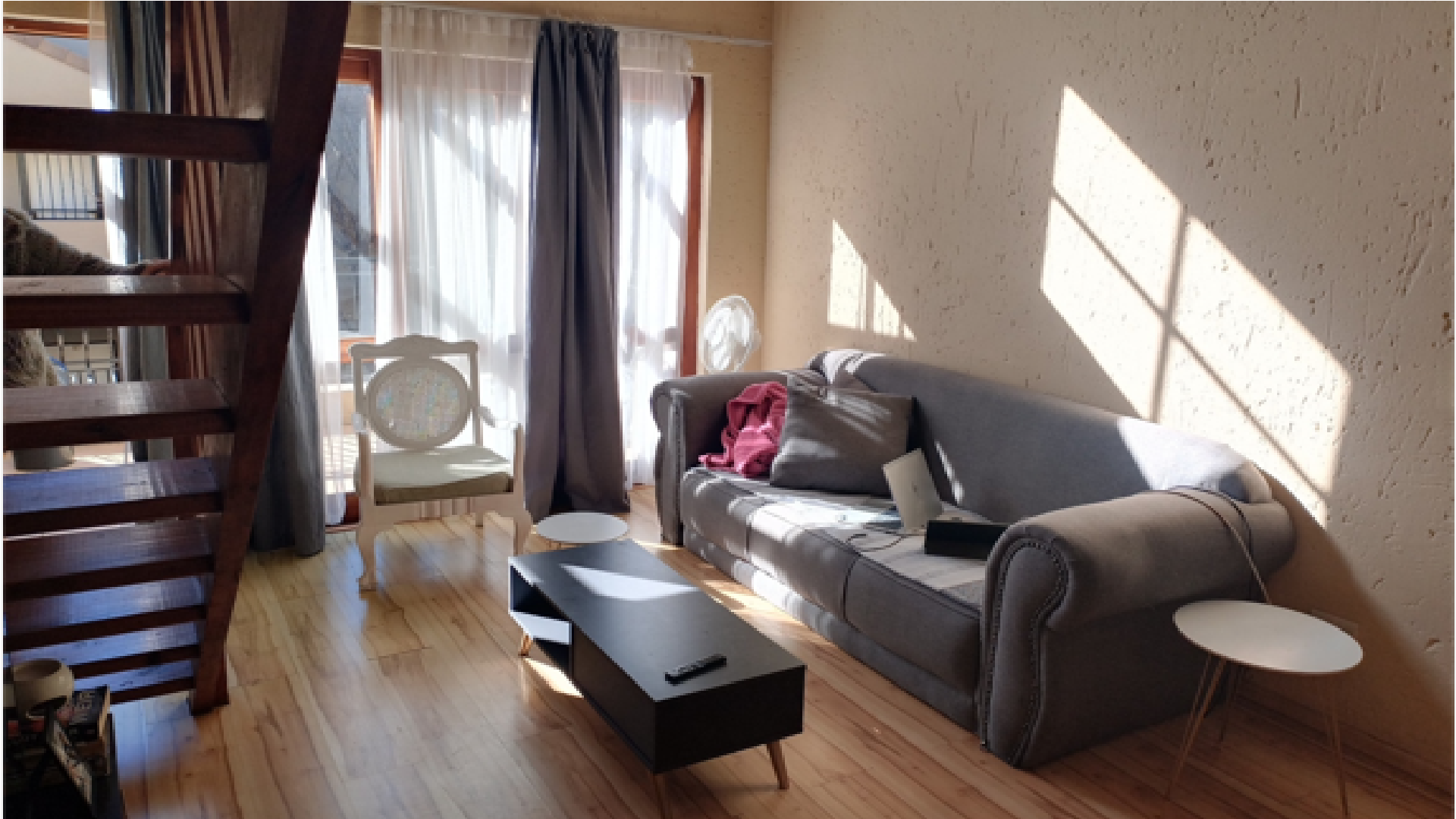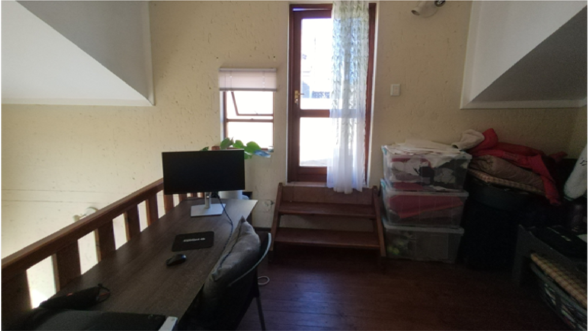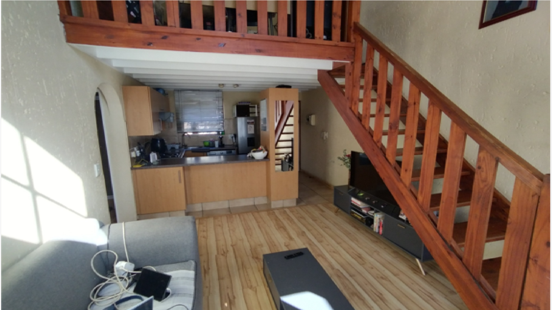 The apartment welcomes you with a warm, open-plan lounge that flows effortlessly onto a private balcony—an ideal setting for morning coffee or relaxed evenings. A staircase leads to a generously sized loft area, complete with its own balcony, perfect for use as a home office, creative space, or an open-plan second bedroom. The well-appointed kitchen includes a breakfast nook, oven and hob, and a dedicated space with plumbing for a washing machine. A modern, fully tiled bathroom offers both a bath and shower, blending style with everyday practicality. The master bedroom features laminated wooden flooring and built-in cupboards, offering both comfort and efficient storage.