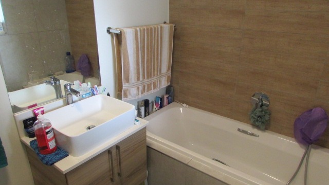 The bathroom is neat and modern, complete with a shower, bath, basin, and toilet—perfect for everyday convenience and comfort.