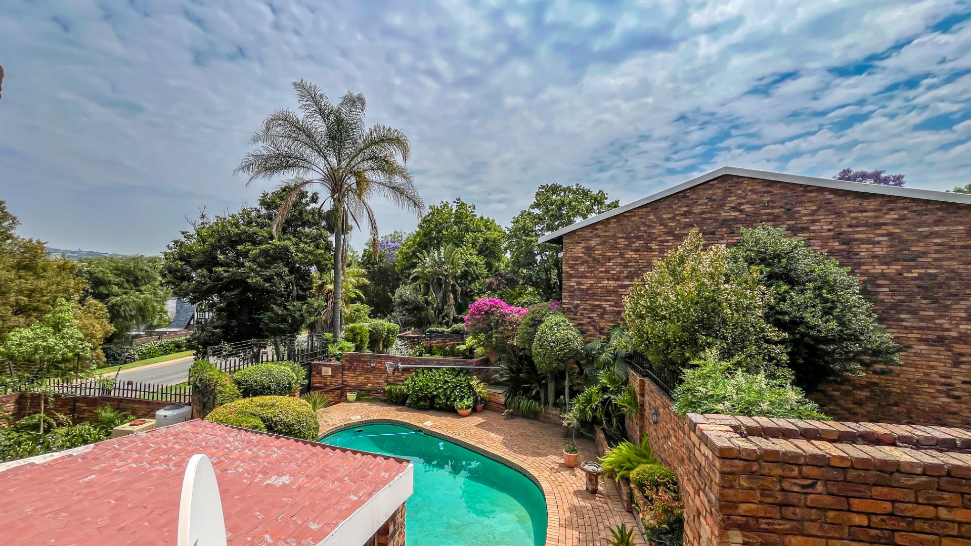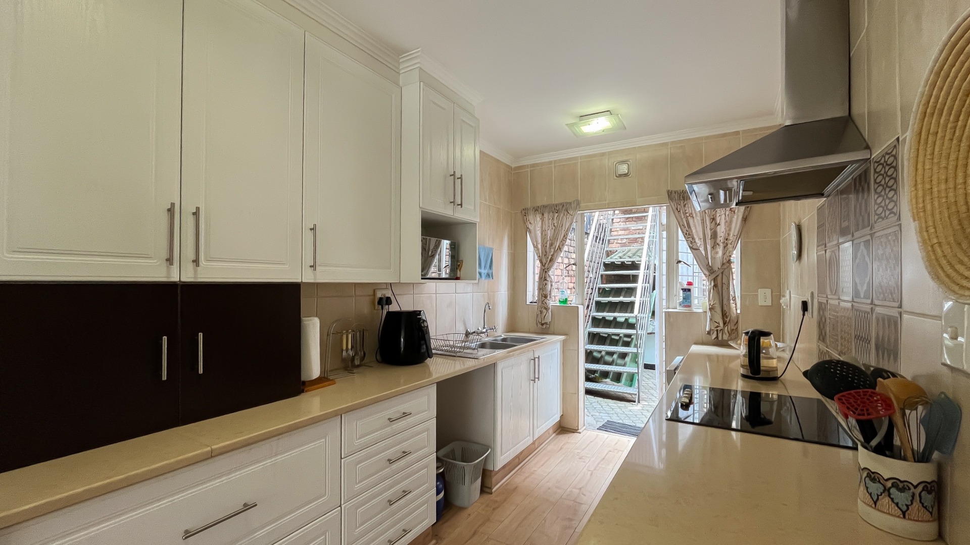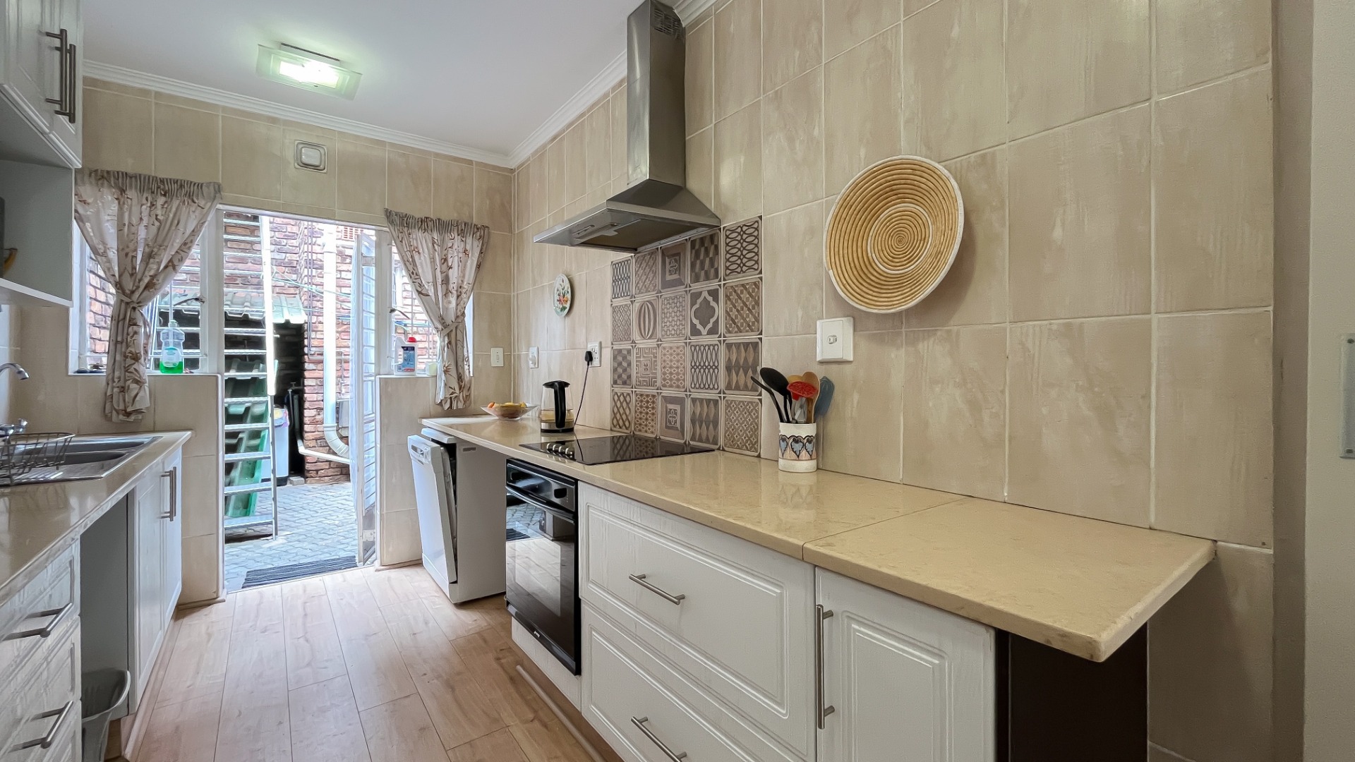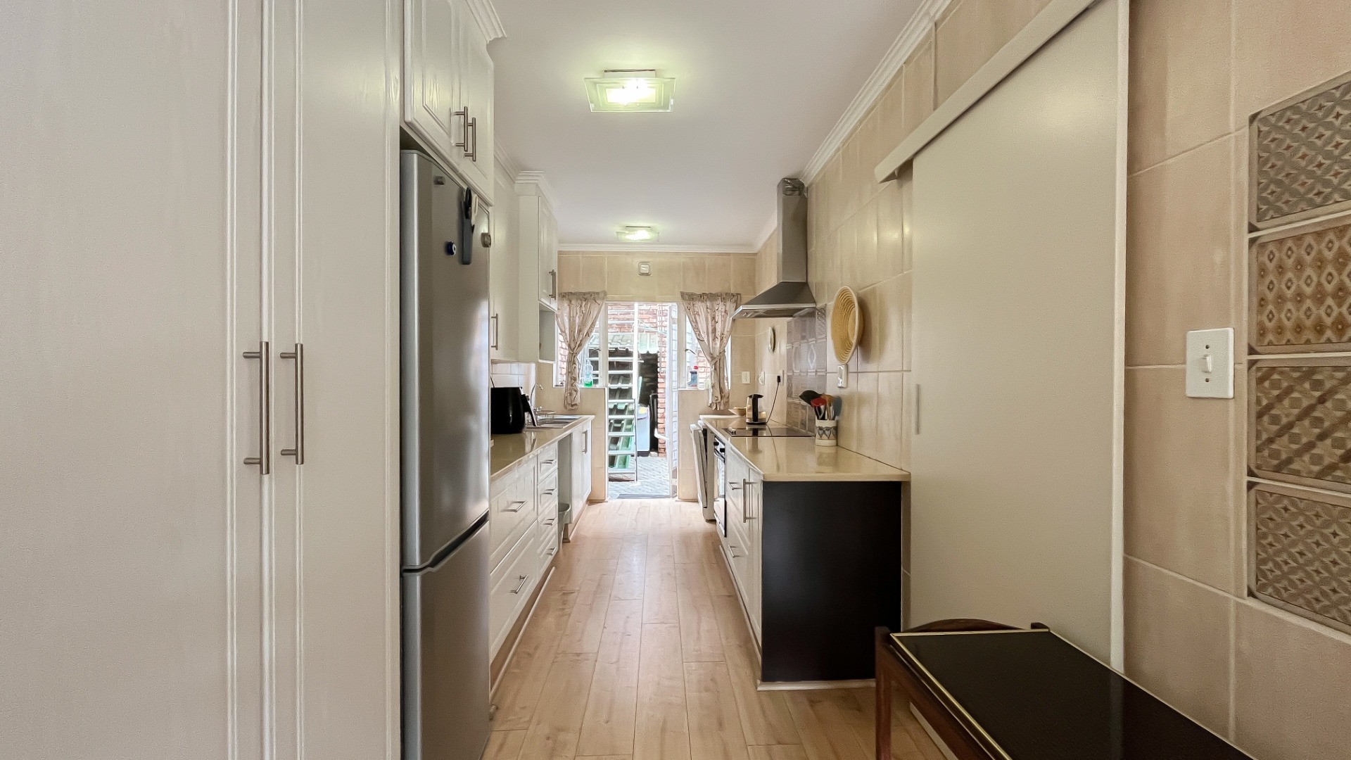 Downstairs features a bright open-plan layout, including a well-appointed kitchen with pantry, generous dining area, lounge, and a dedicated work-from-home corner. Step outside to a covered patio and built-in braai area, leading onto a fully paved, low-maintenance garden with your very own private swimming pool—perfect for relaxed weekends and easy entertaining.