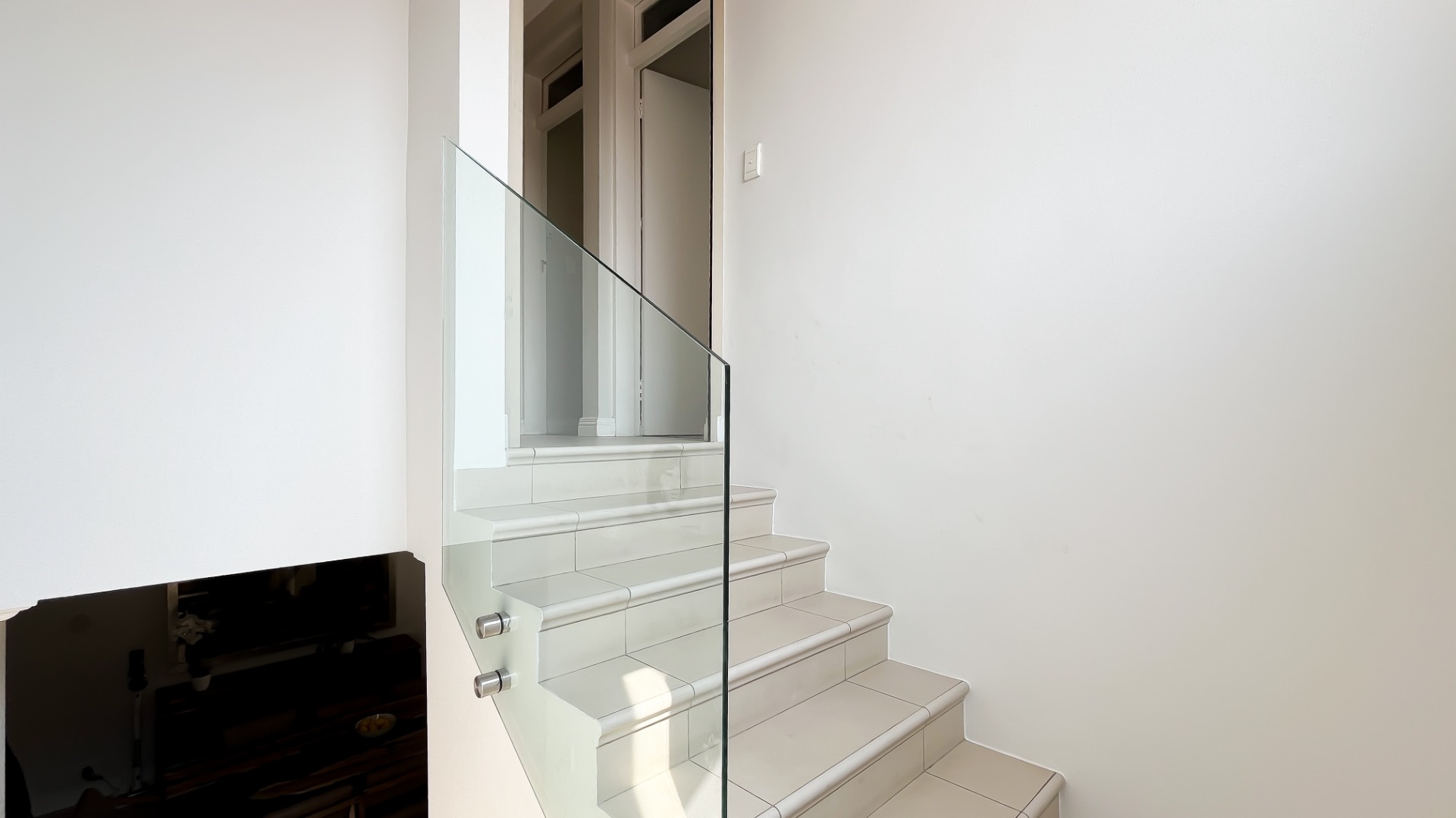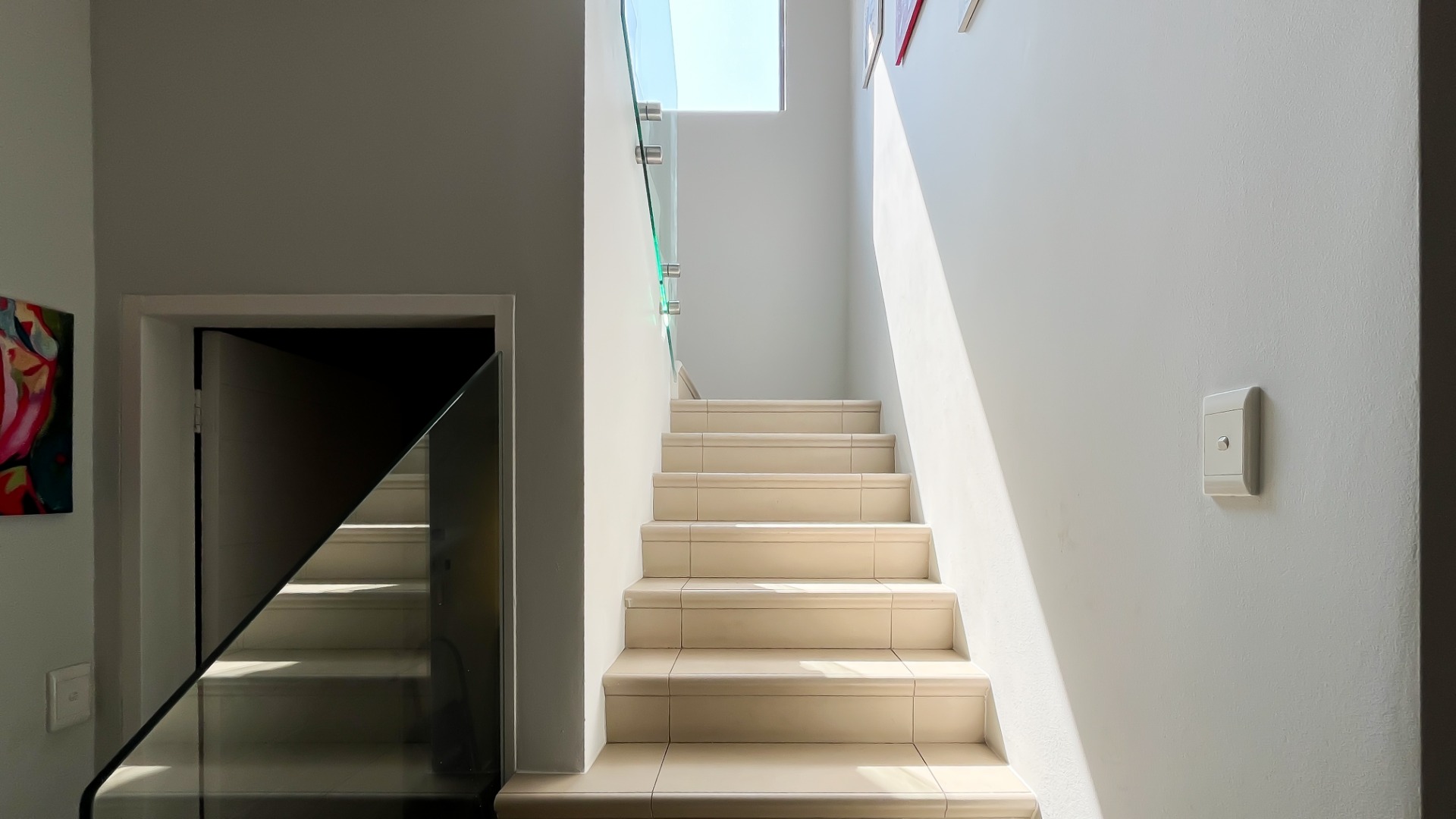 There is a beautiful double volume stairwell leading down and a nice glass panel on the right plus downlighters.