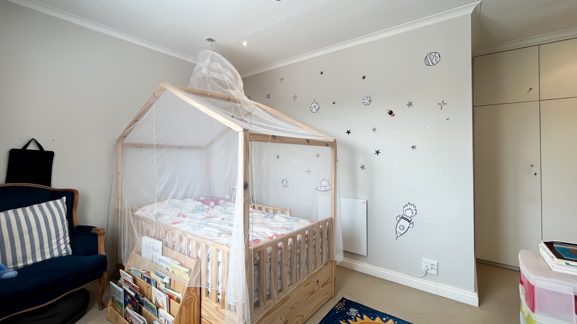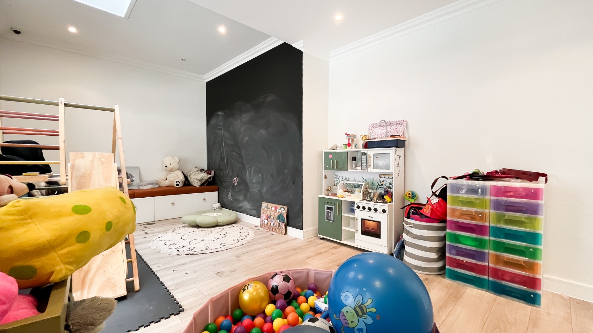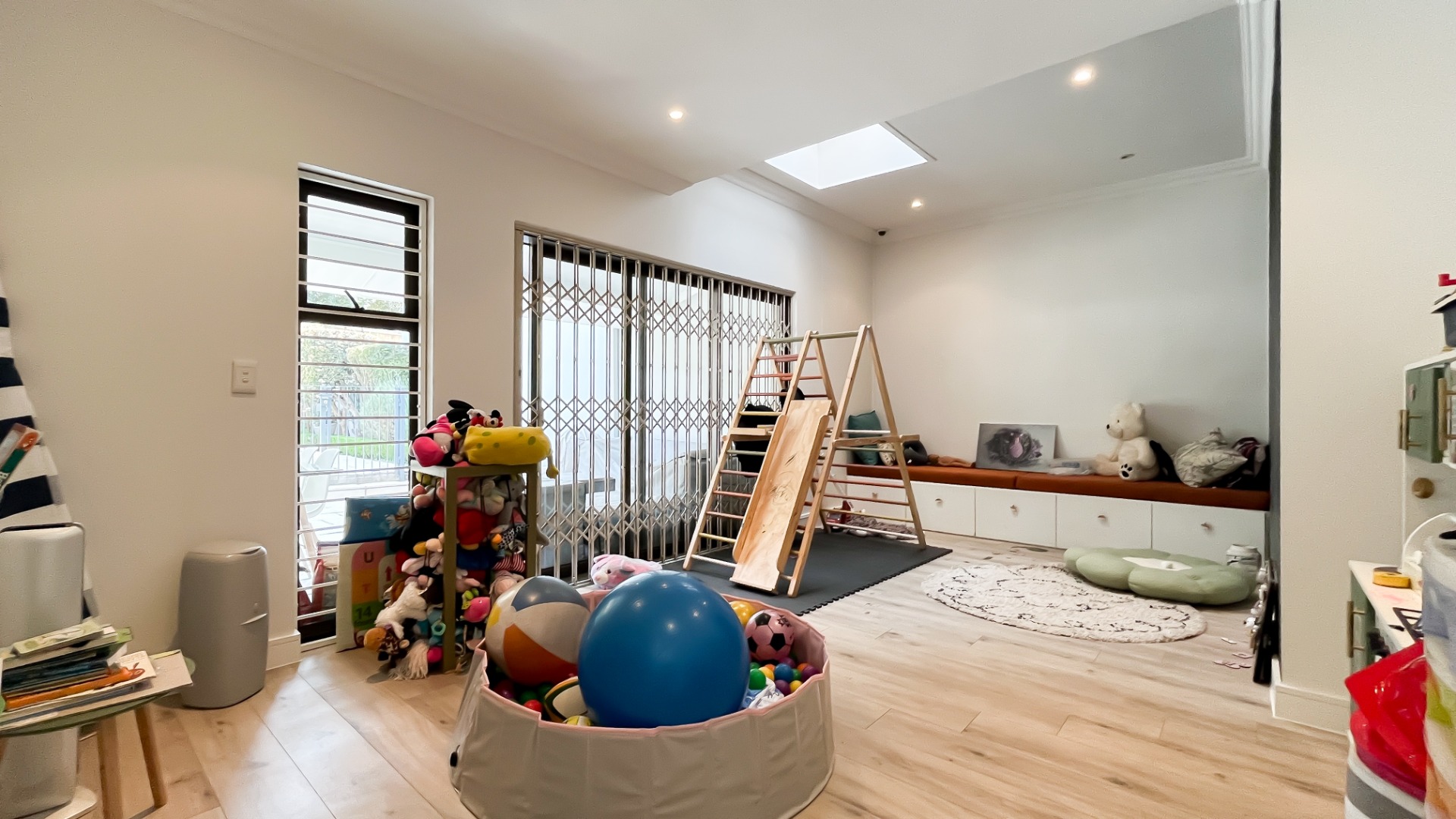 There is also a large playroom with a blackboard on the wall plus little chairs with cushins on top across from the wall on the far side of this room. Leading out from this playroom are trellidoors and sliding glass doors leading onto the pati.