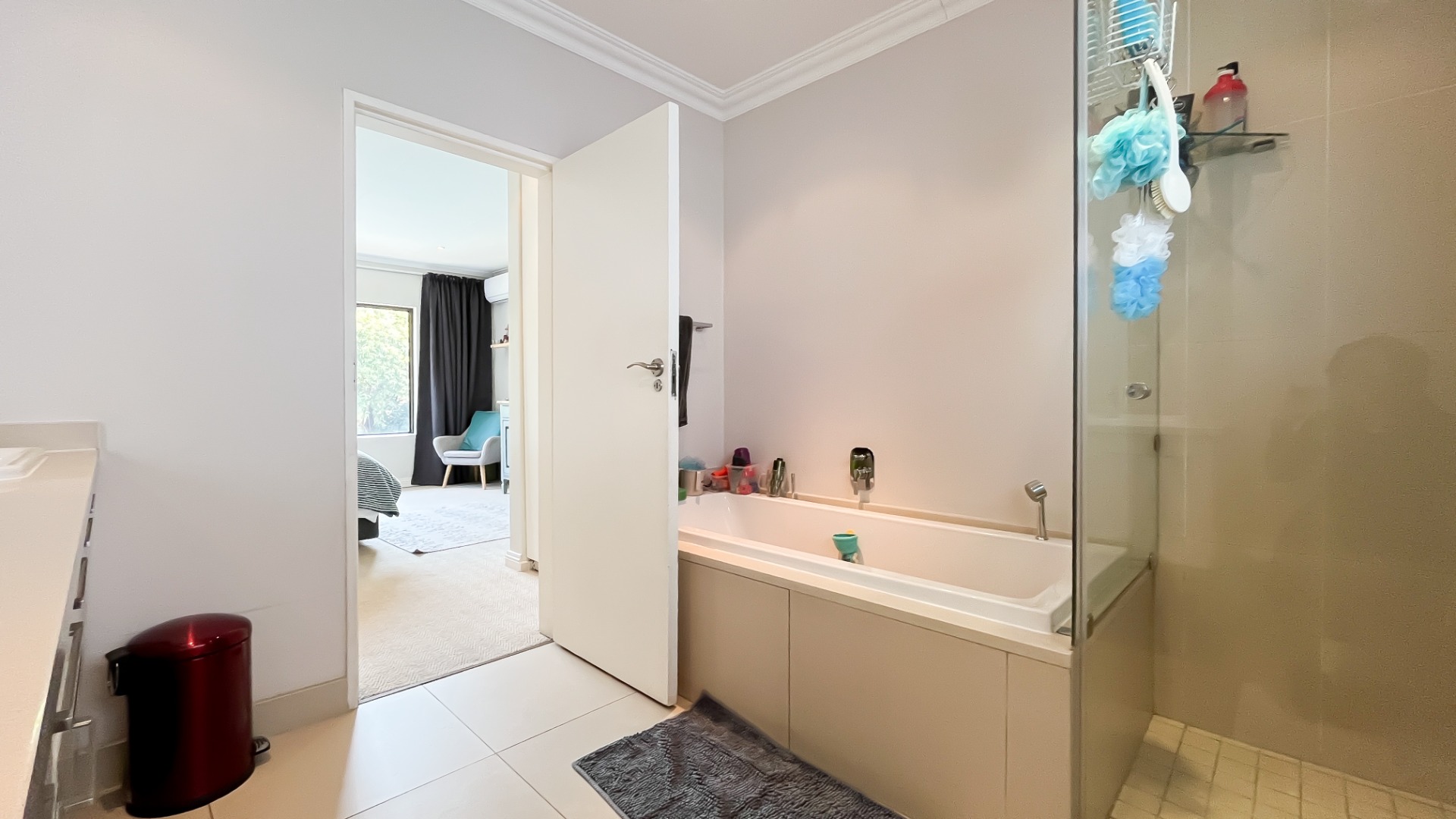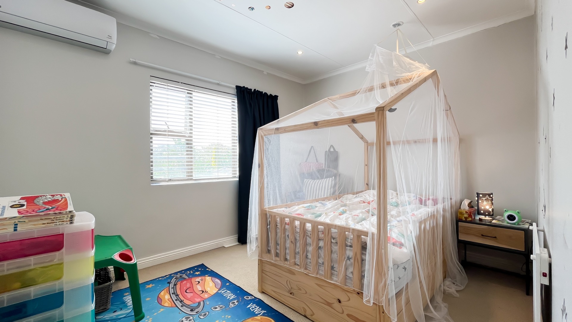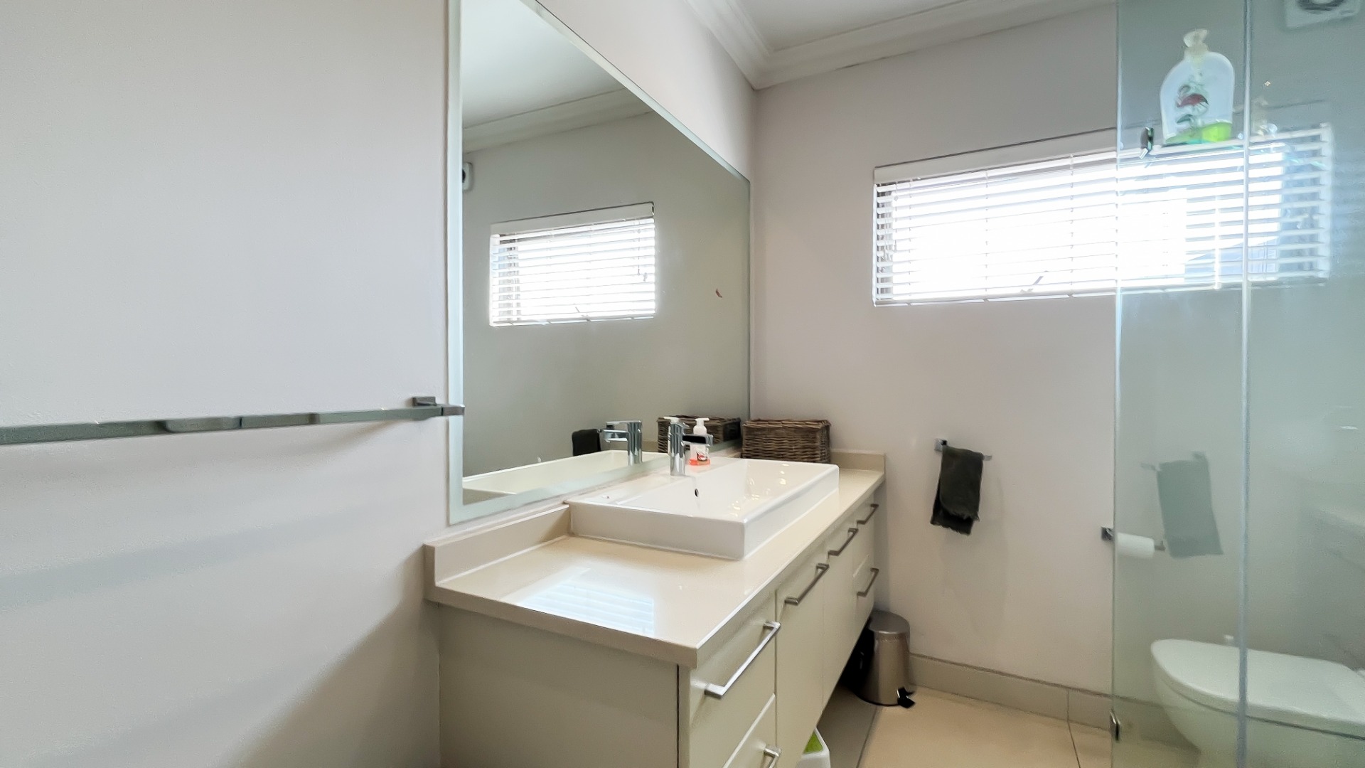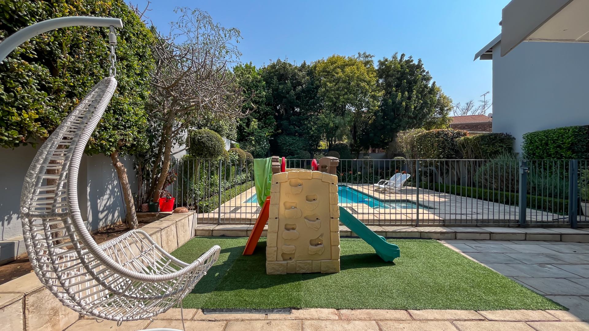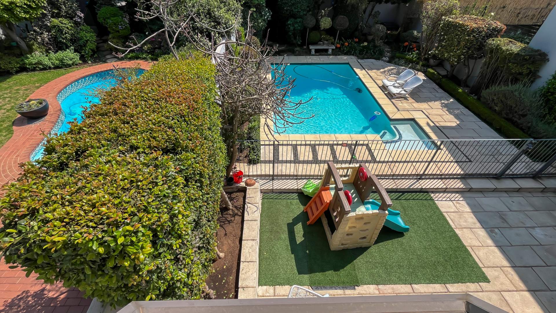 As one enters the house it has a tiled entrance hall with downlighters. Leading up tilsed steps. First bedroom to the right has wonderful slatted blinds overlooking a beautiful swimming pool which is enclosed with security gates and a very well established garden. It also has a wall heater plus an air conditioner and belgotex cream carpets. Itp has downlighters plus reverse cycle air conditioning. It also has poles to facilitate putting the curtain s in. It has cream large tiles in the passageway adjacent plus a cupboard. Then it also has 2 cupboards 1 on each side. A large room plus it has aluminium window frames and looks out onto the most beautiful garden. Cyclamen plus awesome lollipop trees very nicely and neatly done and just outside the entrance is astroturf and a kiddies playground and to the right of this it is beautifully tiled. Very nice, conducive to entertaining. This room has belgotex carpets in cream and there is more than enough space to accommodate a king size bed plus loads of added space plus cupboard. Also houses an airconditioning unit as well. This is an ensuite which has a beautiful bath plus a separate shower and toilet plus basin. Plus downlighters, fantastic slatted blinds. Windows have brand new finishes and are aluminium framed.