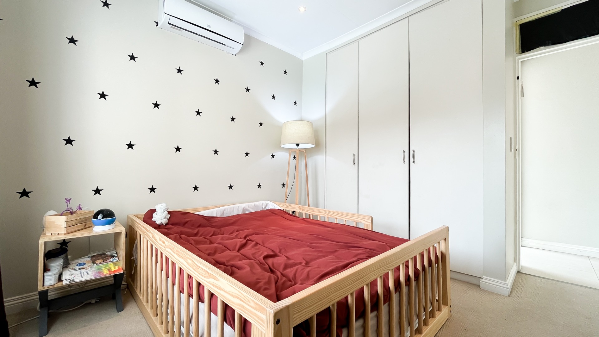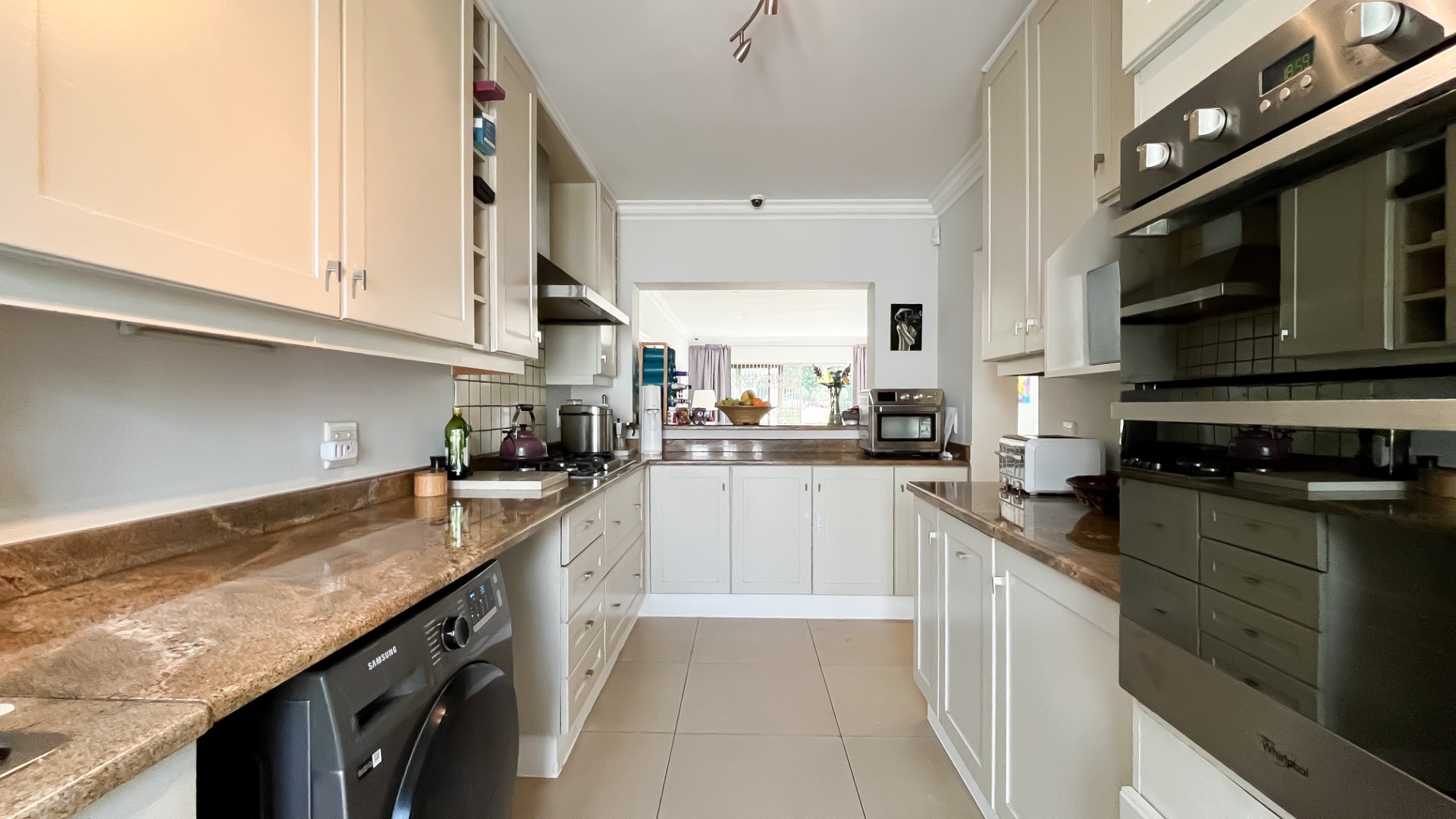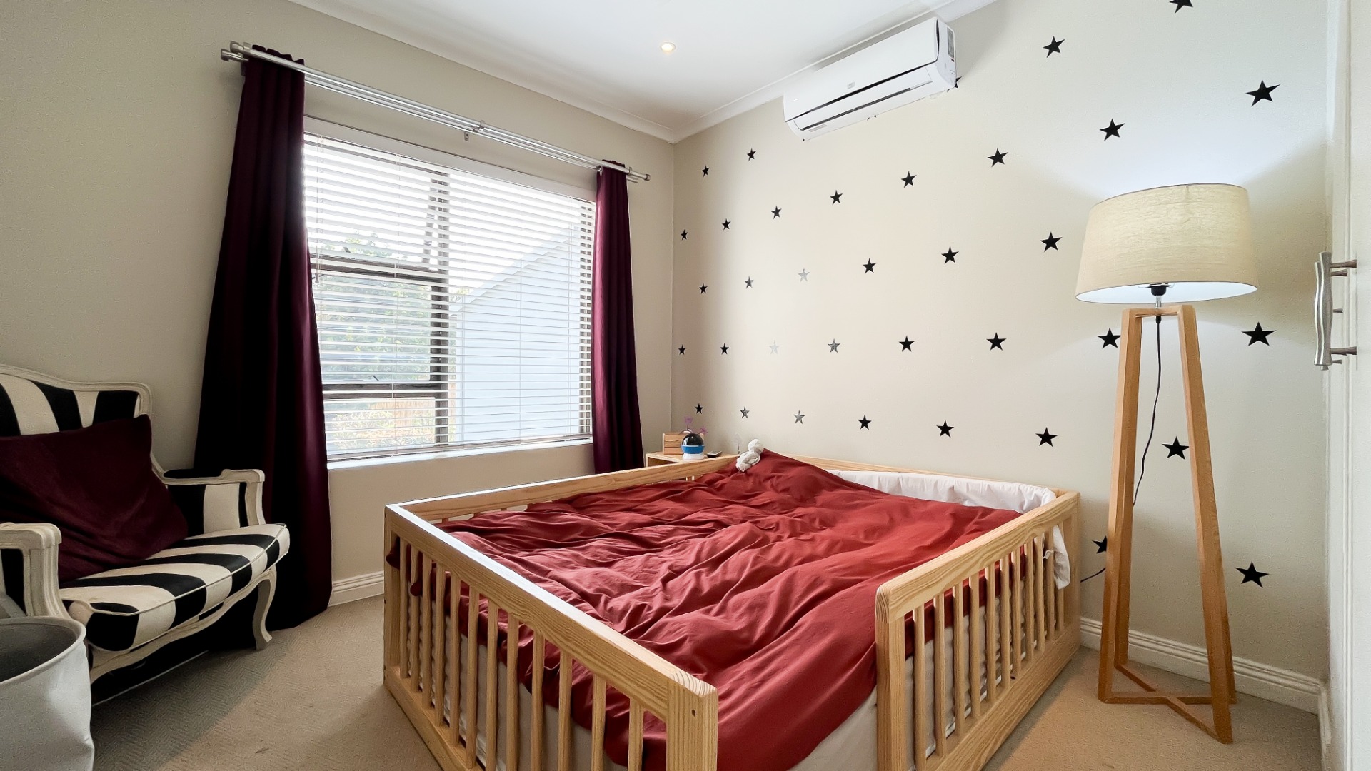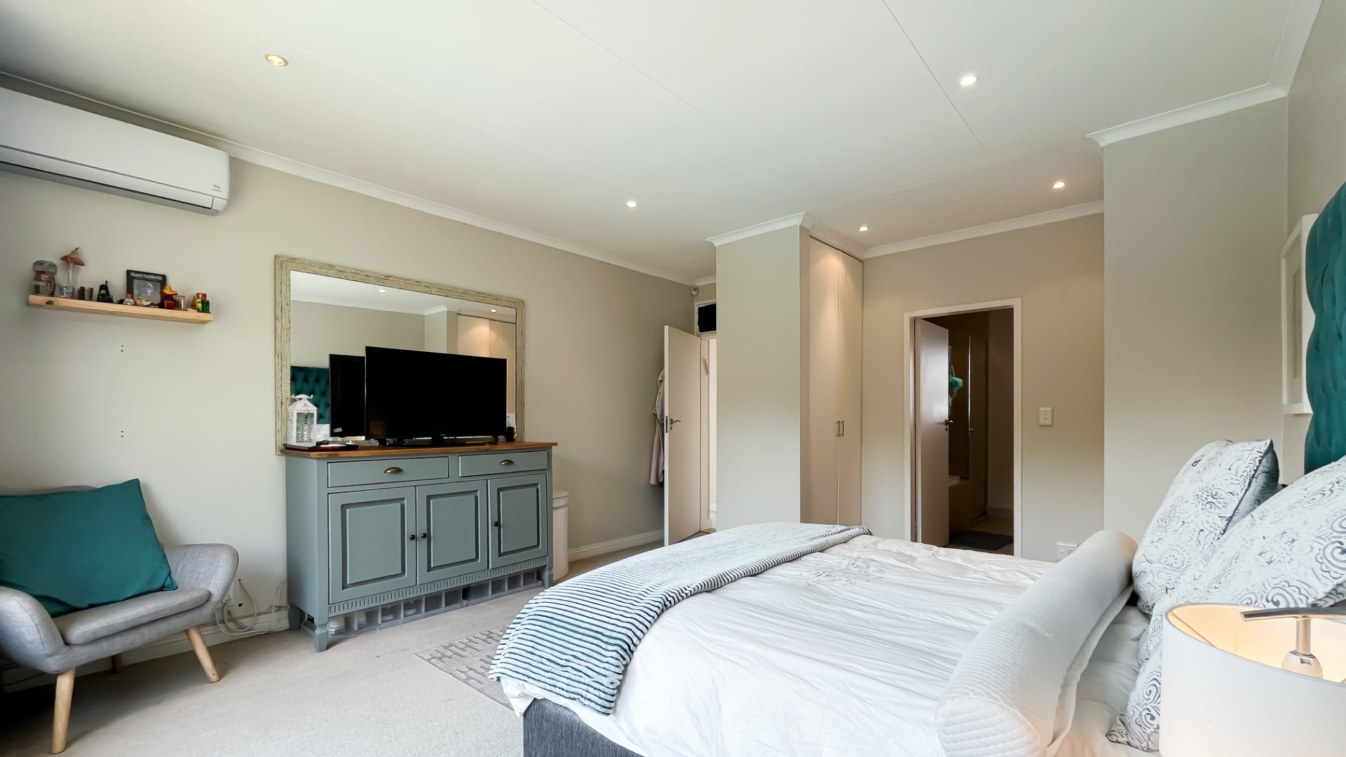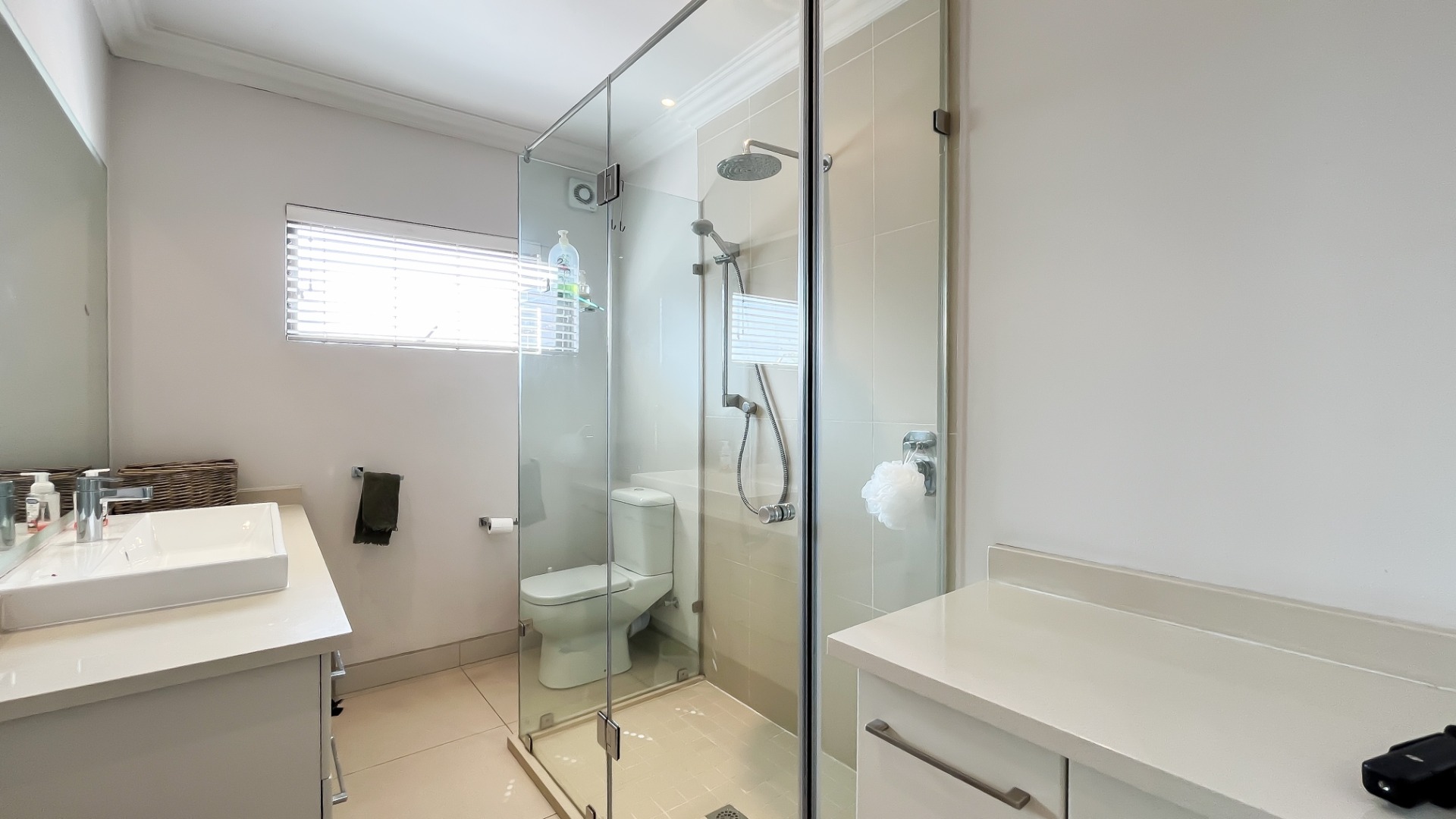 As one enters the house it has a tiled entrance hall with downlighters. Leading up tilsed steps. First bedroom to the right has wonderful slatted blinds overlooking a beautiful swimming pool which is enclosed with security gates and a very well established garden. It also has a wall heater plus an air conditioner and belgotex cream carpets. Itp has downlighters plus reverse cycle air conditioning. It also has poles to facilitate putting the curtain s in. It has cream large tiles in the passageway adjacent plus a cupboard. Then it also has 2 cupboards 1 on each side. A large room plus it has aluminium window frames and looks out onto the most beautiful garden. Cyclamen plus awesome lollipop trees very nicely and neatly done and just outside the entrance is astroturf and a kiddies playground and to the right of this it is beautifully tiled. Very nice, conducive to entertaining. This room has belgotex carpets in cream and there is more than enough space to accommodate a king size bed plus loads of added space plus cupboard. Also houses an airconditioning unit as well. This is an ensuite which has a beautiful bath plus a separate shower and toilet plus basin. Plus downlighters, fantastic slatted blinds. Windows have brand new finishes and are aluminium framed.