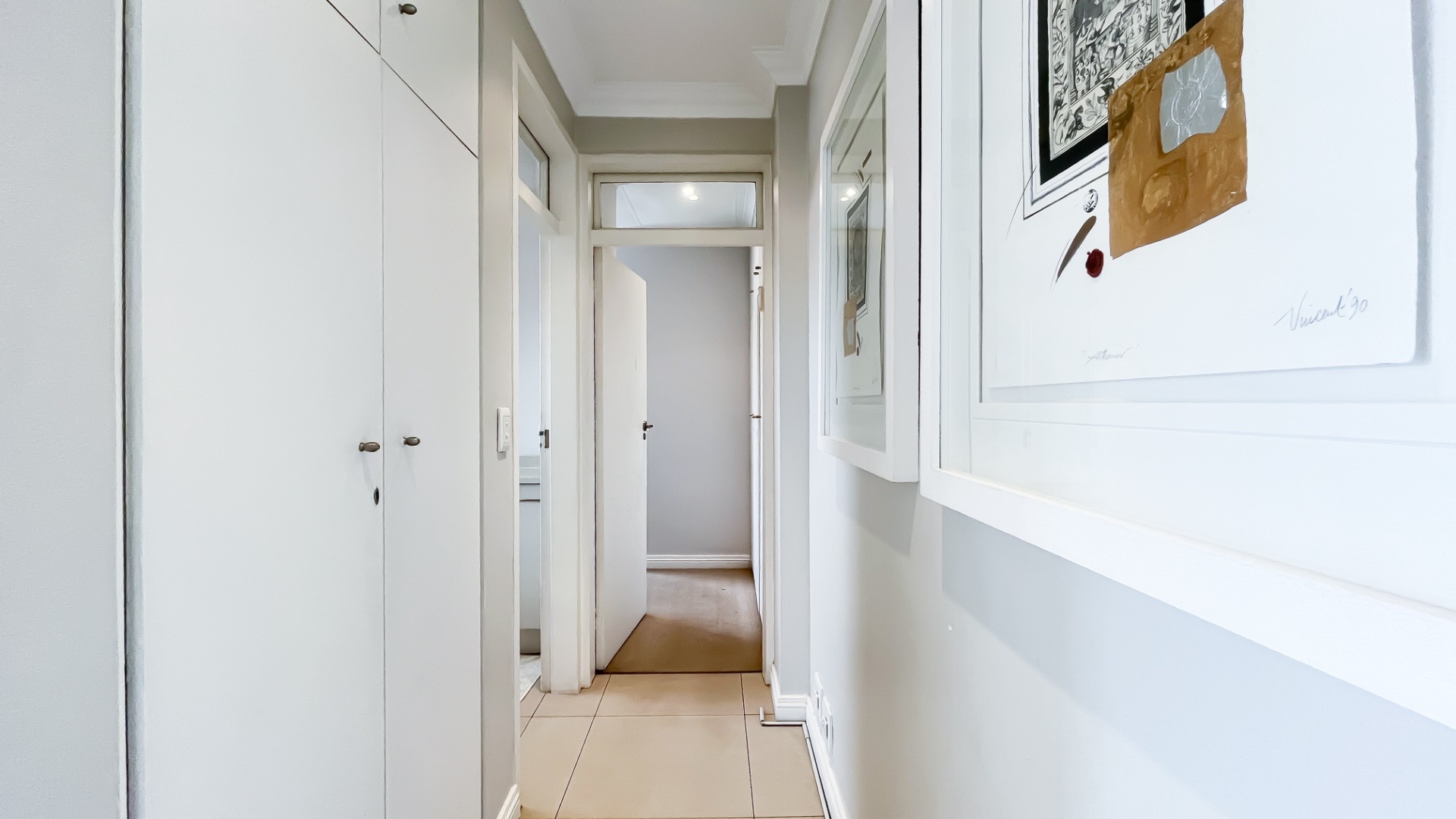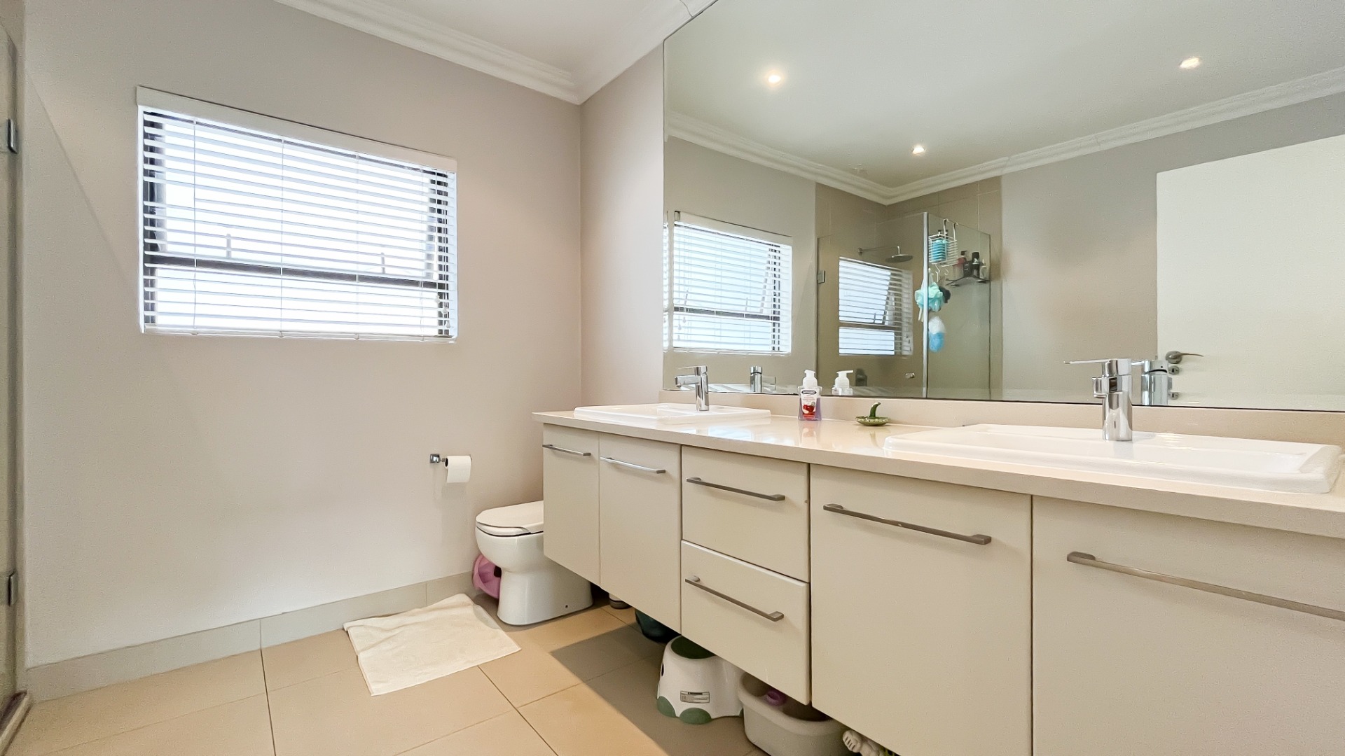 Just outside the room there is another cupboard on the left in the passage, with the same uniform amazing tiling throughout. There is additionally another bathroom consisting of a double basin with toilet slatted blinds plus downlighters and a double shower. cu