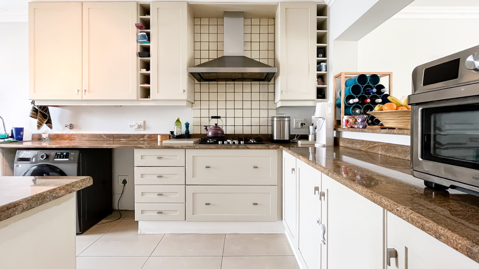 The kitchen houses 2 appliances. Loads of cupboard space in cream with space for a nice fridge and nice oven and gas stove with gas canisters. Just outside the kitchen is another little courtyard to hang washing. Plus dustbin sits outside. Windows have modern perspex burglar proofing across.