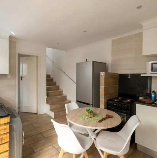 This modern 1-bedroom, 2-bathroom rental property offers a comfortable and convenient living experience in Johannesburg. The well-designed 100 sqm floor plan features an open-plan layout, seamlessly integrating the lounge, dining area, and a contemporary kitchen. The kitchen is equipped with white cabinetry, dark countertops, a refrigerator, stove, microwave, and even an integrated washing machine, ensuring all essential amenities are at hand. Throughout the living spaces, you'll find practical tiled flooring and recessed lighting, creating a bright and inviting atmosphere. A glass block window provides natural light while maintaining privacy.