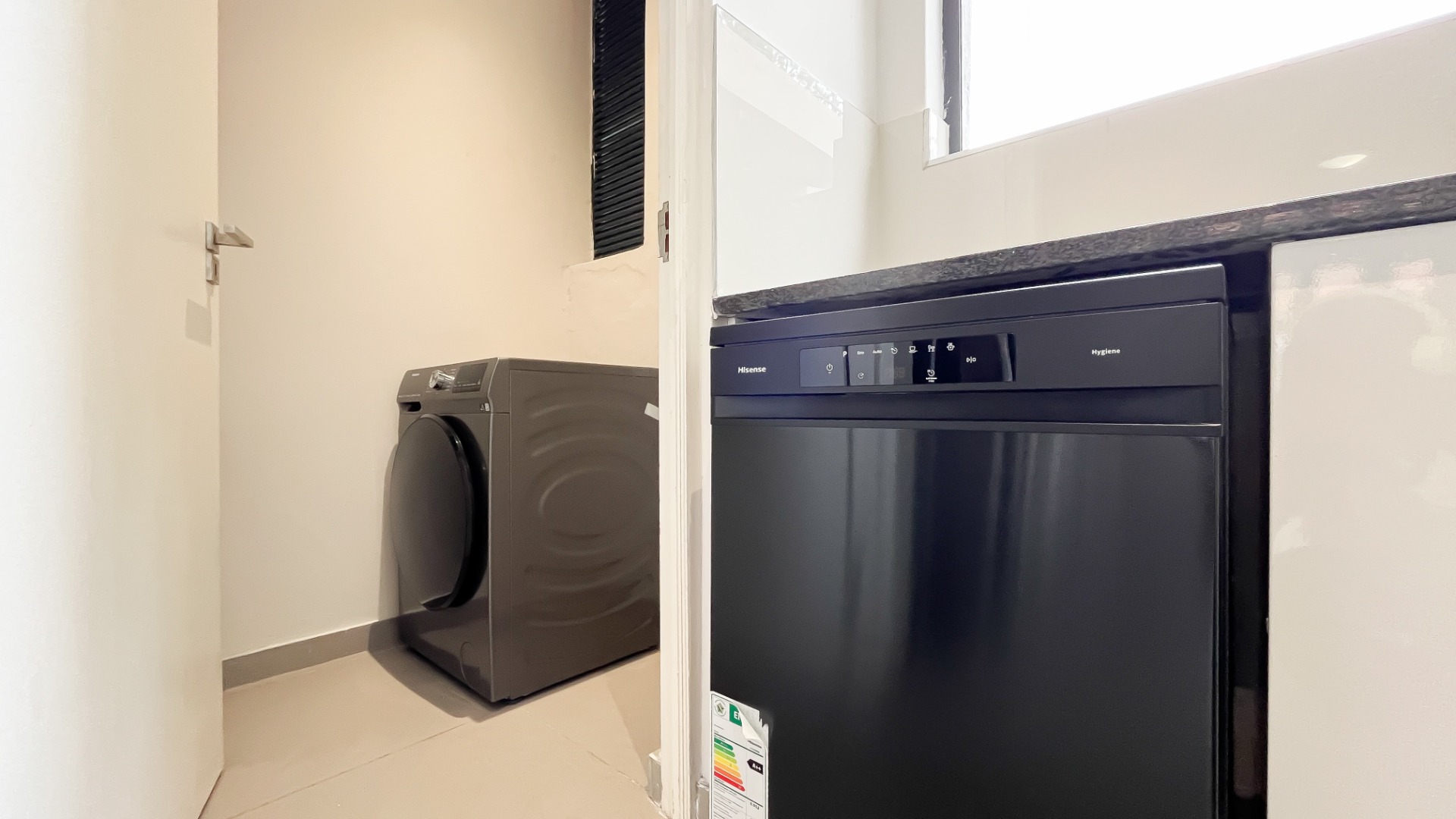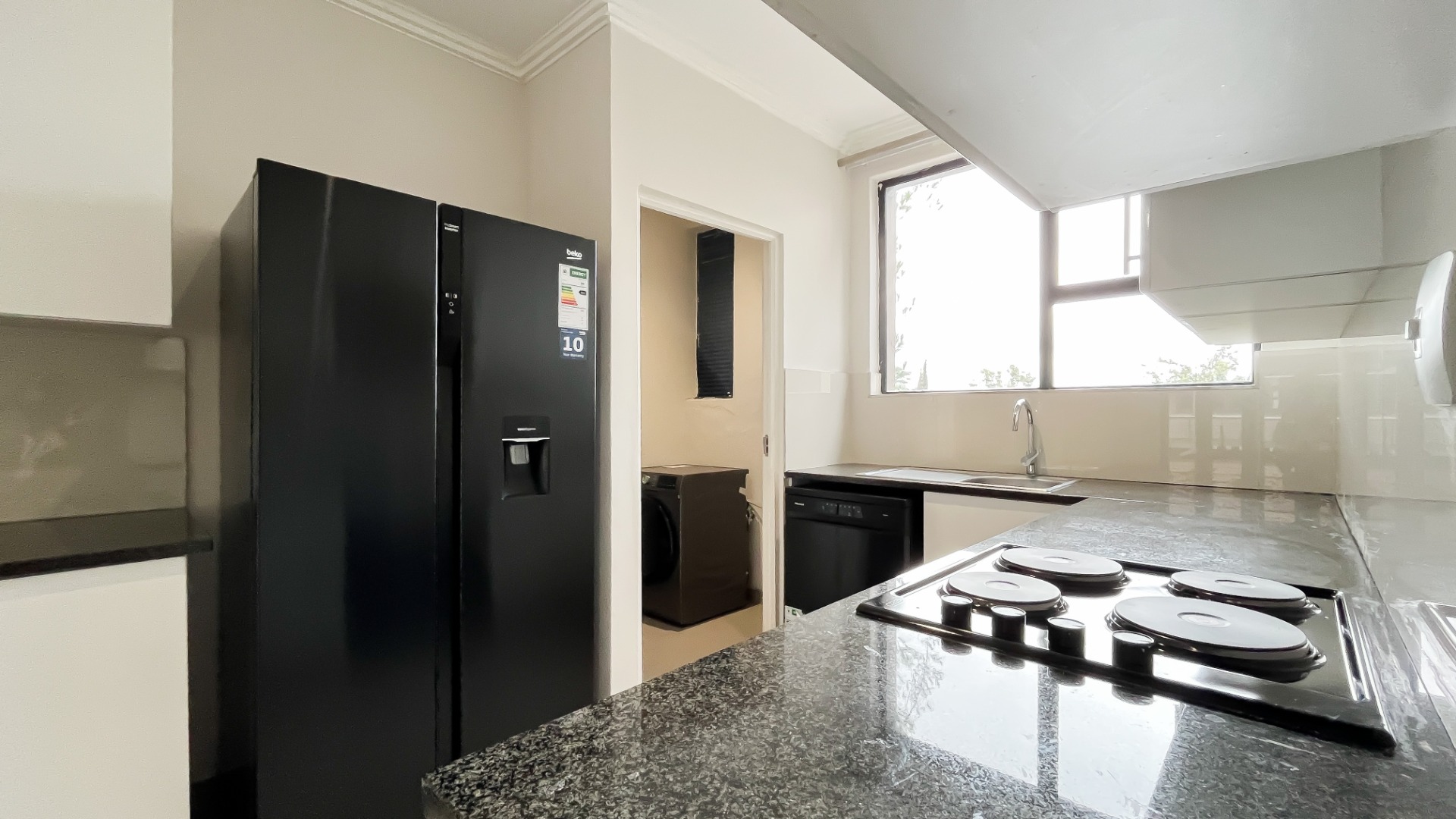 Discover this contemporary 2-bedroom, 2-bathroom apartment available for rent in the sought-after Morningside area of Sandton. Spanning 91 square metres, this unfurnished residence offers a modern open-plan layout, seamlessly connecting the living, dining, and kitchen areas. The space is bathed in natural light, enhanced by large double doors and windows, creating an inviting and airy atmosphere. The sleek, modern kitchen is a highlight, featuring pristine white cabinetry, dark granite-style countertops, and durable tiled flooring. It comes equipped with integrated appliances, including a large Hisense fridge with a water dispenser, a built-in hob, and a convenient built-in Hisense dishwasher. A dedicated laundry alcove houses a Hisense washing machine, ensuring all your essential needs are met. The apartment comprises two well-proportioned bedrooms, with one offering the privacy of an en-suite bathroom. Both bathrooms are finished to a high standard, complementing the overall modern aesthetic. Throughout the apartment, you'll find easy-to-maintain tiled flooring, neutral-toned walls, and elegant crown molding, providing a clean canvas ready for your personal touch. Further enhancing convenience, the property includes two dedicated parking bays. Situated within a desirable complex in Morningside, this location offers excellent access to Sandton's vibrant business district, premier shopping centres, and a variety of dining options, making it ideal for professionals or small families seeking a sophisticated urban lifestyle. Key Features: * 2 Bedrooms, 2 Bathrooms (1 En-suite) * 91 sqm Floor Size * Modern Open-Plan Living * Sleek Kitchen with Integrated Appliances * Hisense Fridge, Dishwasher, and Washing Machine Included * Durable Tiled Flooring Throughout * Ample Natural Light * Two Dedicated Parking Bays * Located in a Desirable Complex