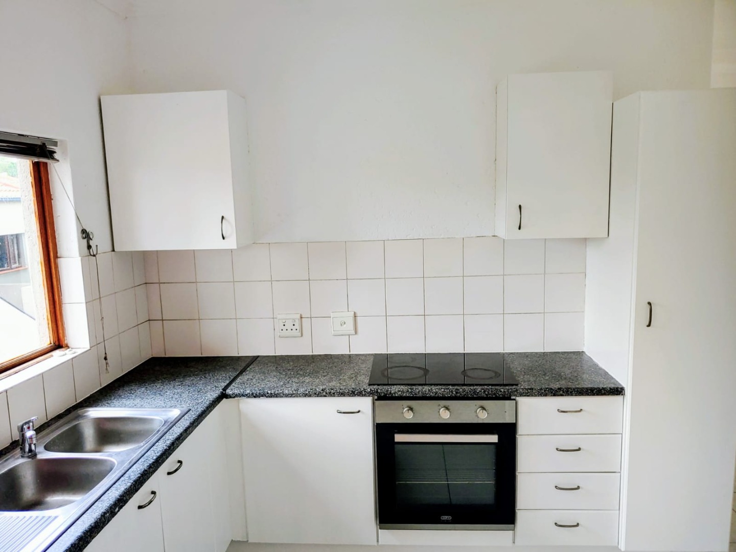 - Kitchen with a double sink, space for one appliance and a fridge