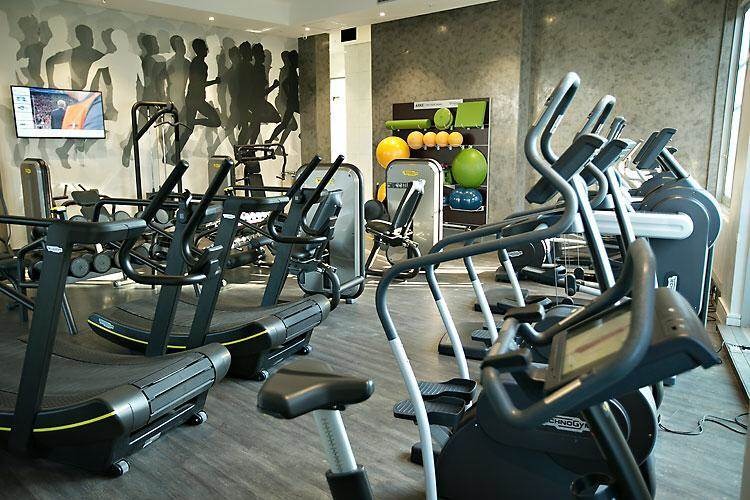 -A spacious fitness centre overlooking a tranquil garden, featuring state-of-the-art equipment and a free weight area