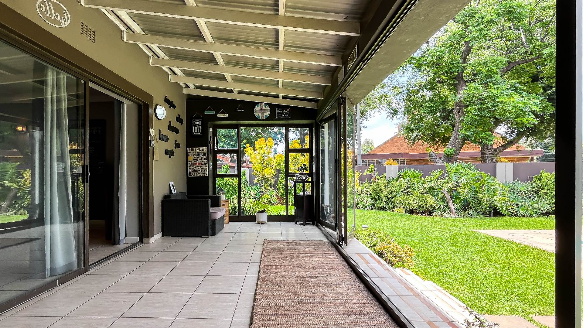 Covered, enclosed patio with stacking doors — perfect for year-round use