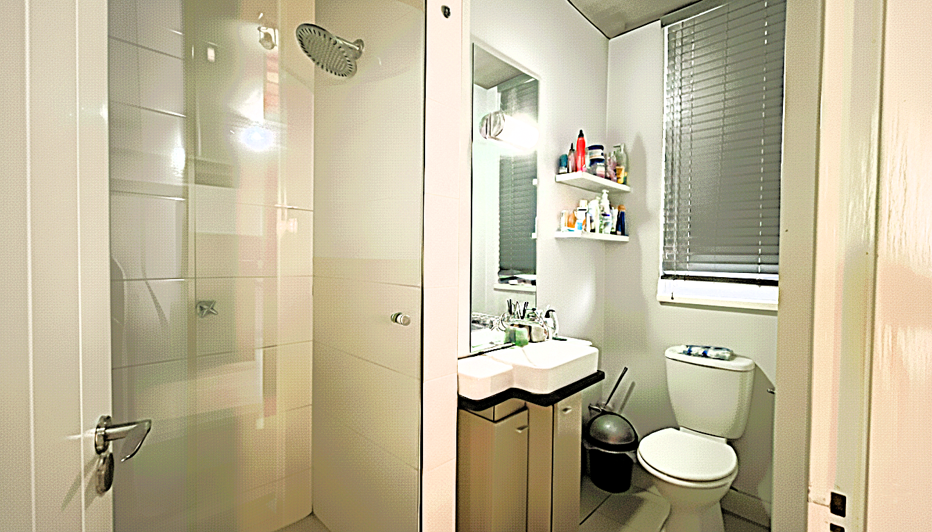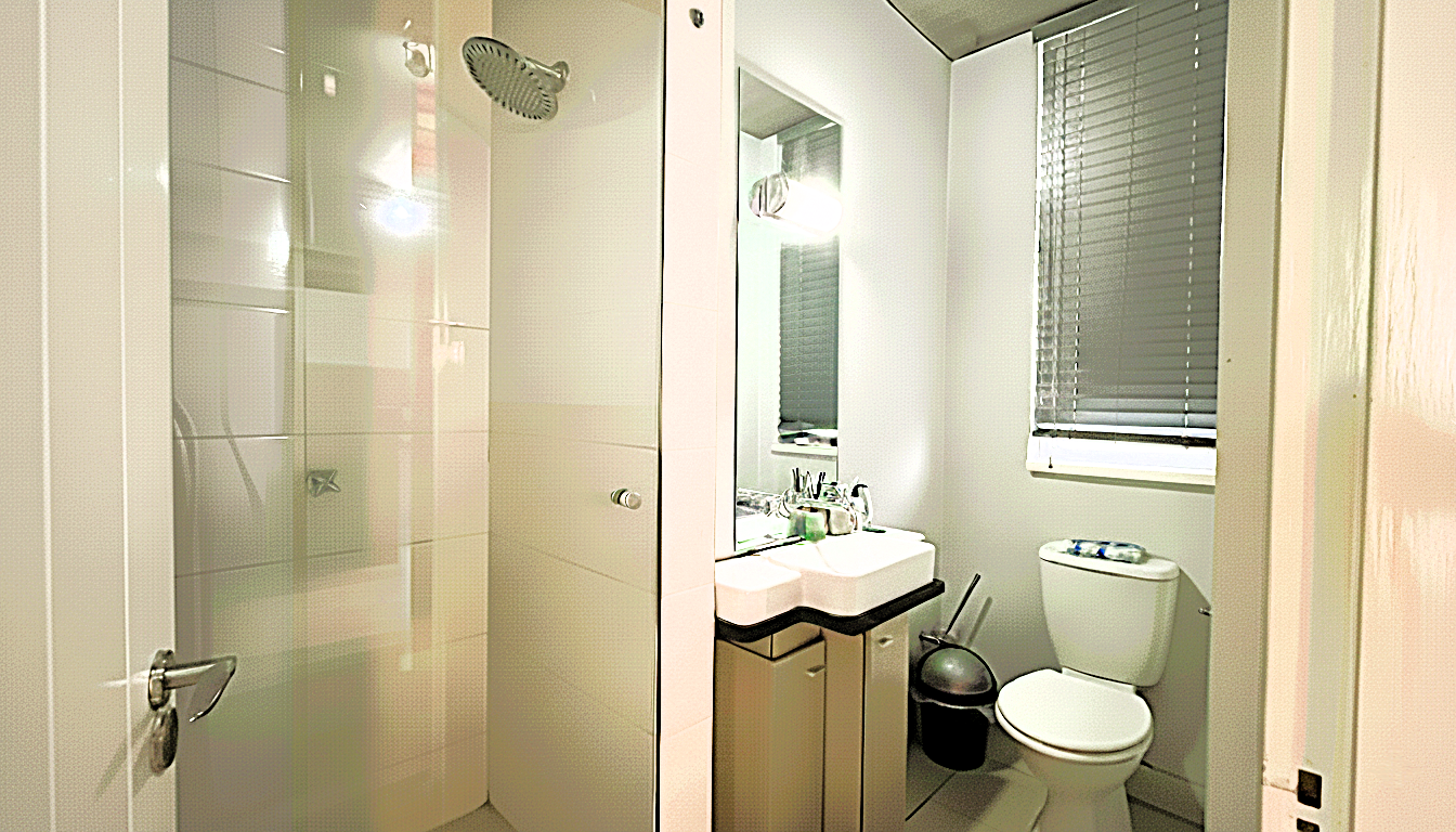 Comfortable Bedroom & Modern Bath: The bedroom offers built-in cupboards and laminated flooring, while the bathroom is sleekly finished with a shower, toilet, basin, and vanity.