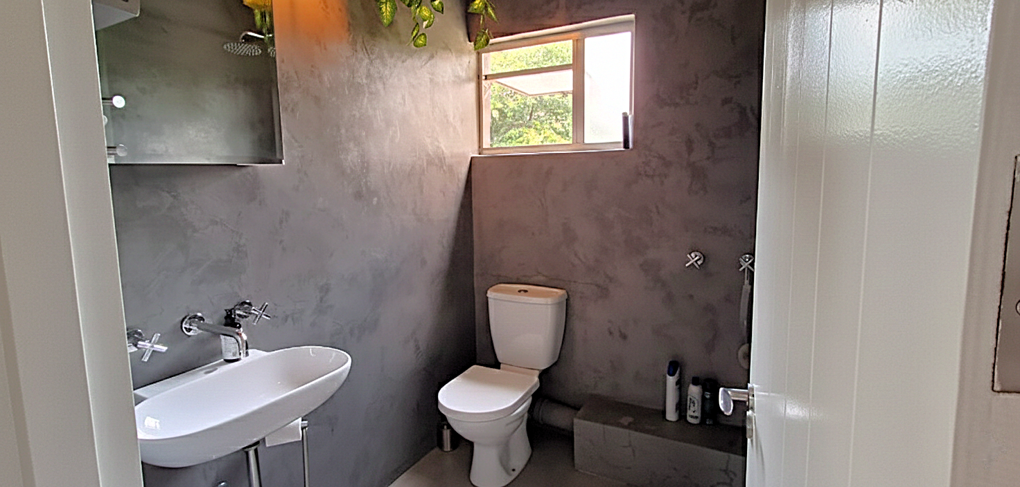 Bathroom / Wet Room: Basin, toilet, and frameless shower.